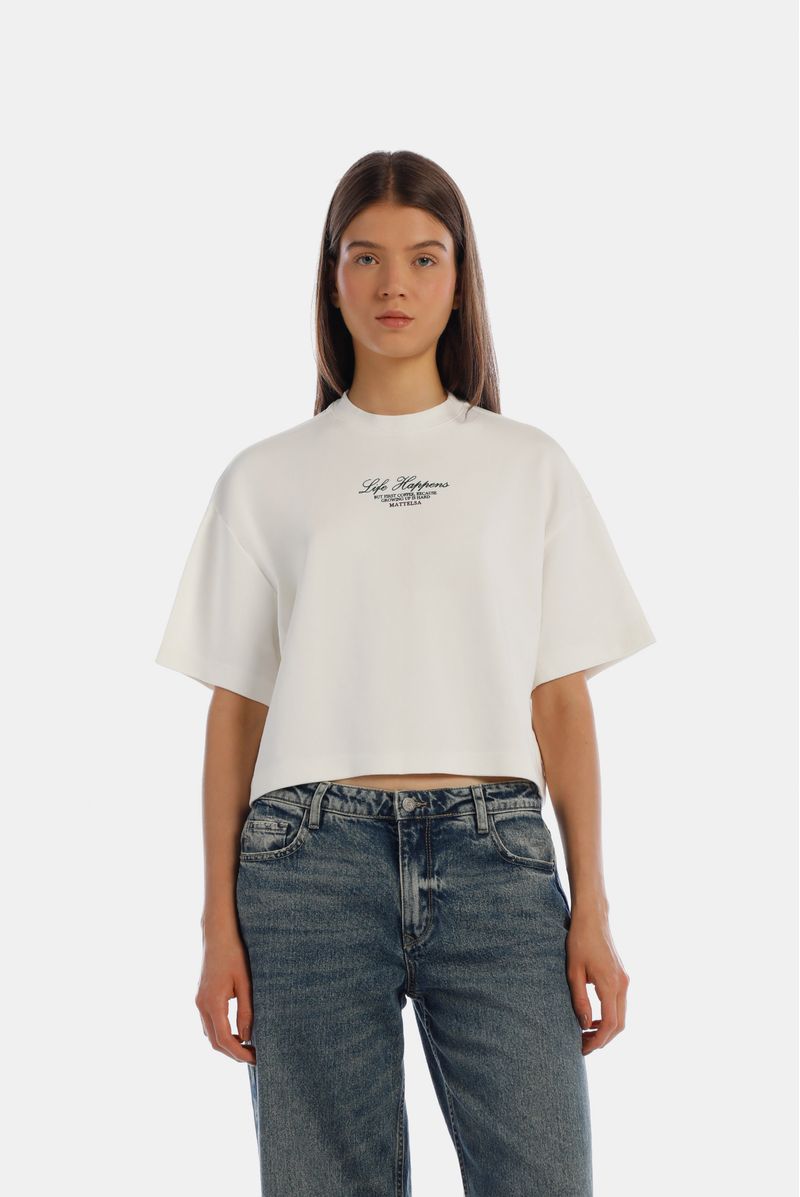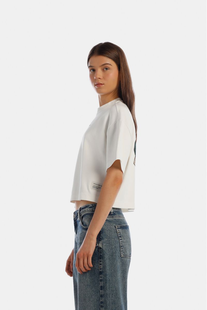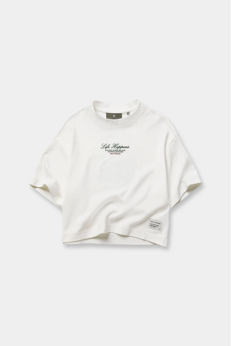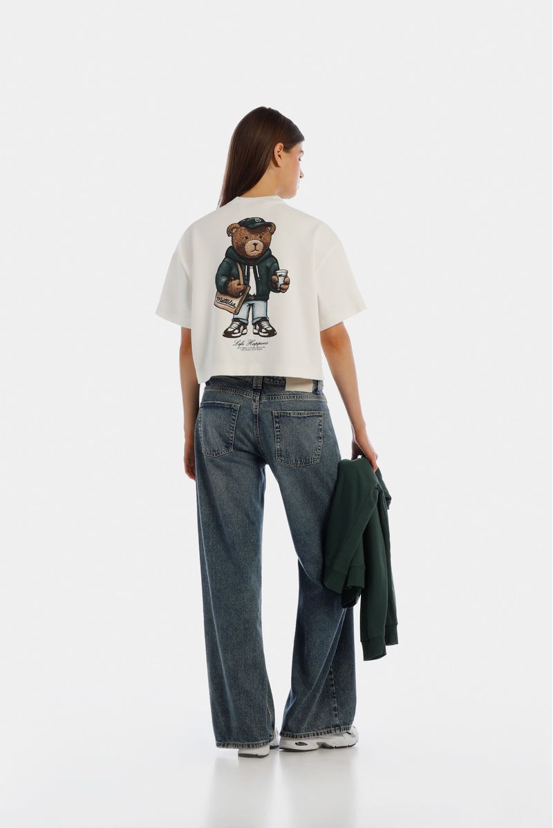 Camiseta marfil confeccionada en un de 325 gramos. Ilustración de oso en gran formato en espalda en estampación textil. Texto en delantero en plastisol en alta densidad. Banderín bordado en parte baja del delantero. Molde amplio, largo regular.
