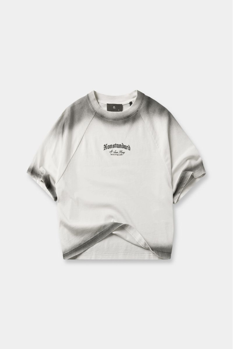 Camiseta manga ranglán con lavandería de efecto aerógrafo en los bordes, confeccionada en un Jersey de 250 gramos. Ilustración pequeña en el delantero y gran formato en el posterior, ambas estampadas en técnica plastisol en alta densidad .