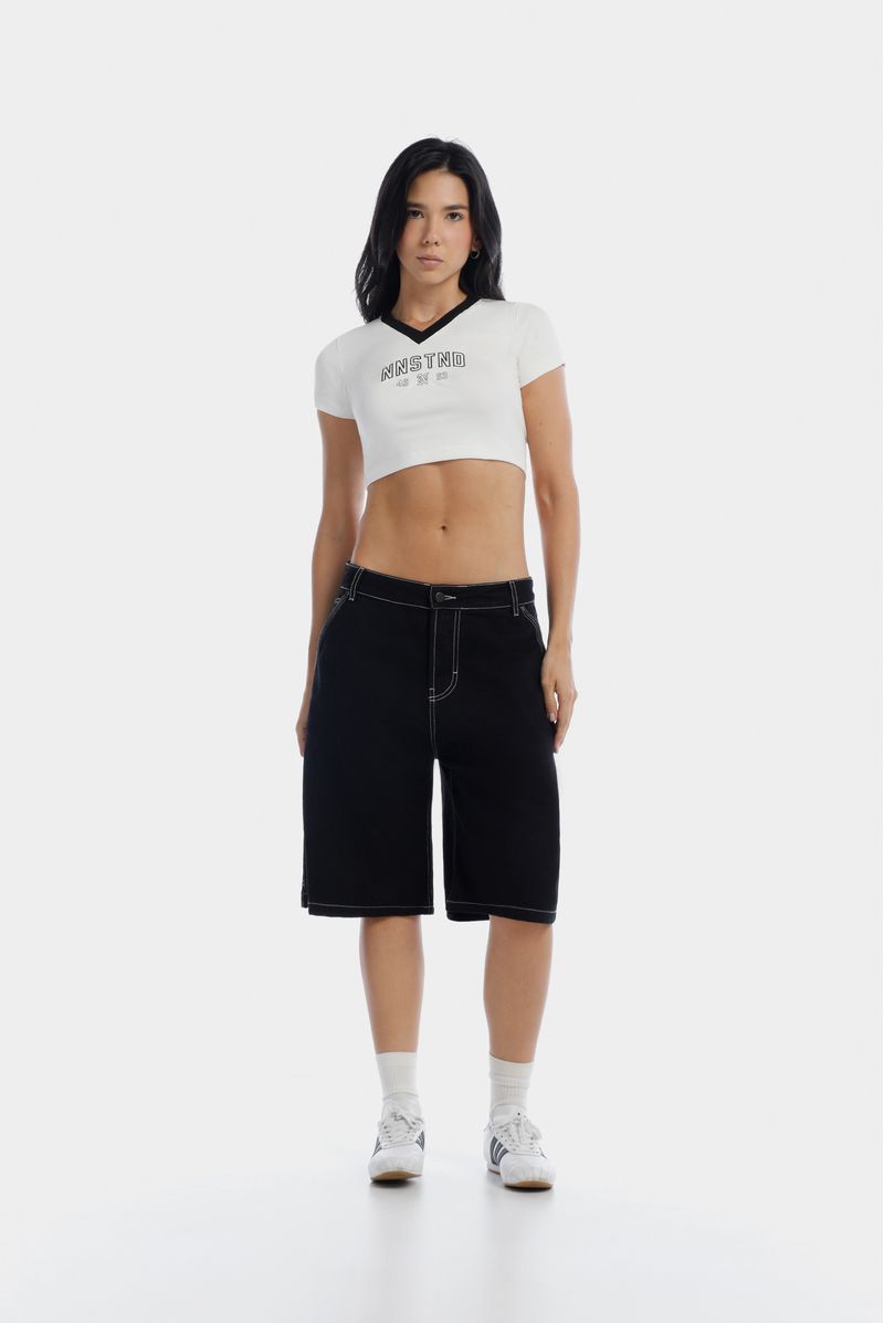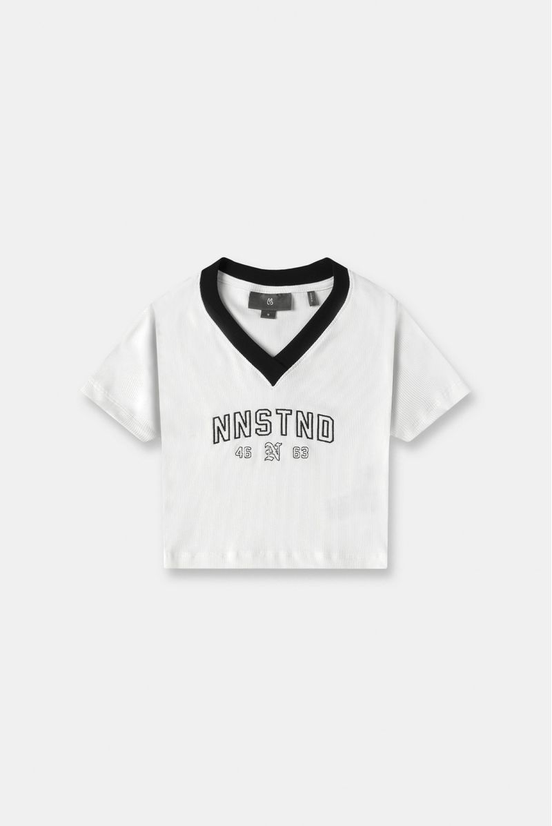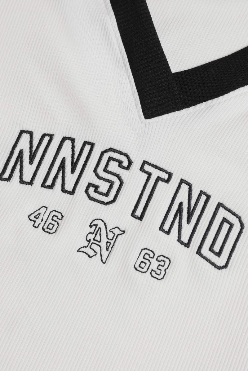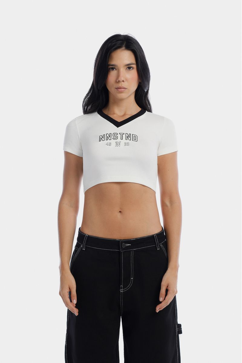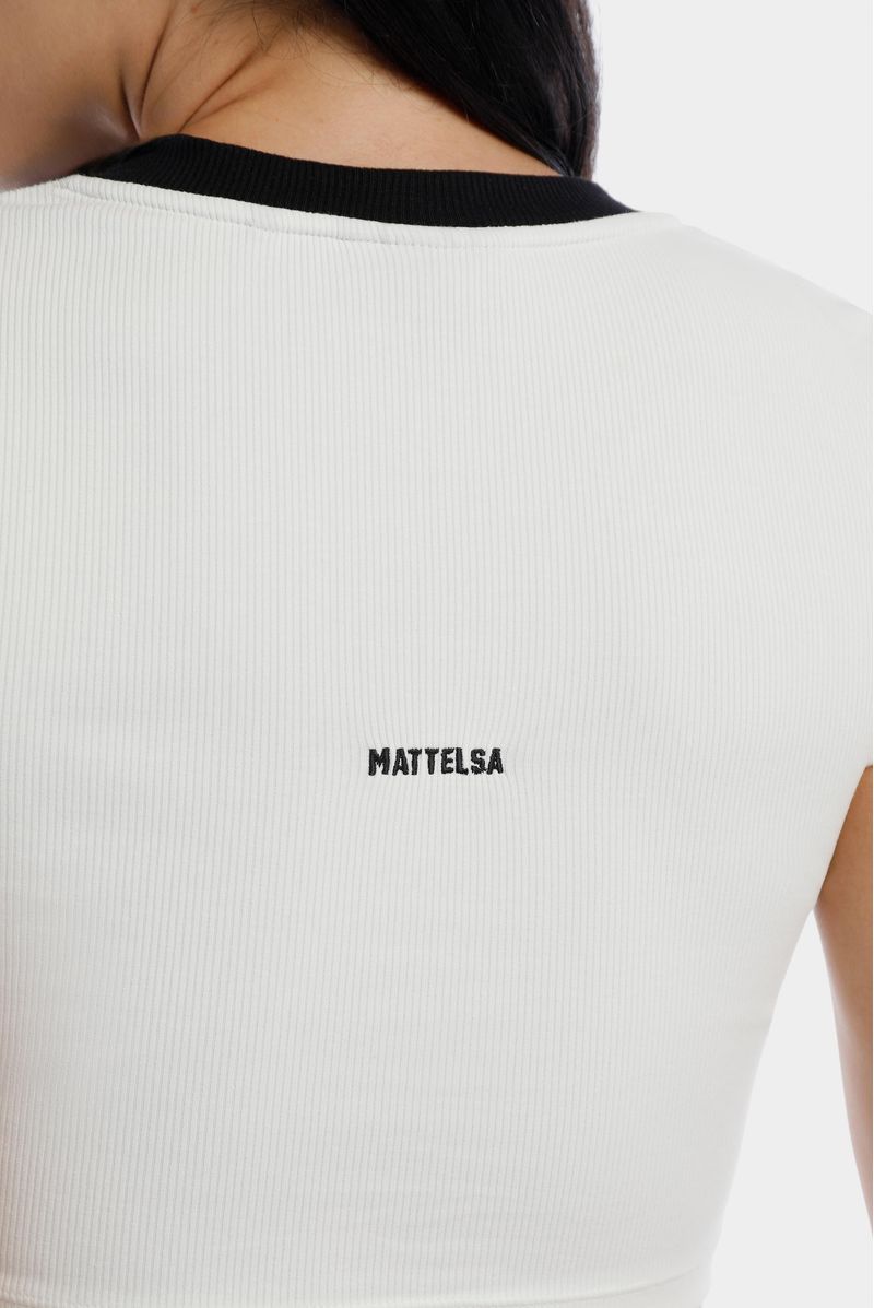 Top marfil con cuello en contraste color negro confeccionado en un rib de 270 gramos. Texto bordado color negro en delantero y en posterior.