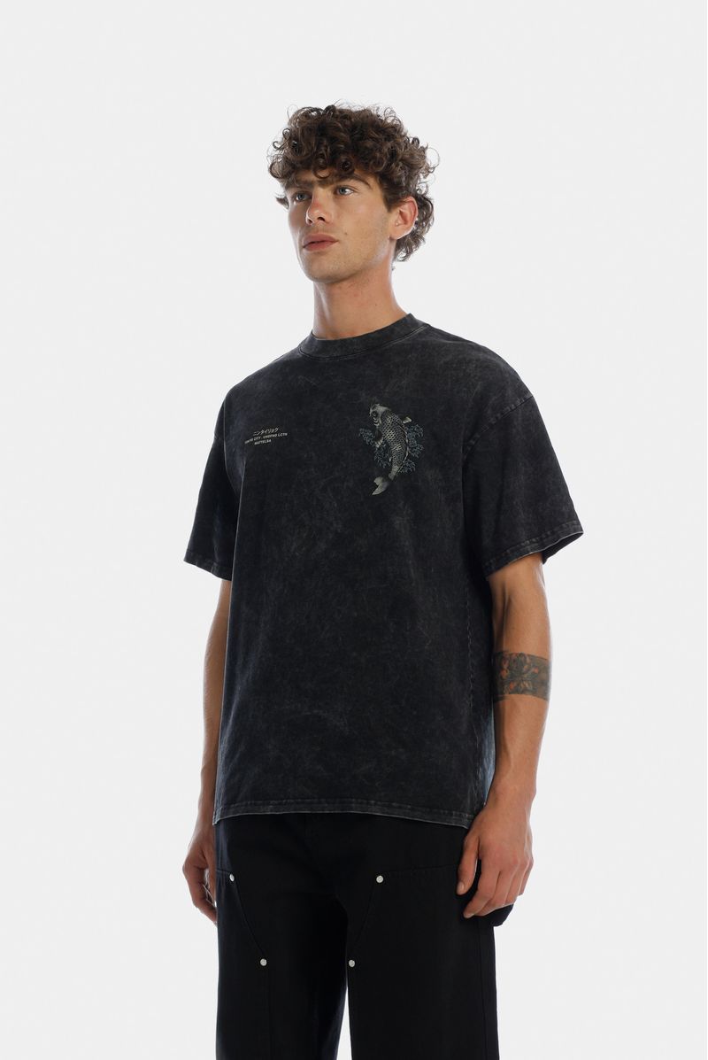 Camiseta Over confeccionada en un Jersey Premium de alto gramaje, con un peso de 250gr, la camiseta lleva lavandería tipo acid wash negro y estampación en frente y espalda combinado 2 técnicas corrosión y alta densidad para el texto.
