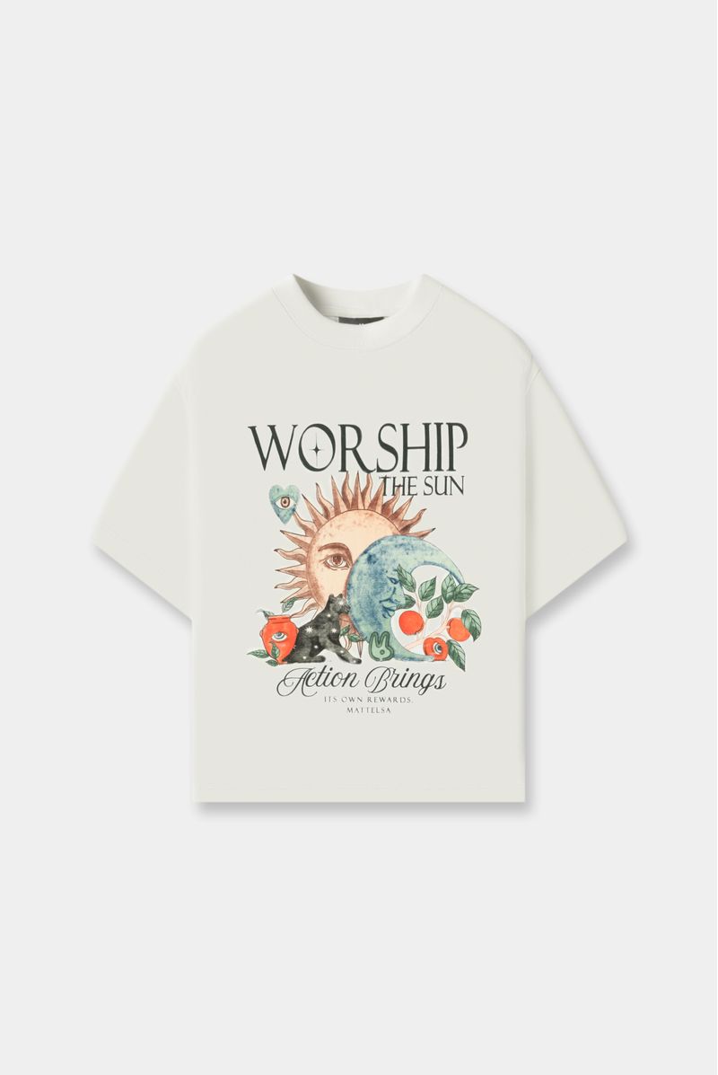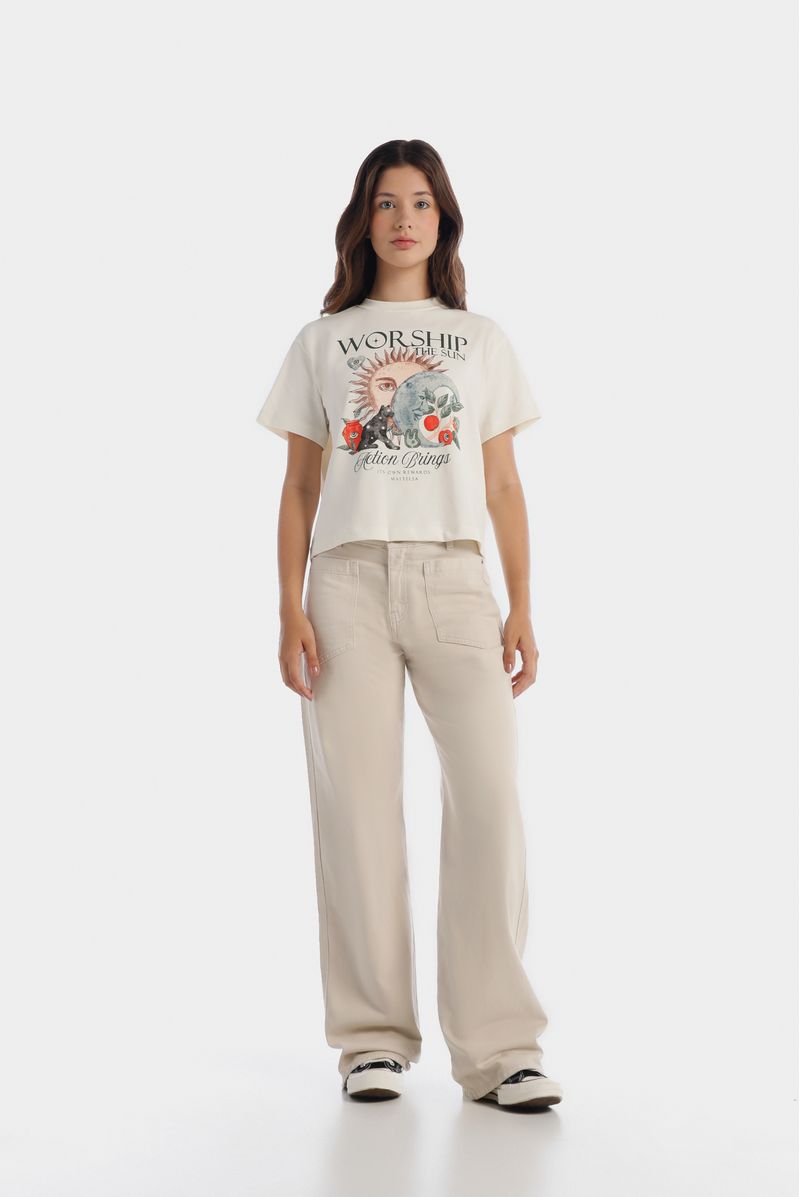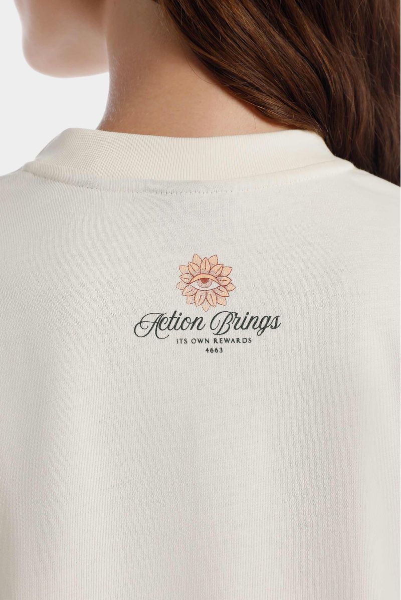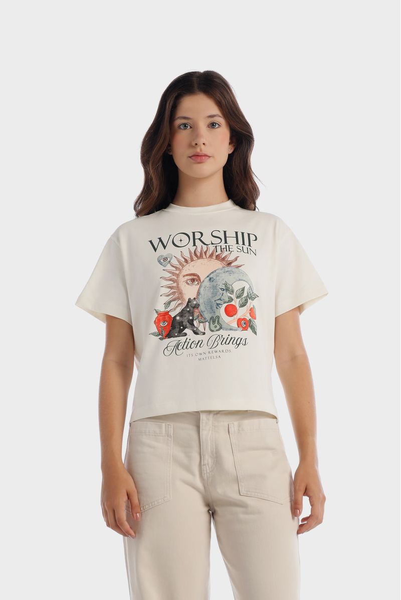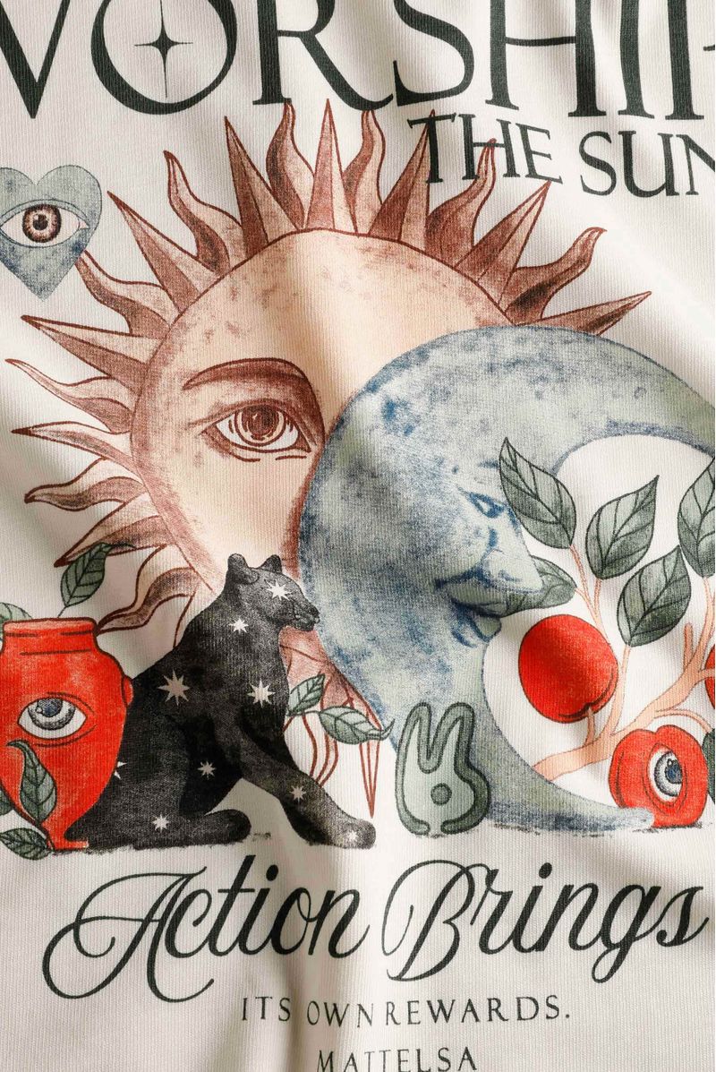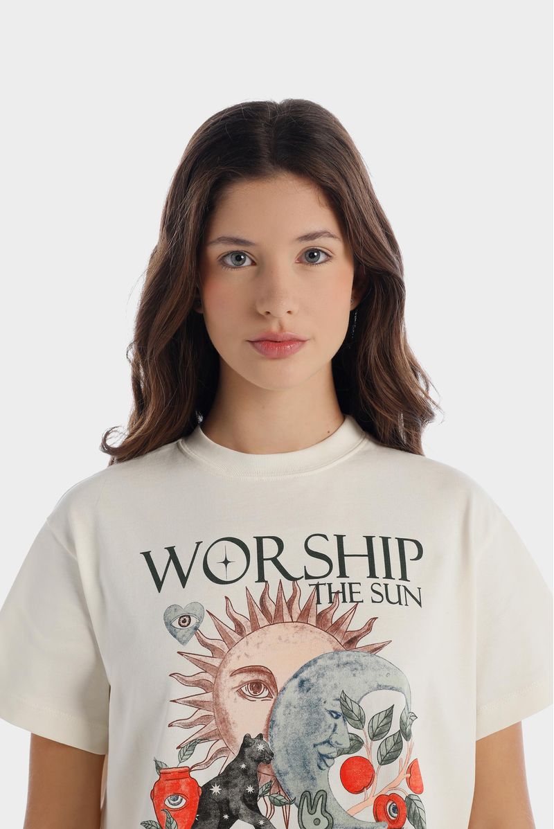 Camiseta marfil confeccionada en un jersey de 240 gramos. Ilustración esotérica de frente y espalda estampadas en técnica de estampación textil. Cuello en rib.