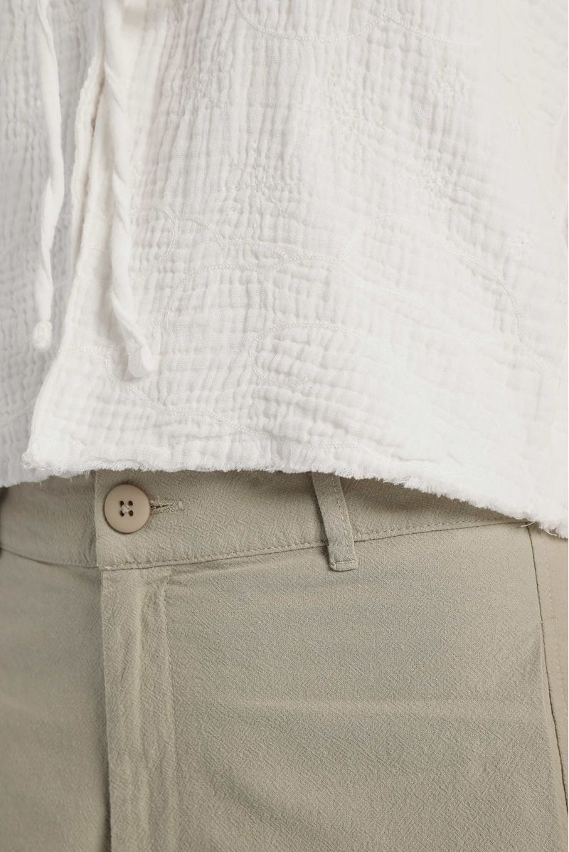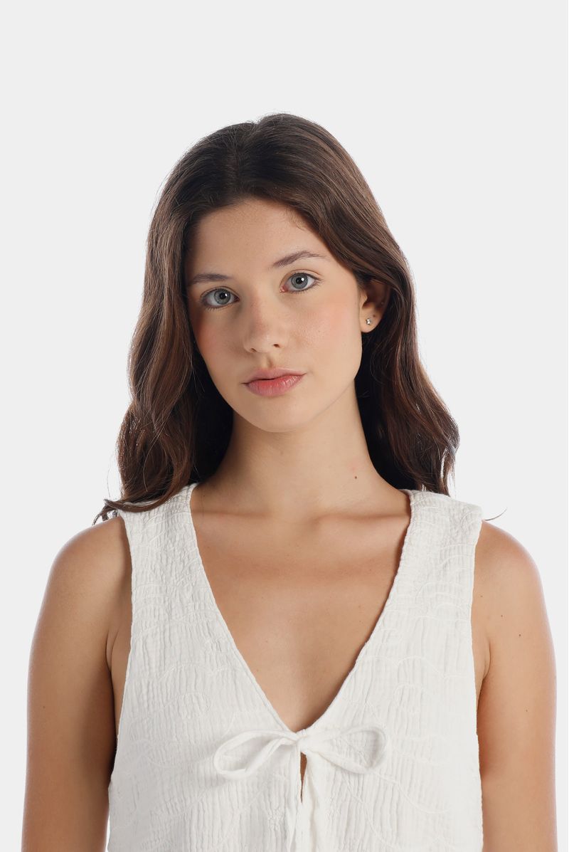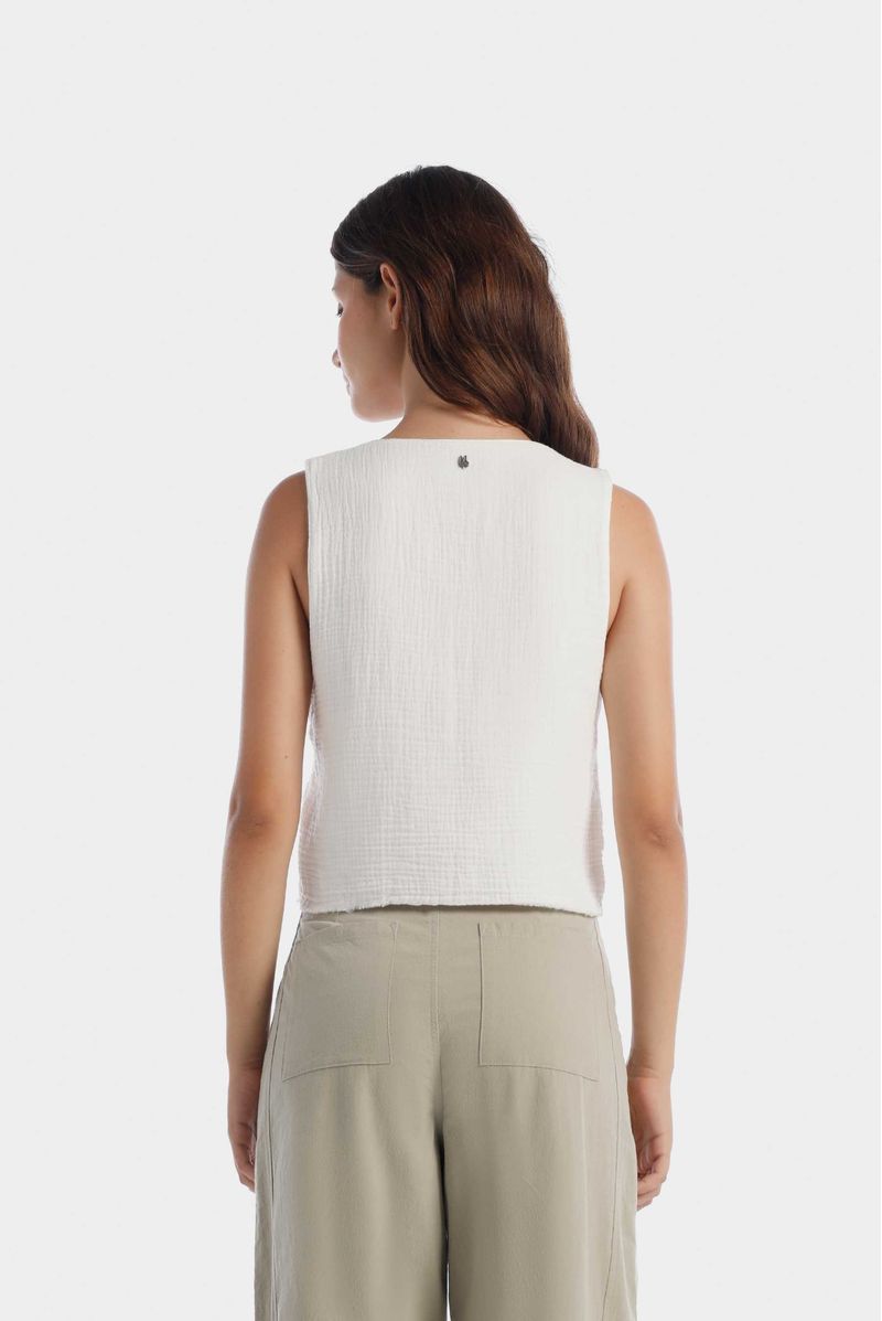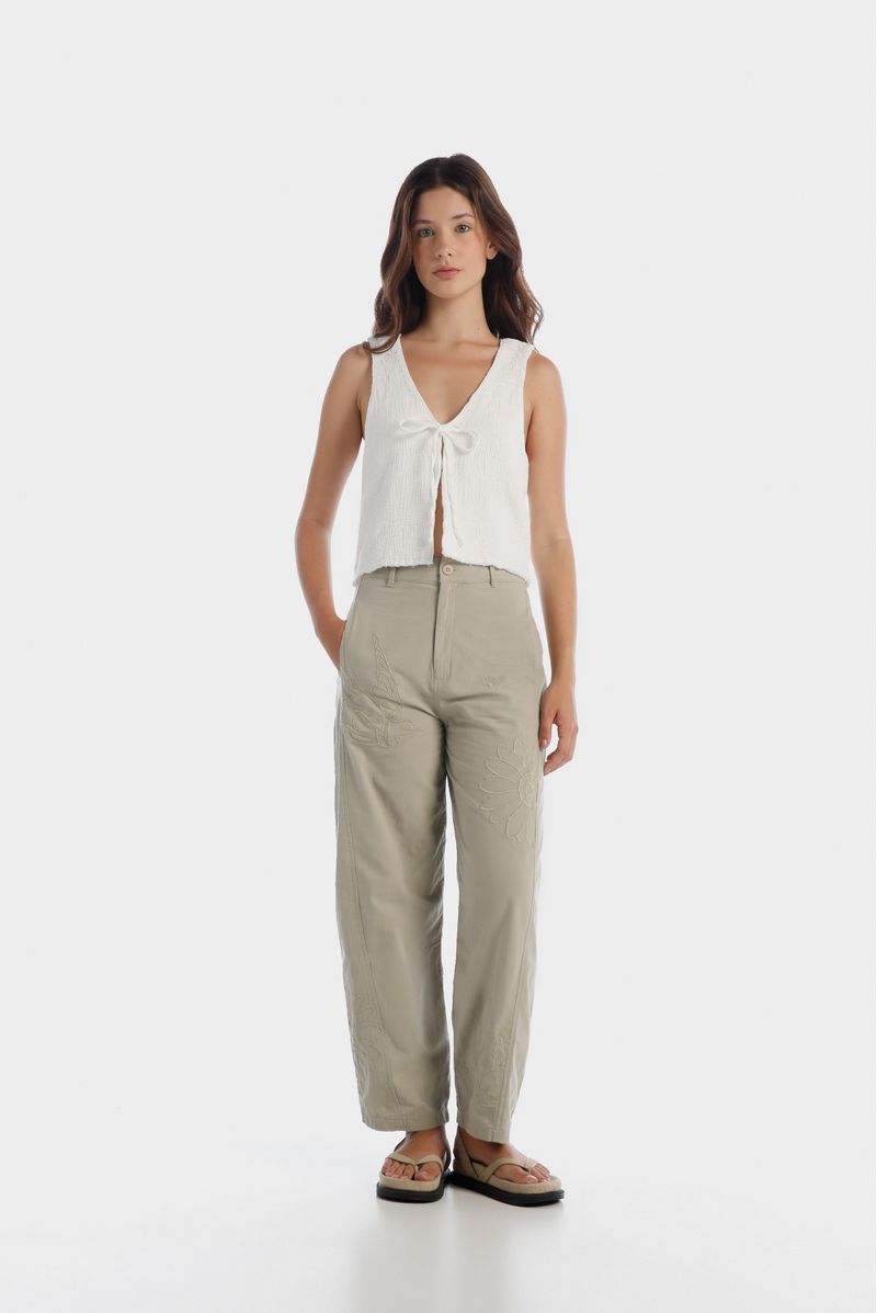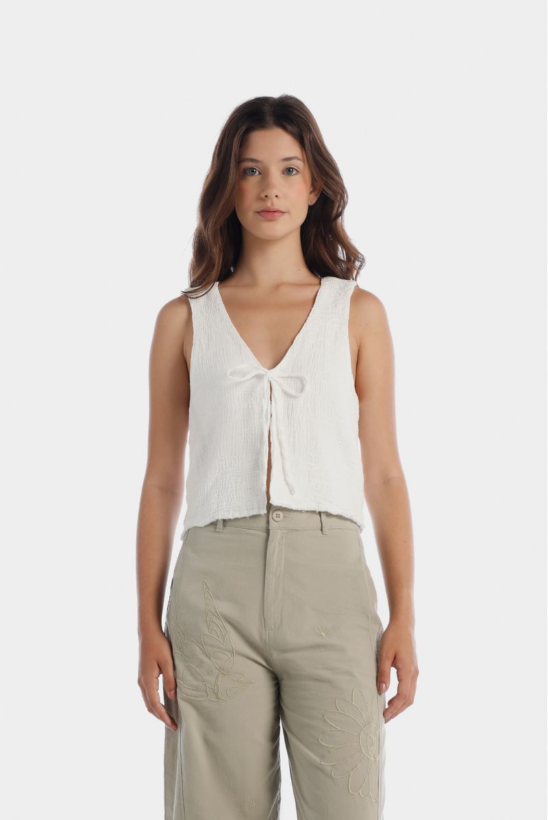 Chaleco marfil confeccionado en un tejido plano de tacto suave. Todo el delantero es bordado en un fondeo oriental en hilo a tono con la base textil. La terminación de los ruedos es al corte. Prenda ajusta en pecho con sesgos que se amarran.