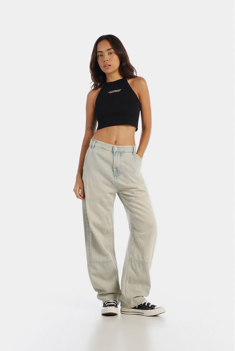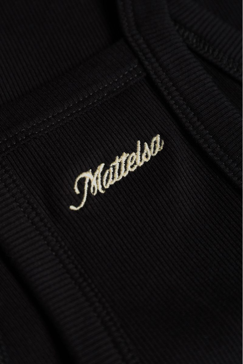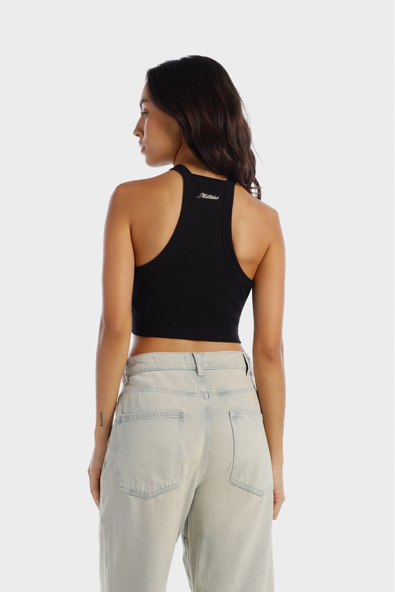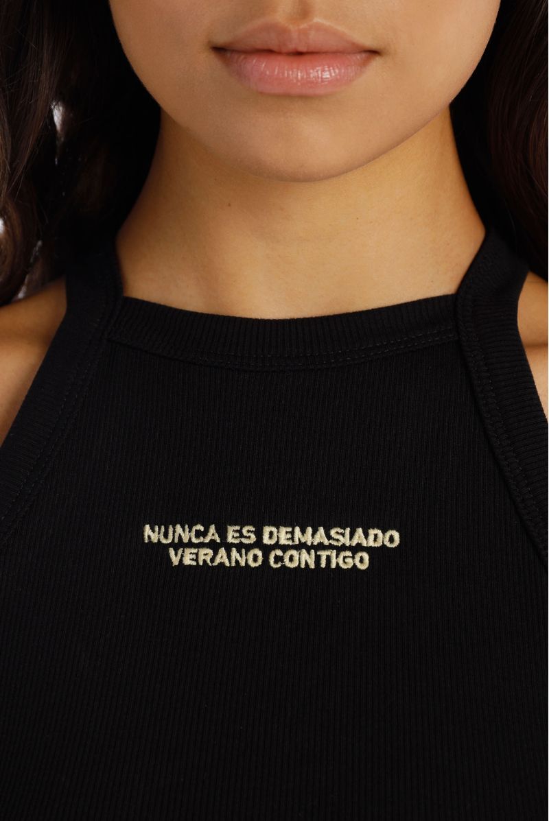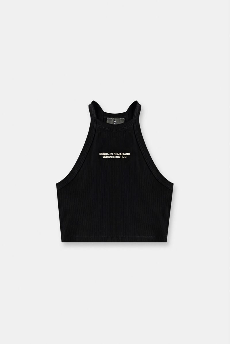 Top negro confeccionado en rib 2x2 de 280 gramos. Presenta escote tipo halter y lleva texto bordado en el centro del pecho y en el posterior, ambos en color amarillo.