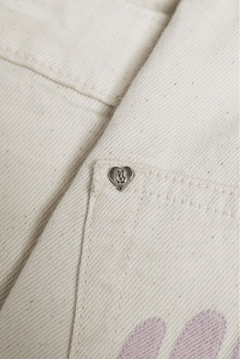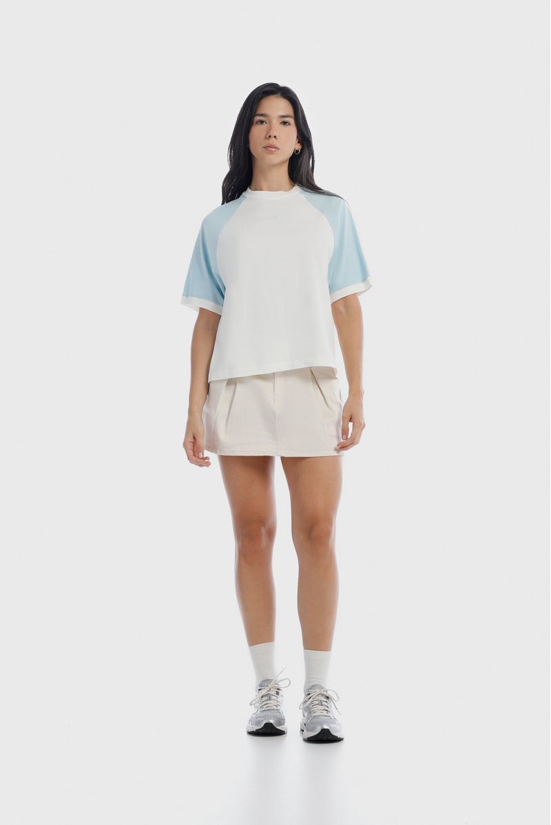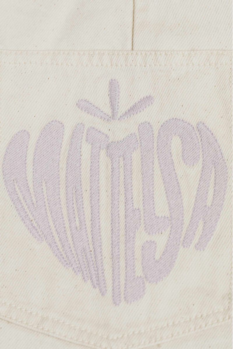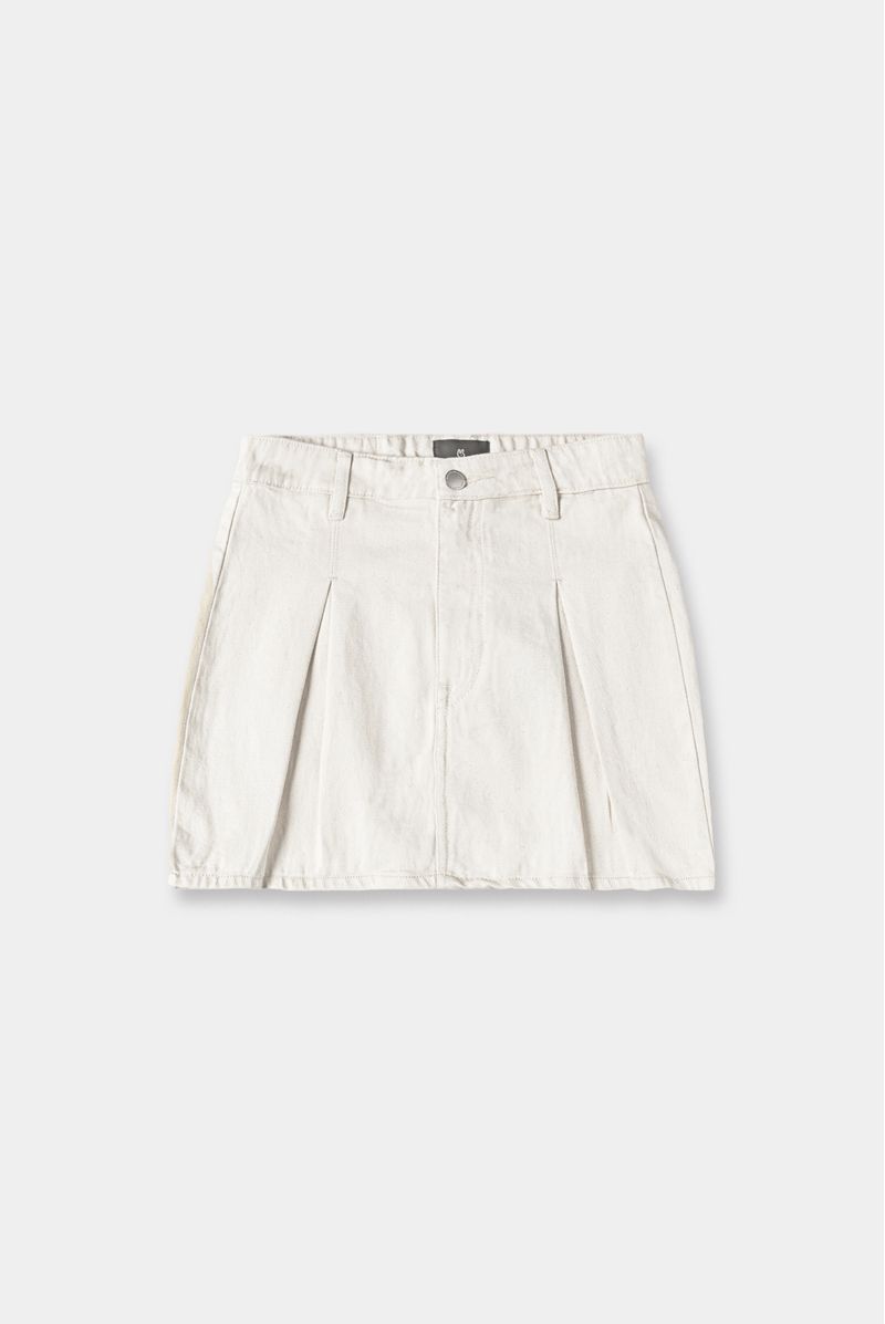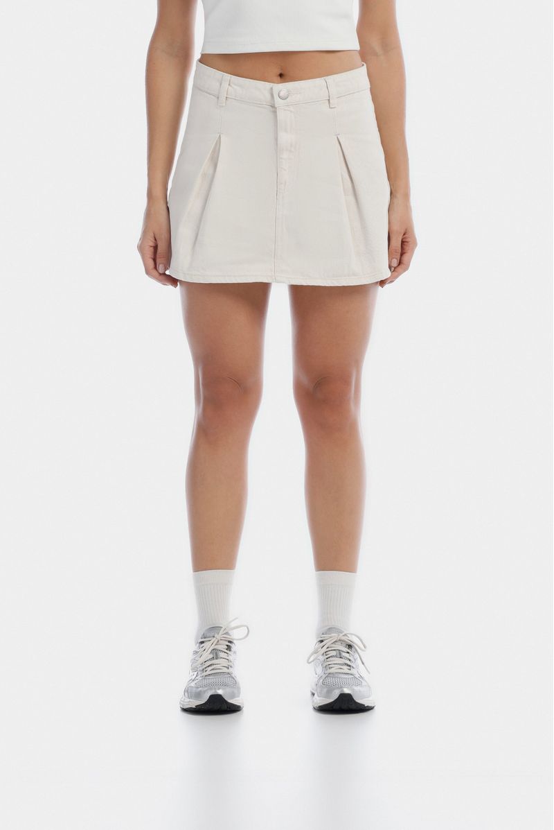 Minifalda marfil, confeccionada en drill 100% algodón premium, 11,5 oz. Diseñado con prenses delanteros que generan volumen y vuelo. Bolsillo con bordado lila en posterior.
