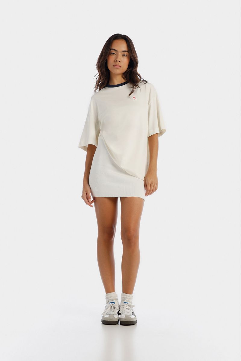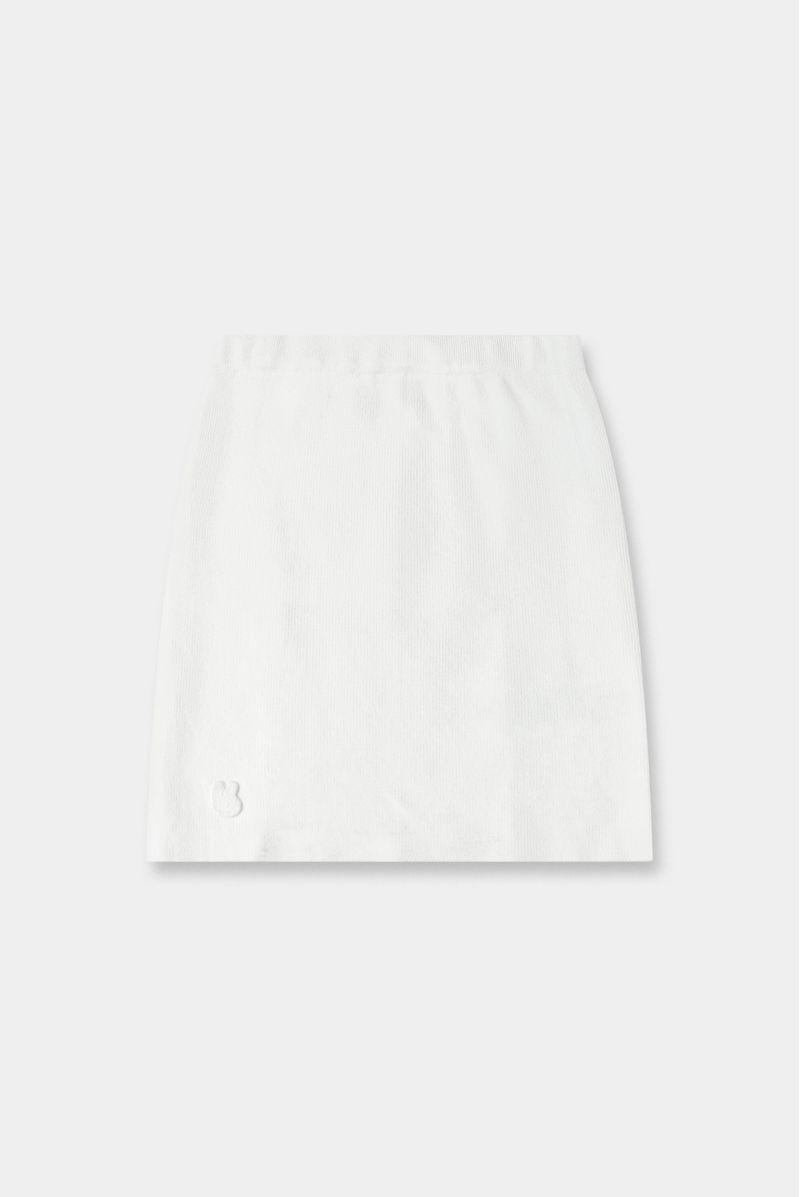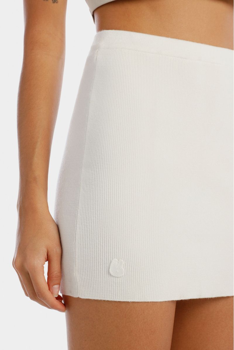 Falda ajustada en silueta tubo. Está tejida en un patrón que simula la textura del rib. Lleva un aplique de conejo ubicado en la esquina del ruedo izquierdo.