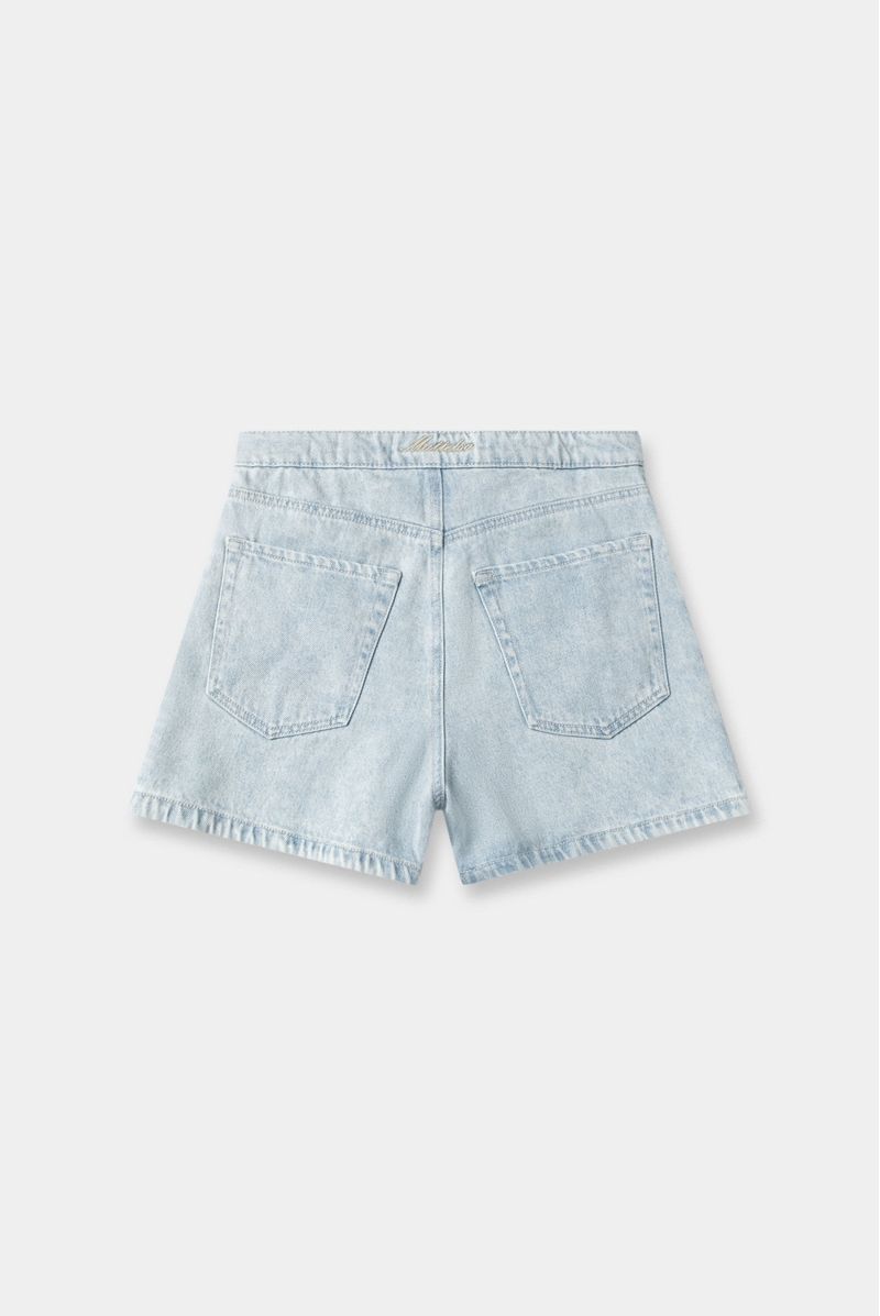 Falda short lavandería azul claro, confeccionada en tela premium 50% algodón y 50% Lyocell de 12 oz, diseñada con tapa diagonal en delantero, bolsillos en costados y posterior, cierre y botones en delantero. Lleva detalle bordado en pretina posterior