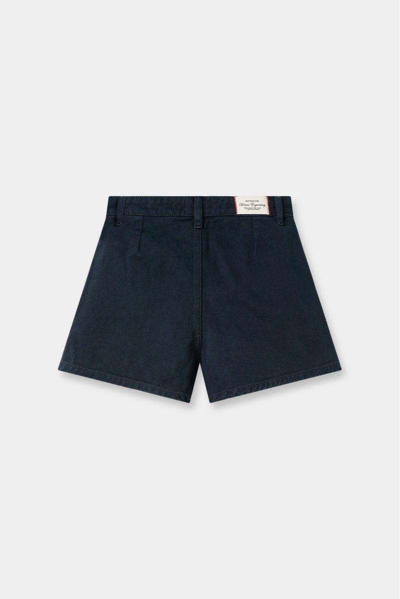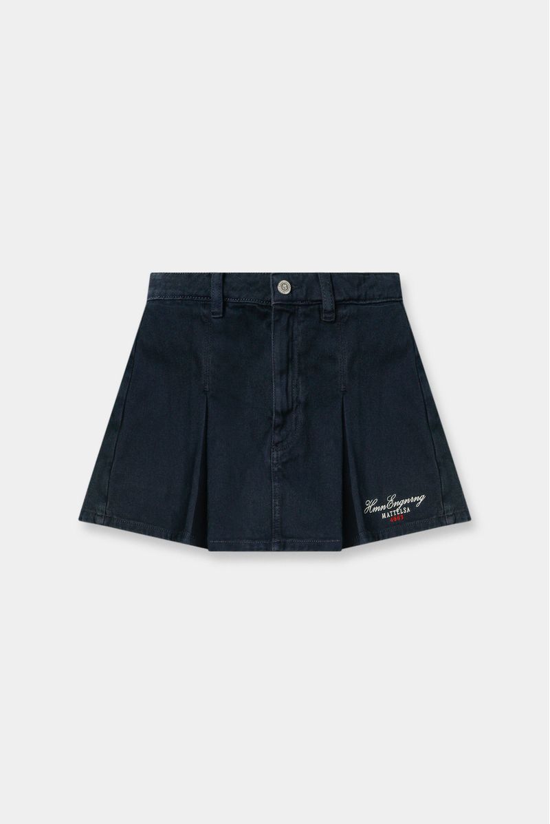 Mini falda short confeccionada en drill 100% algodón de 9 oz, diseñado con dos tablas en el frente, cierre y botón, y posterior con pinzas. Lleva texto bordado en delantero y banderín e insumos contramarcados.