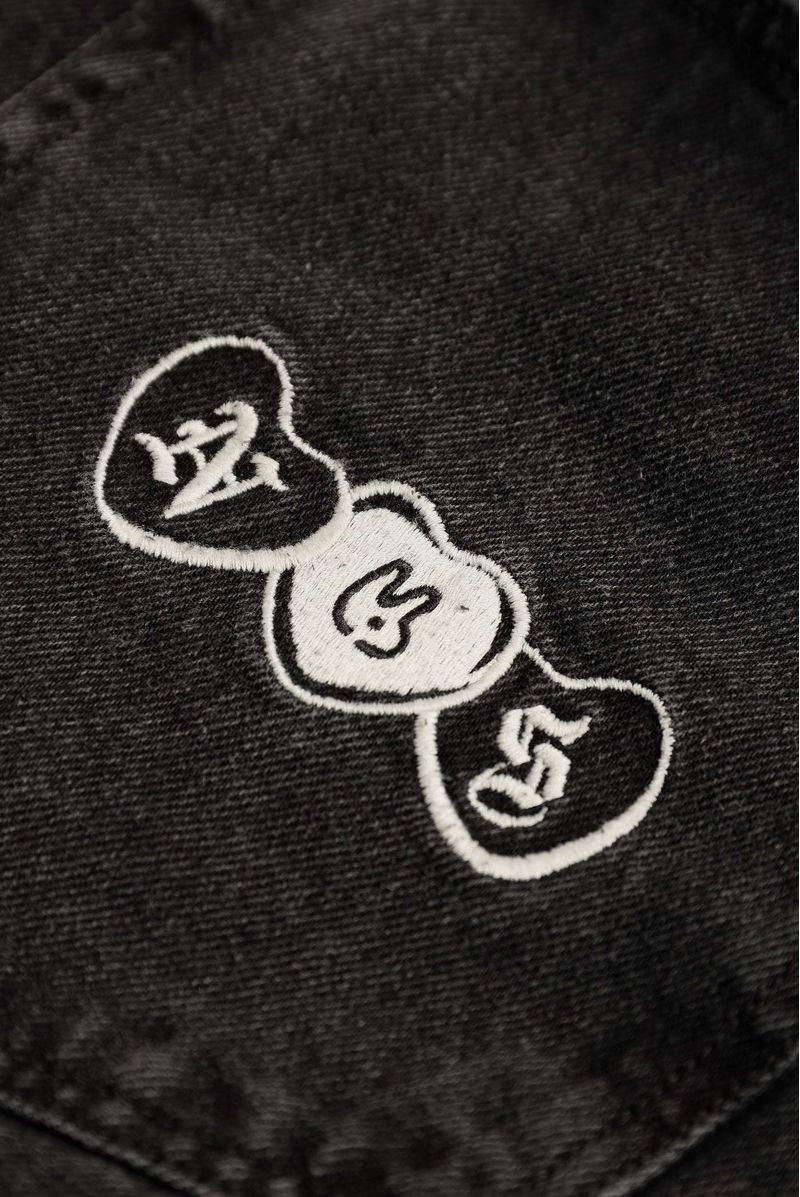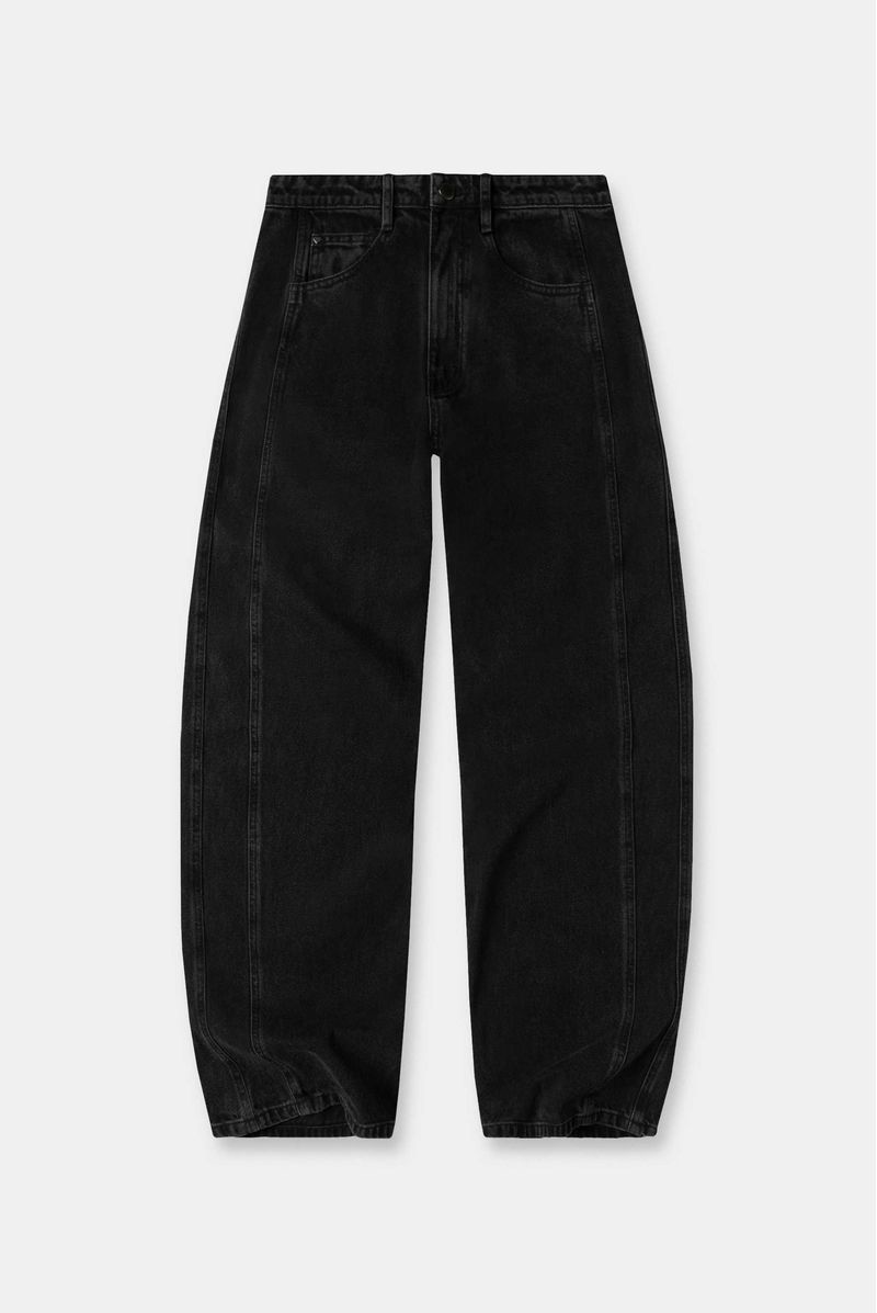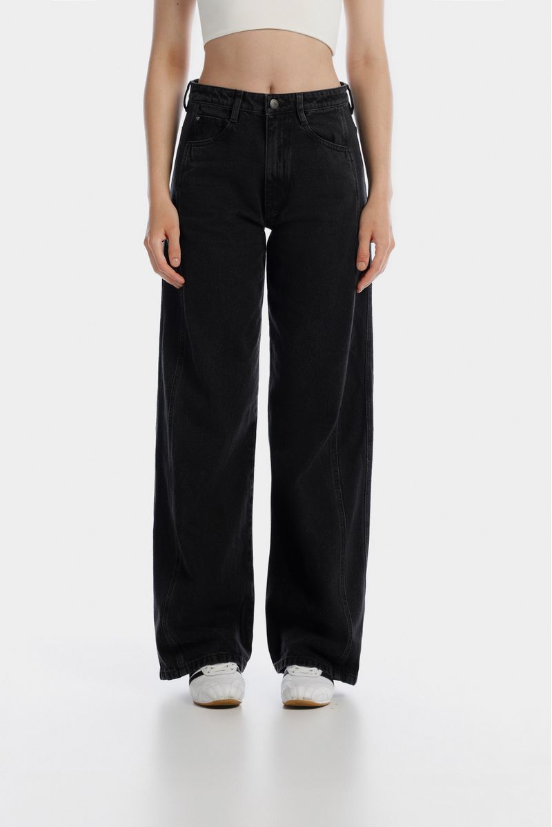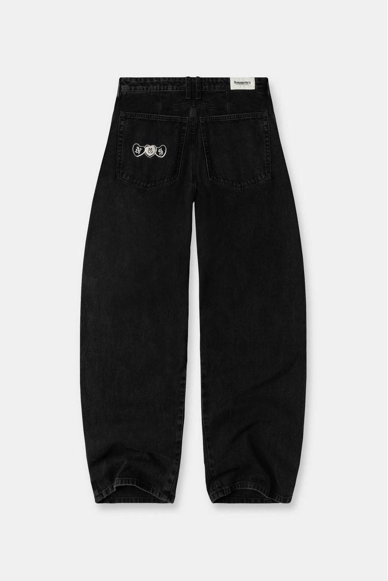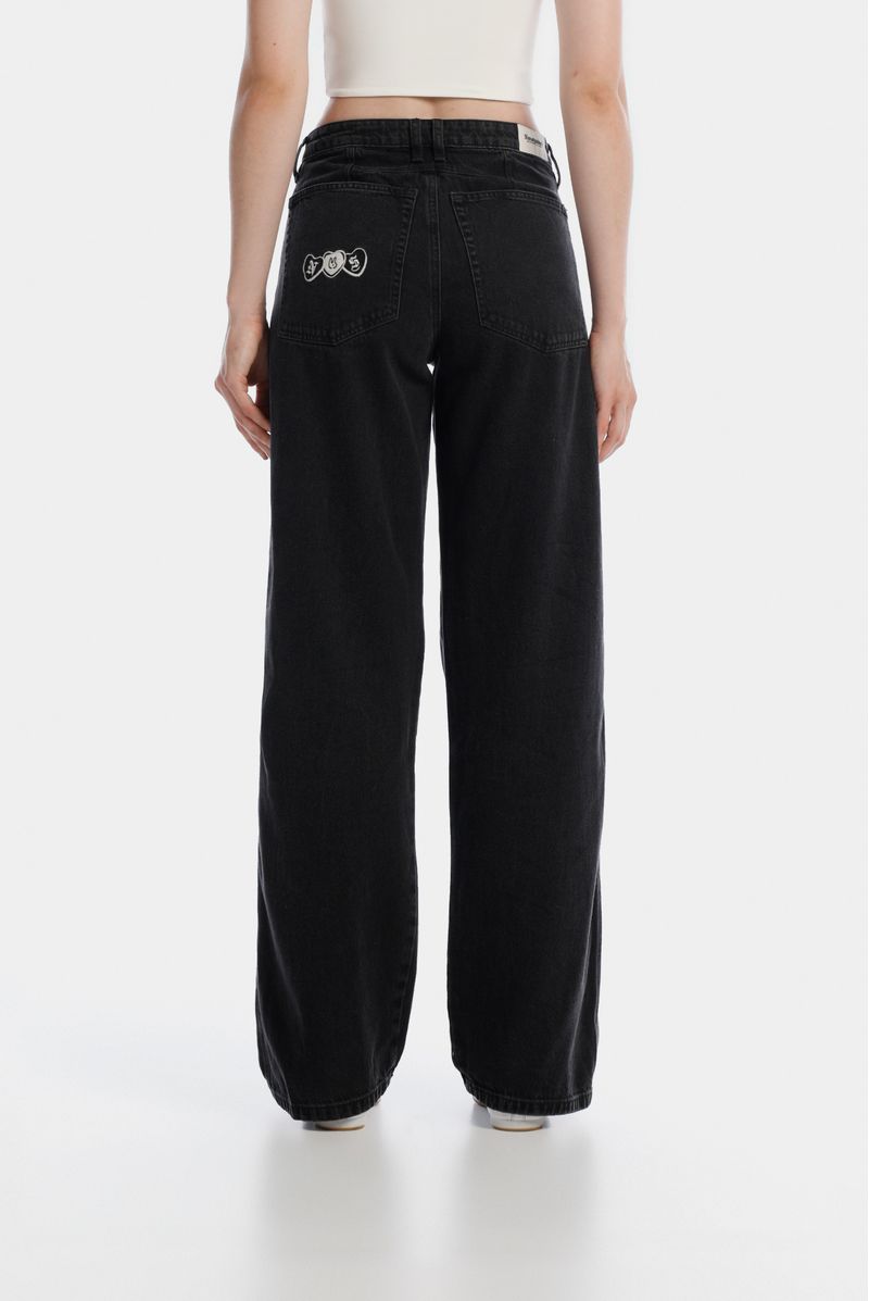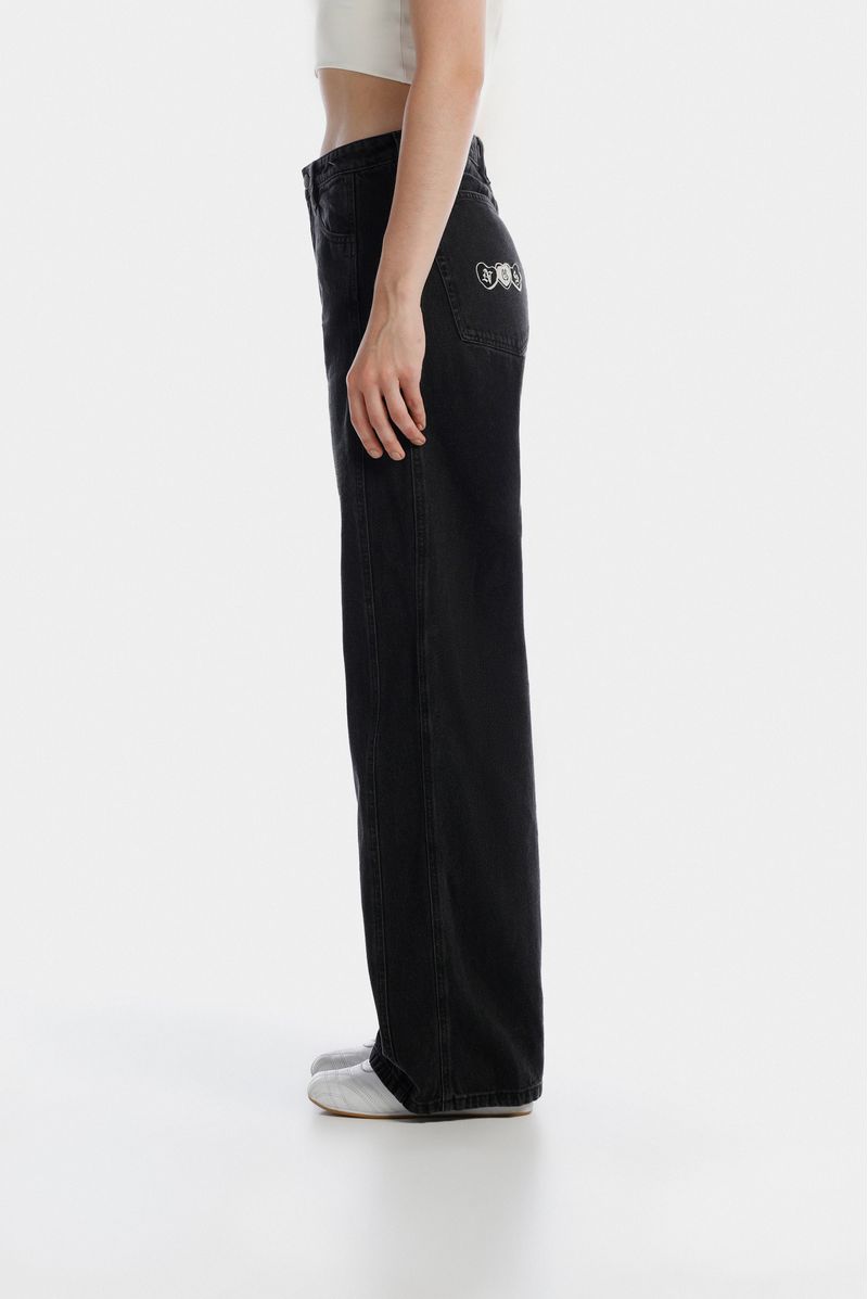 Jeans barrel negro, confeccionado con denim 100% algodón premium, de 10,5 oz. Diseñado con estética cinco bolsillos. Tiene detalle bordado de corazones en bolsillo izquierdo posterior y banderín garra en pretina.