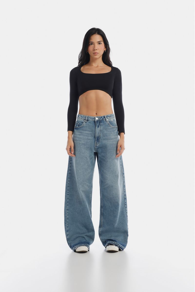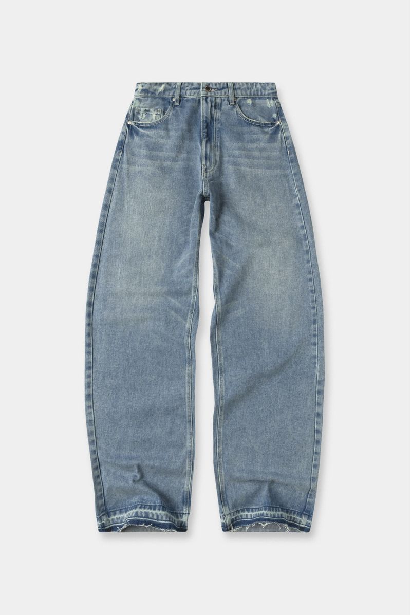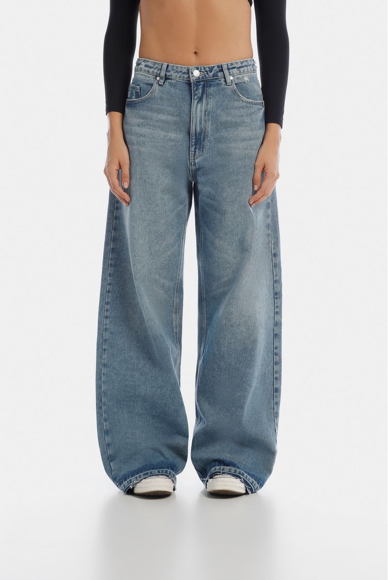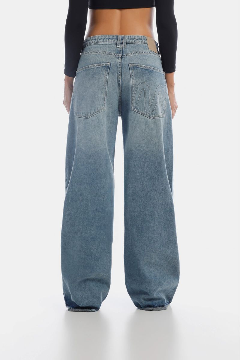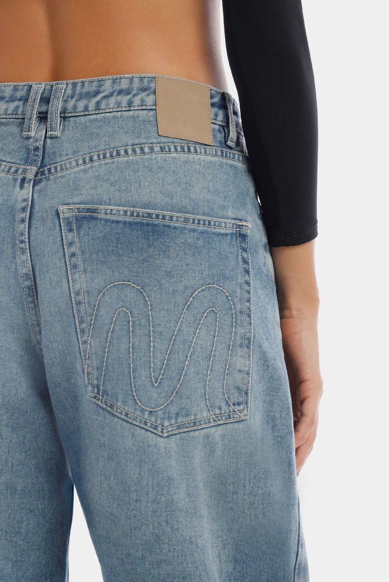 Jeans Barrel azul medio, tiro medio de 11,6oz. Diseñado con estética cinco bolsillos, ruedo desdoblado que genera reservas, proceso de manualidades marcadas como bigotes y chevrons localizados. Lleva insumos contramarcados.