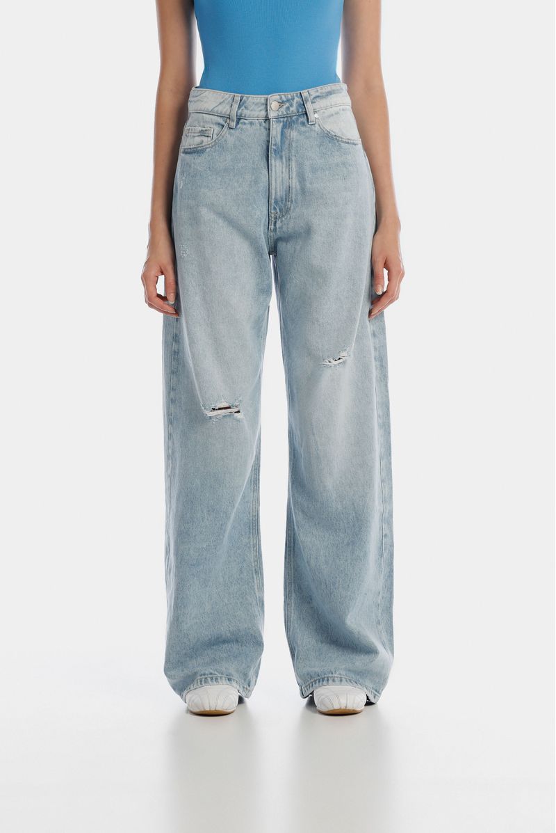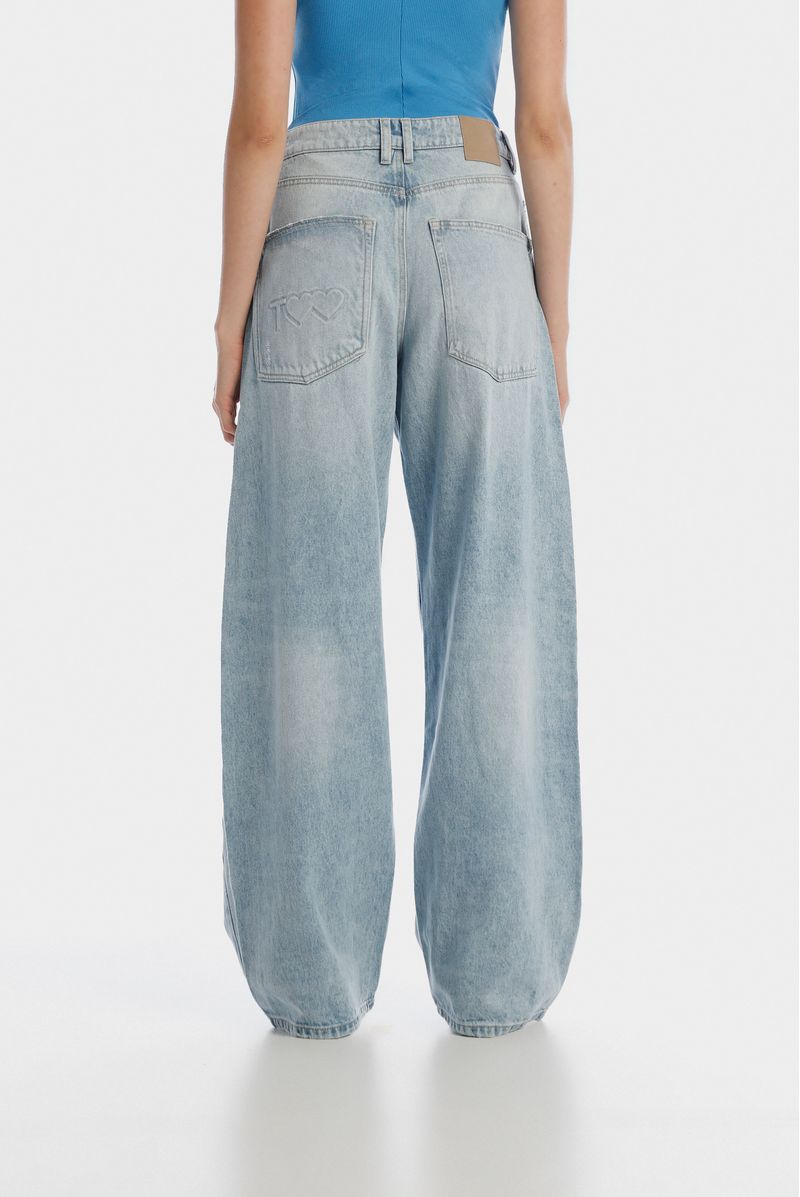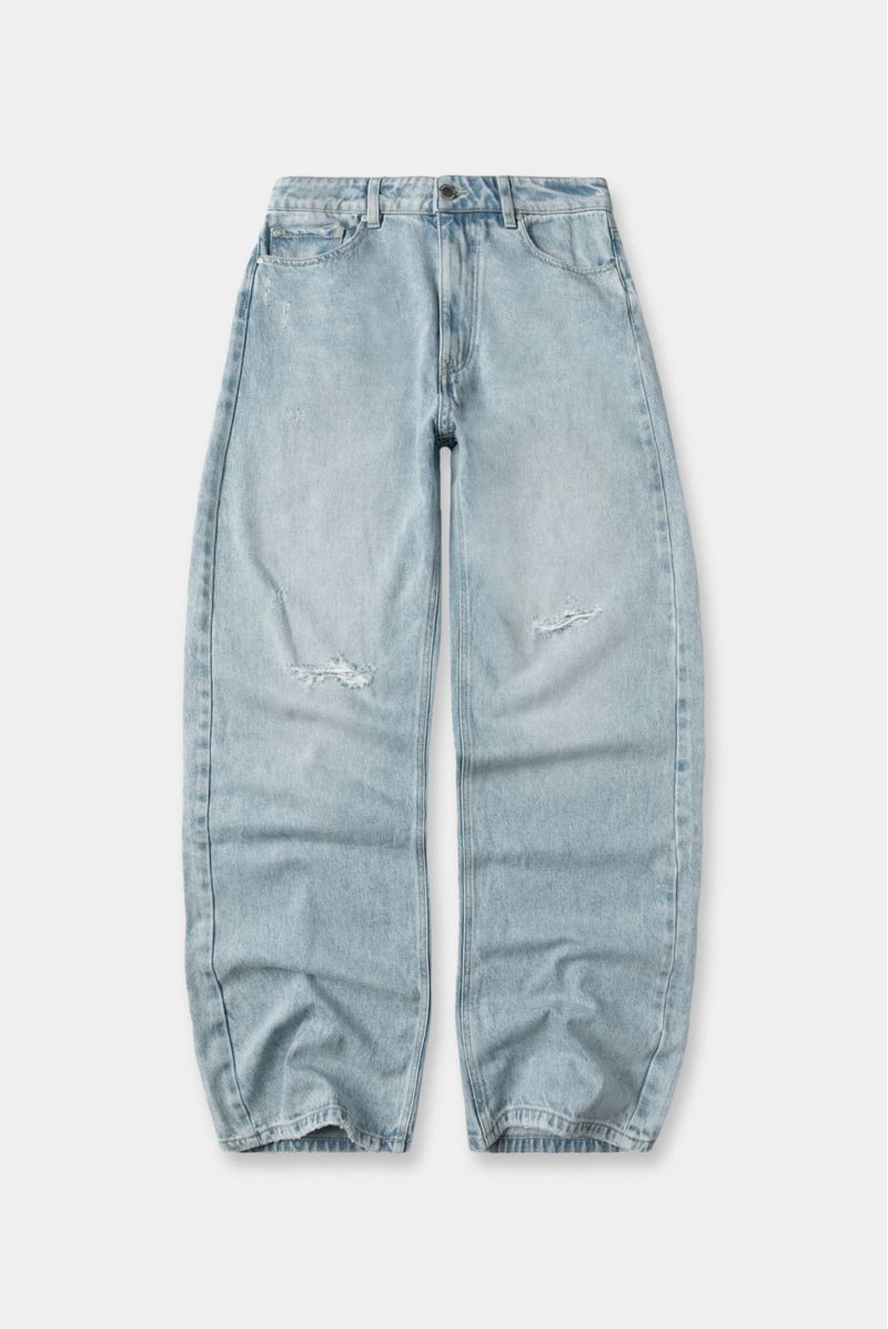 Jean fit barrel azul claro, tiro medio, confeccionado en tela 50% algodón 50% lyocell, de 12 OZ. Diseñado con cinco bolsillos, pequeños destroyed a la altura de rodilla, repujado en bolsillo posterior izquierdo y pretina interna. Lleva insumos contramarcados.