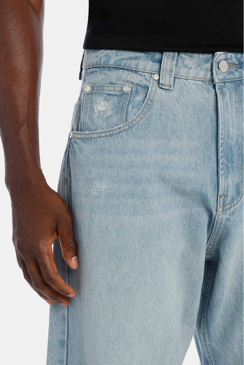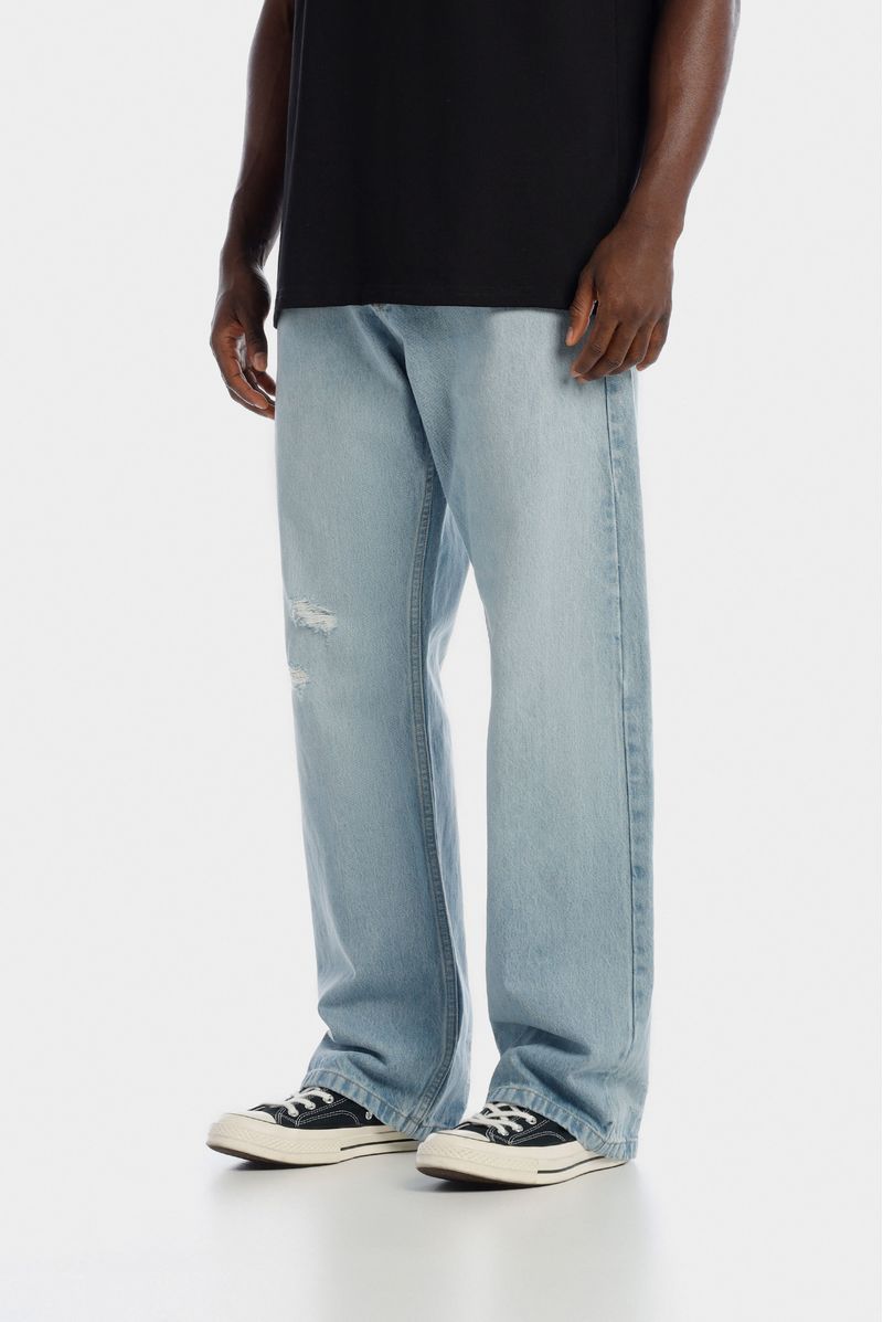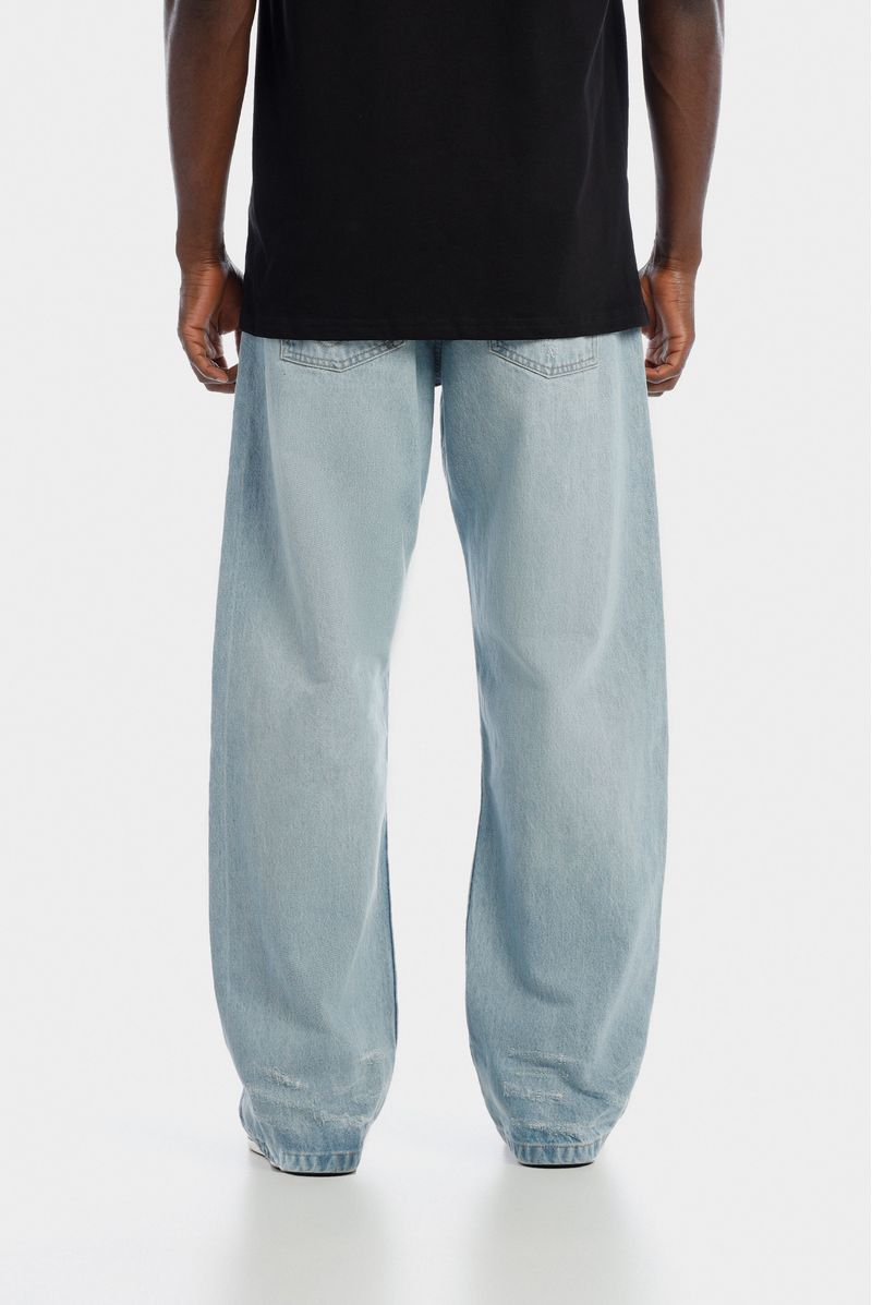 Jean fit baggy, azul claro, confeccionado en denim 100% algodón premium, 11,5oz. Diseñado con estética cinco bolsilos, destroyeds localizados, bigotes y sandblast que crean iluminación en el jean. Lleva insumos cotramarcados.