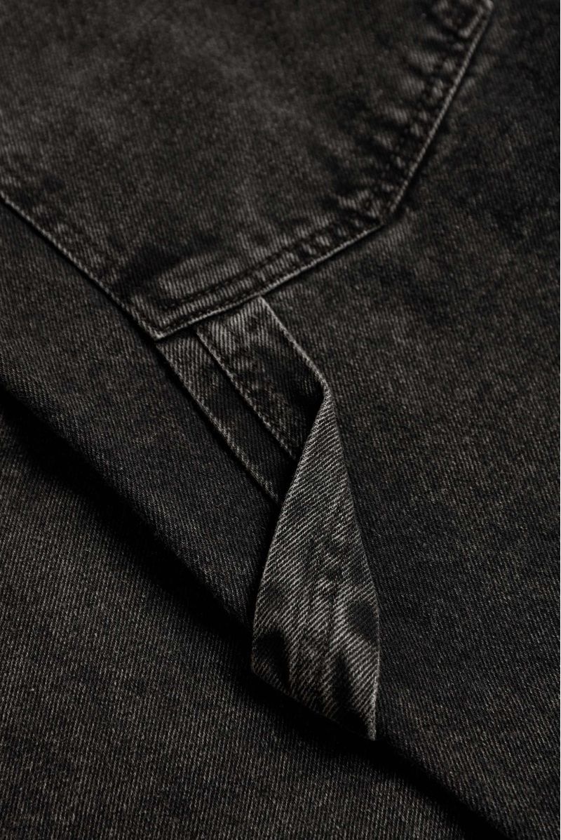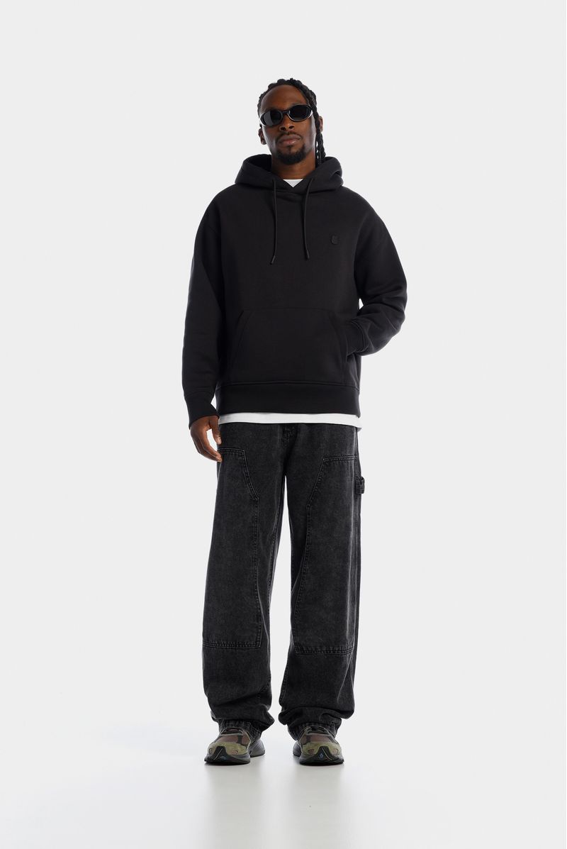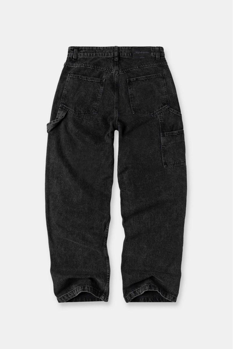 Jeans baggy negro, confeccionado con denim 100% algodón premium, de 10,5 oz. Diseñado con estética carpintero, bolsillo diagonales delanteros, trabilla y bolsillos parche en posterior. Lleva detalle de banderín cerca a cierre, garra en posterior.
