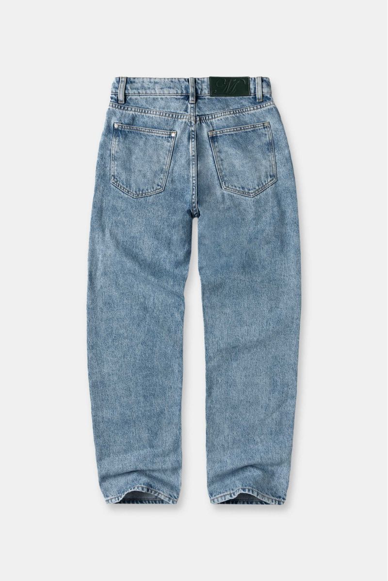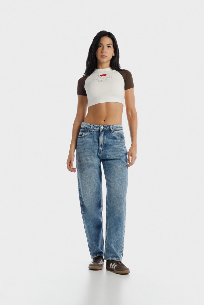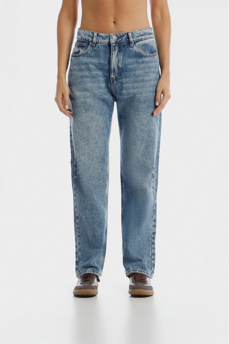 Jean fit mom tiro alto, azul medio, confeccionado con denim premium 50% algodón 50 % lyocell, 12 Oz. Estética clásica con cinco bolsillos, lleva remaches y garra contramarcados.