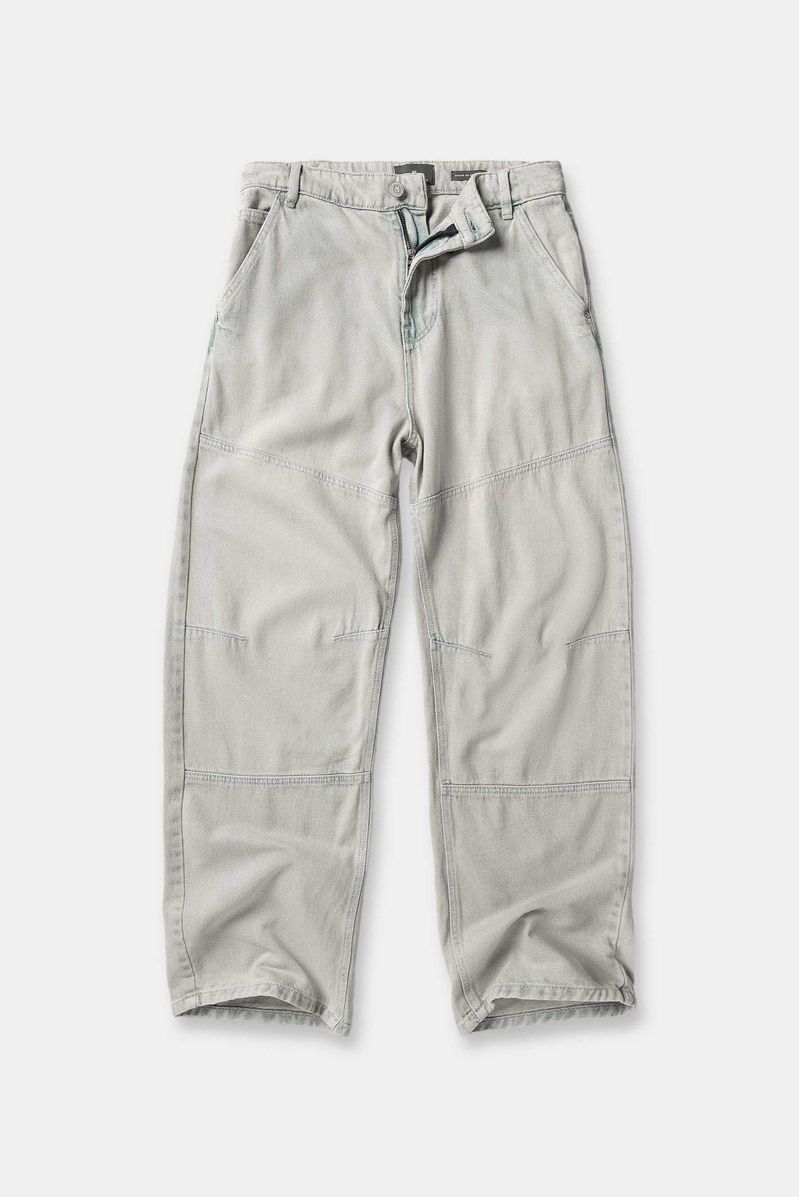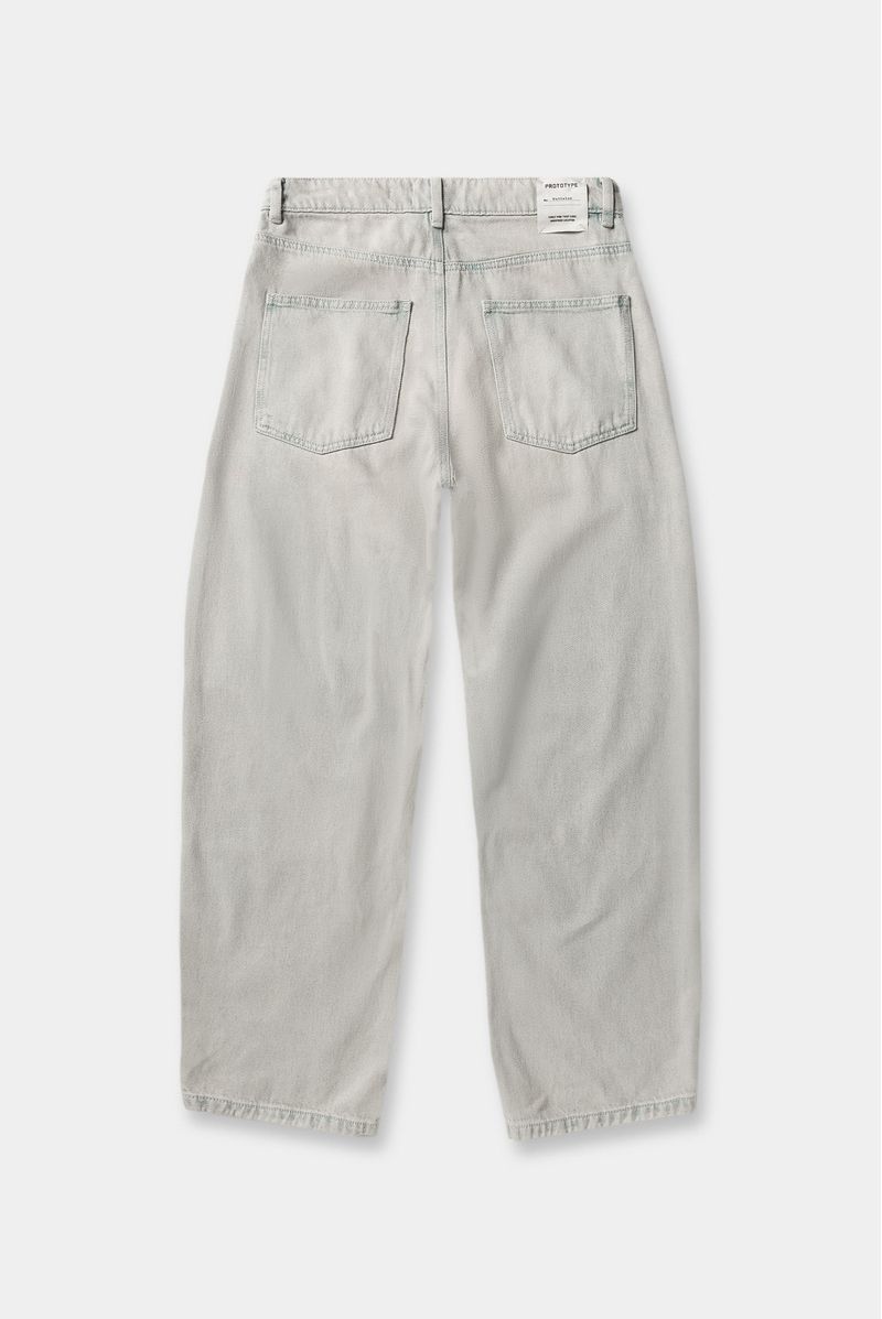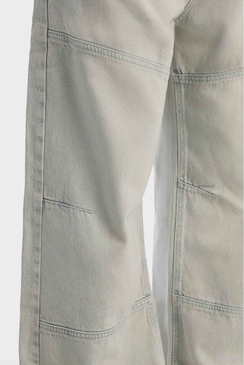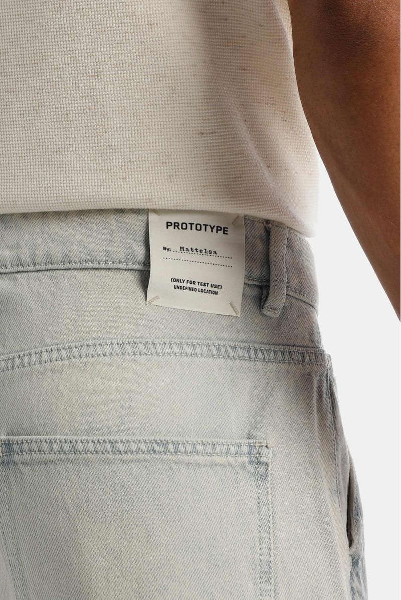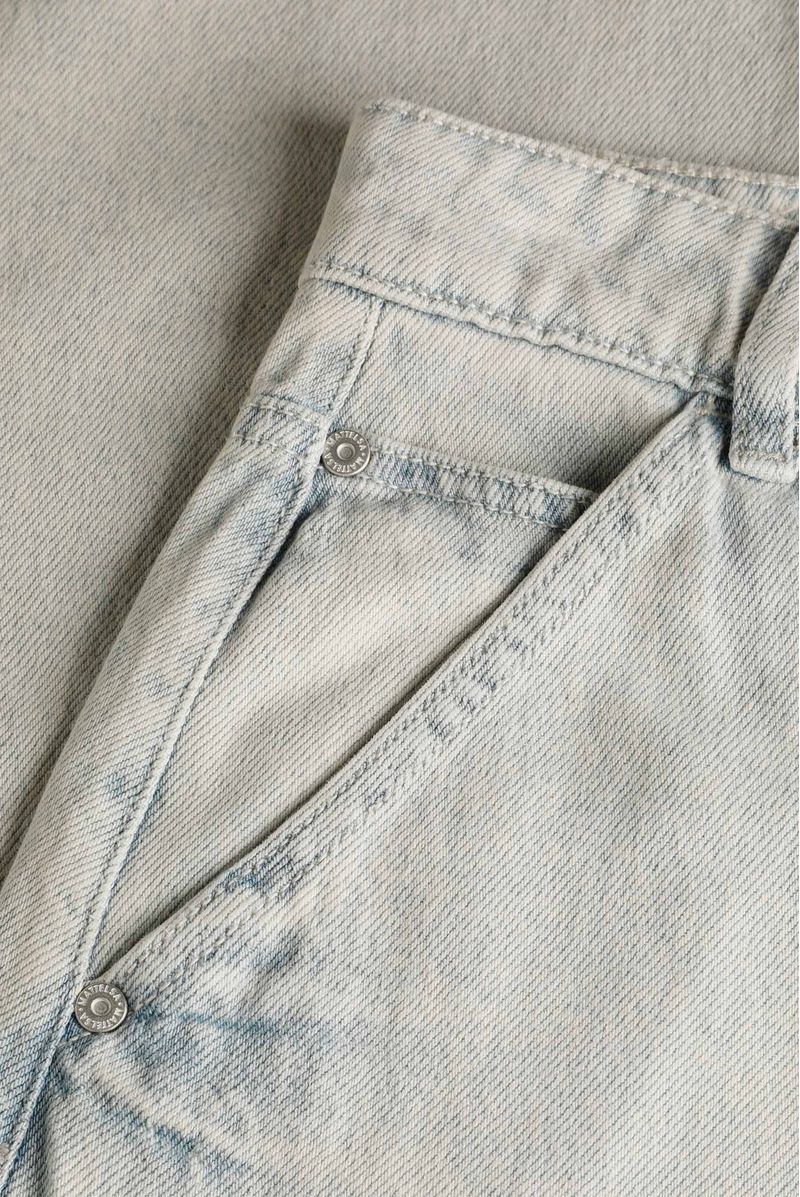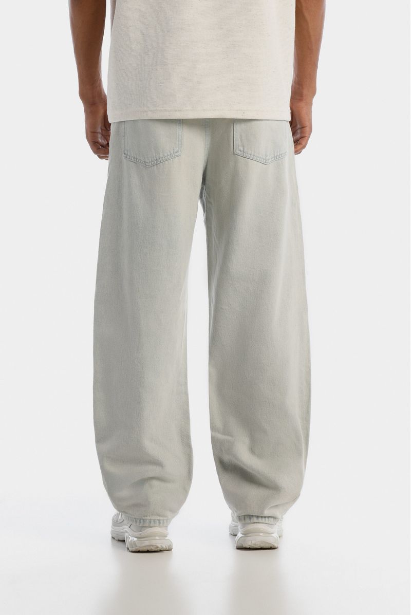 Jean 5 bolsillos, fit amplio, confeccionado en denim 50%Alg 50%Lyocell peso 12oz, botón y remaches Mattelsa, detalle de cortes frontales y pinzas para dar volumen en altura de rodilla, lavandería azul claro con textura.