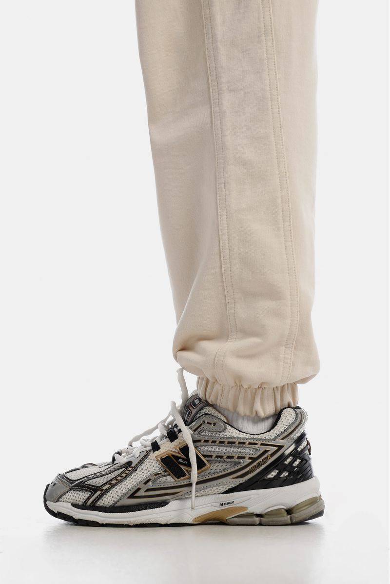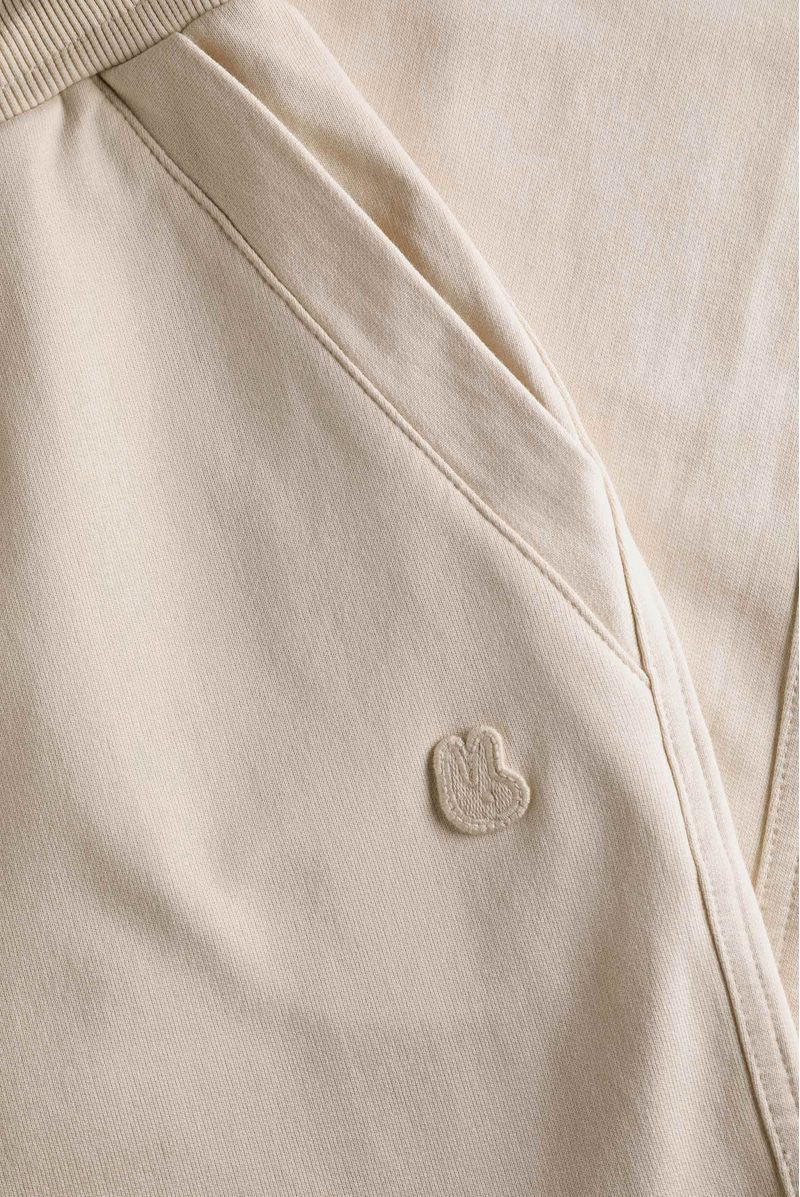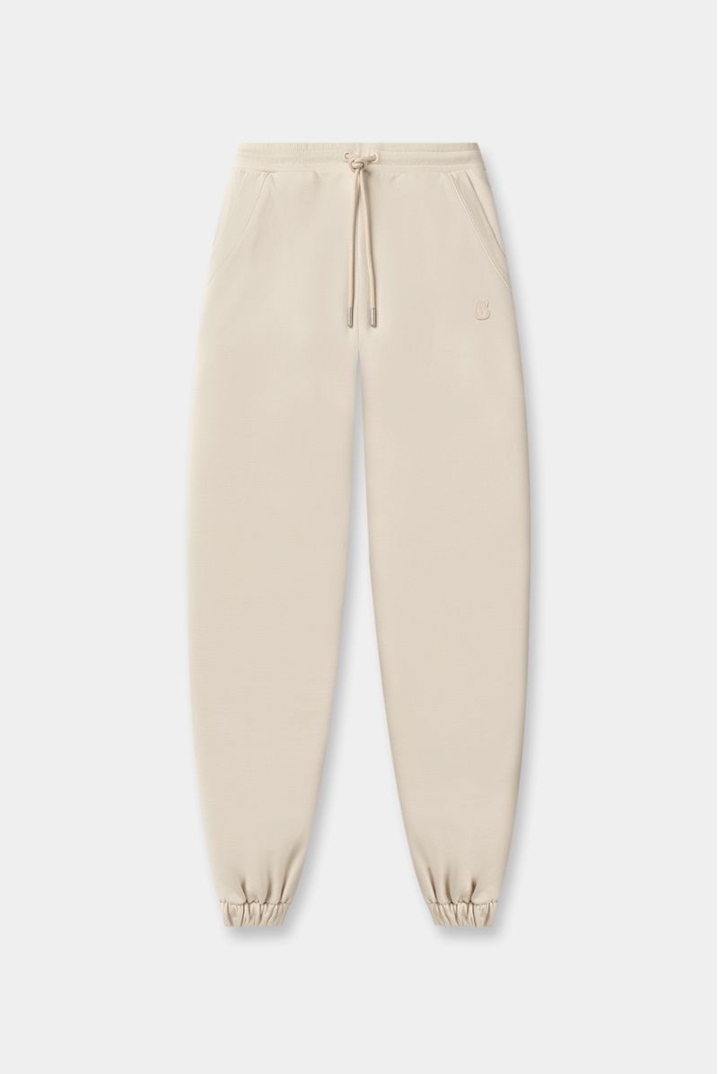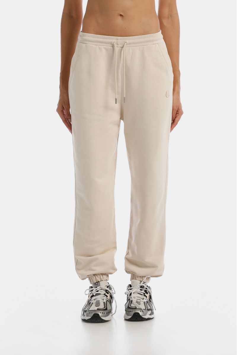 Jogger beige confeccionado en un french terry de 305 gramos. Elástico en pretina y en botas. La prenda tiene una construcción técnica con cortes en delantero y posterior. Aplique beige bordado sobre pierna izquierda.