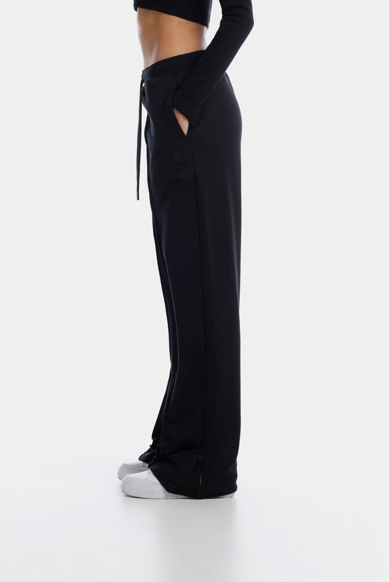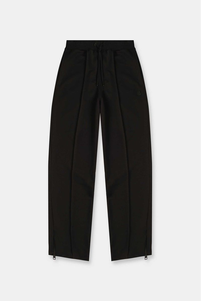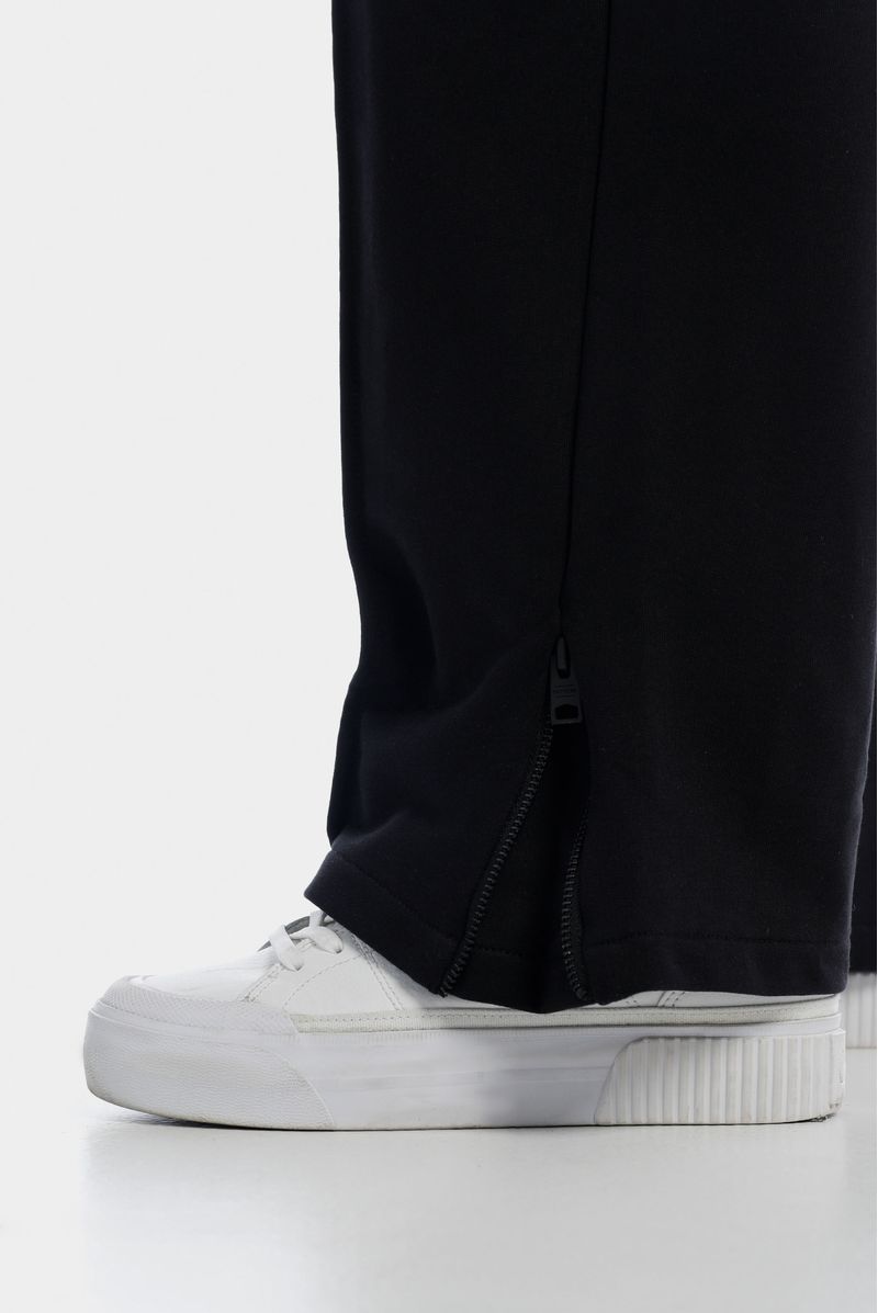 Jogger negro confeccionado en una burda de 305 gramos. Tiene aplique del conejo color negro en el costado izquierdo, bolsillos laterales y cordón negro con punteras metálicas. Adicional lleva cierres en las botas y un detalle de alforzas en frente.