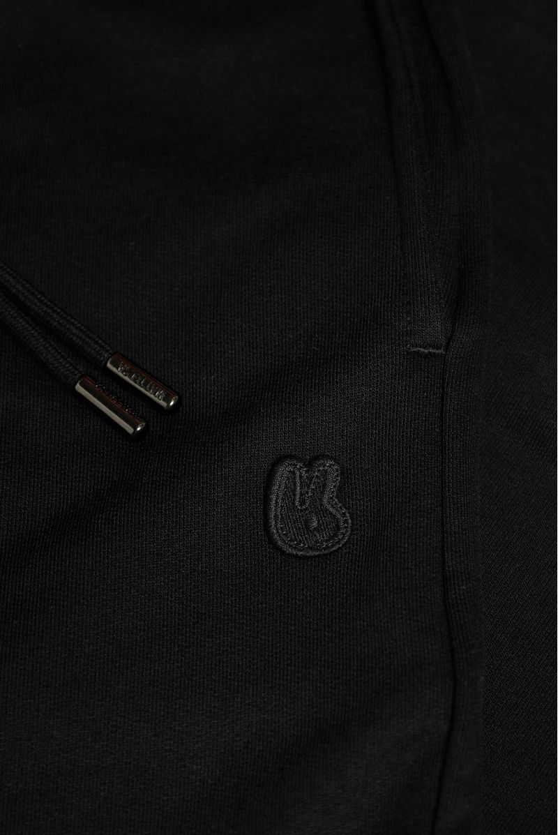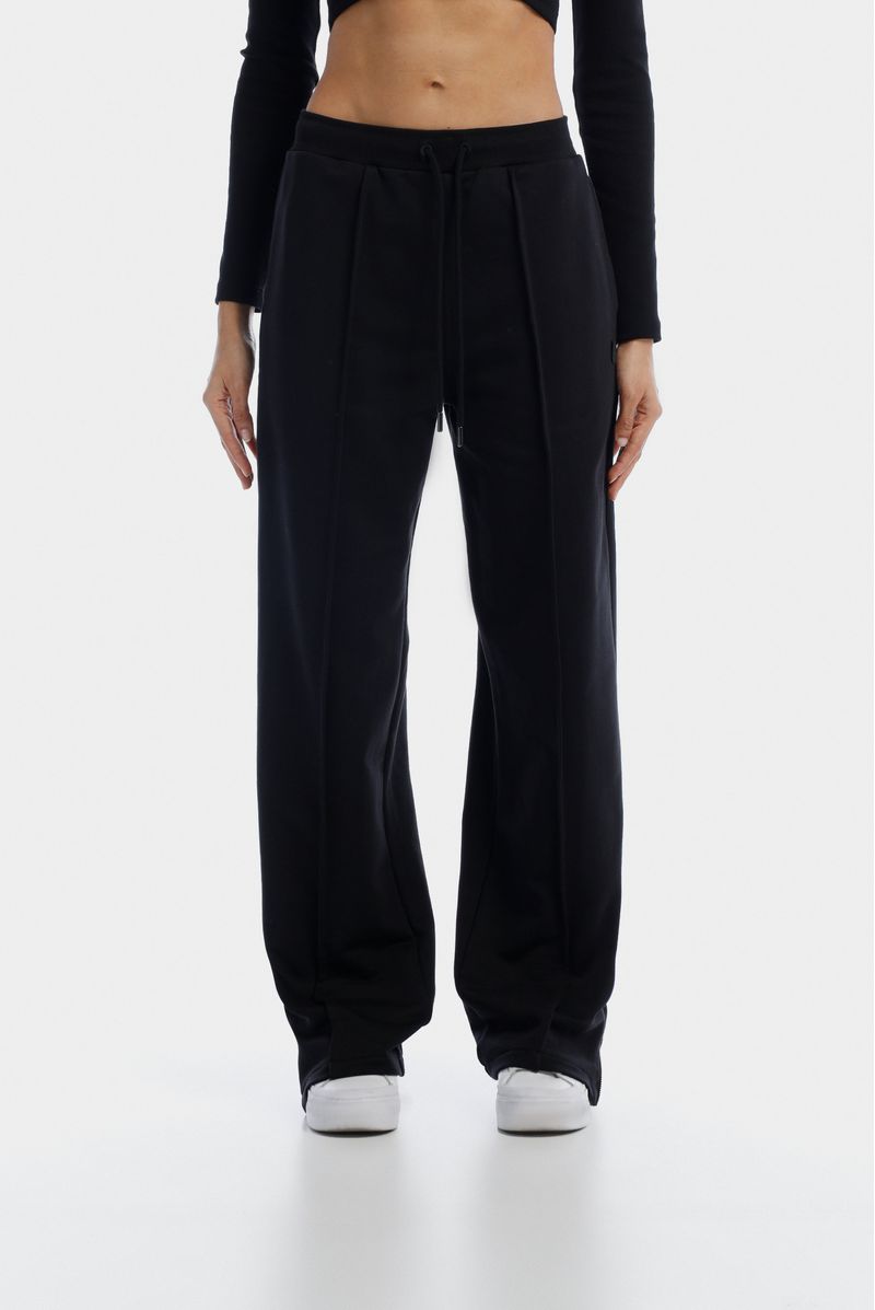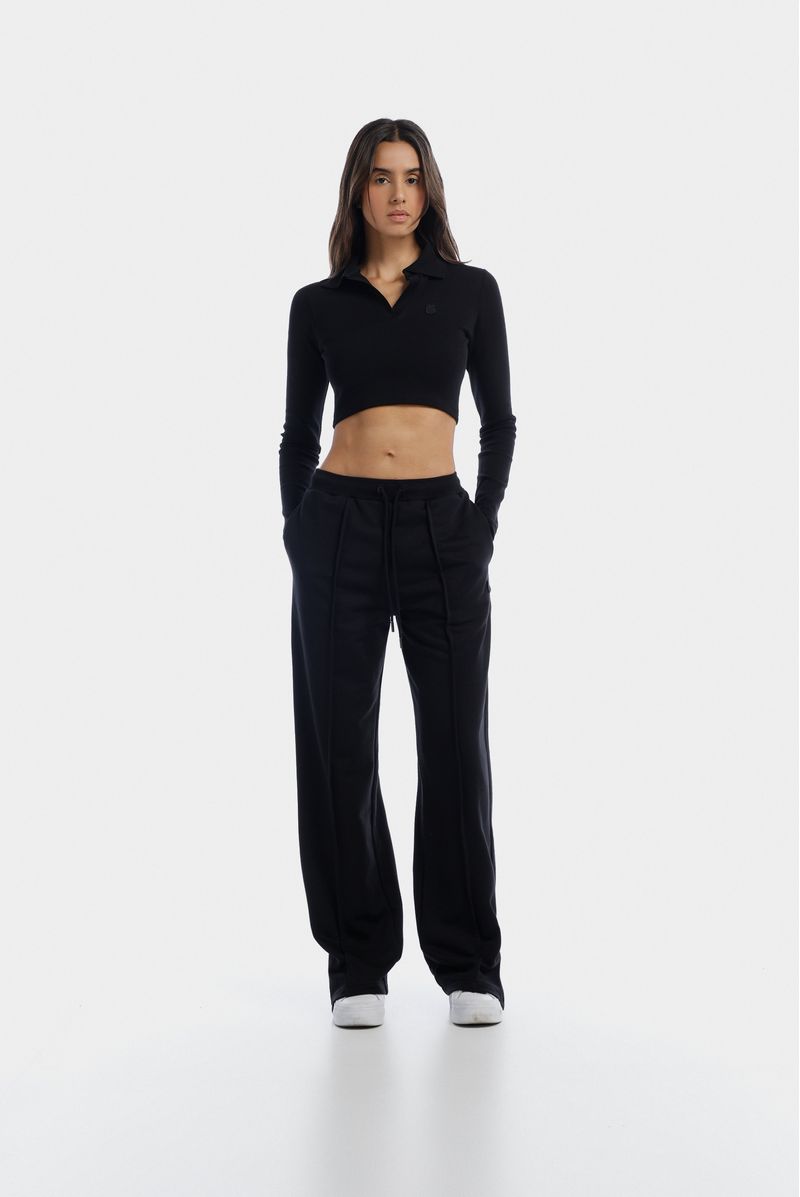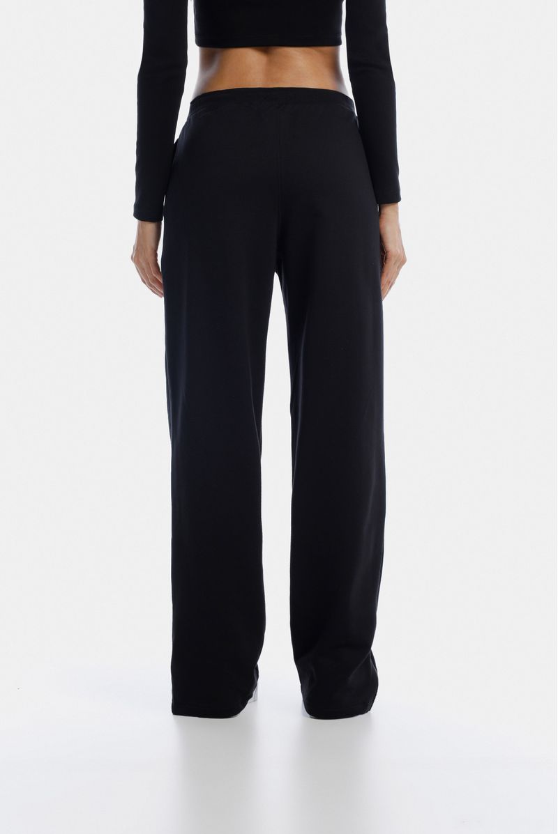 Jogger negro confeccionado en una burda de 305 gramos. Tiene aplique del conejo color negro en el costado izquierdo, bolsillos laterales y cordón negro con punteras metálicas. Adicional lleva cierres en las botas y un detalle de alforzas en frente.
