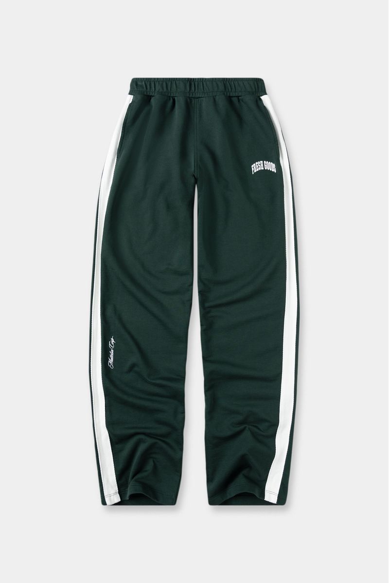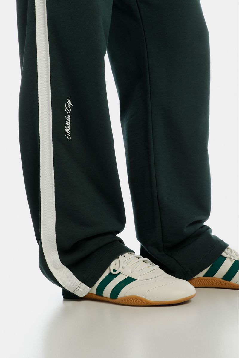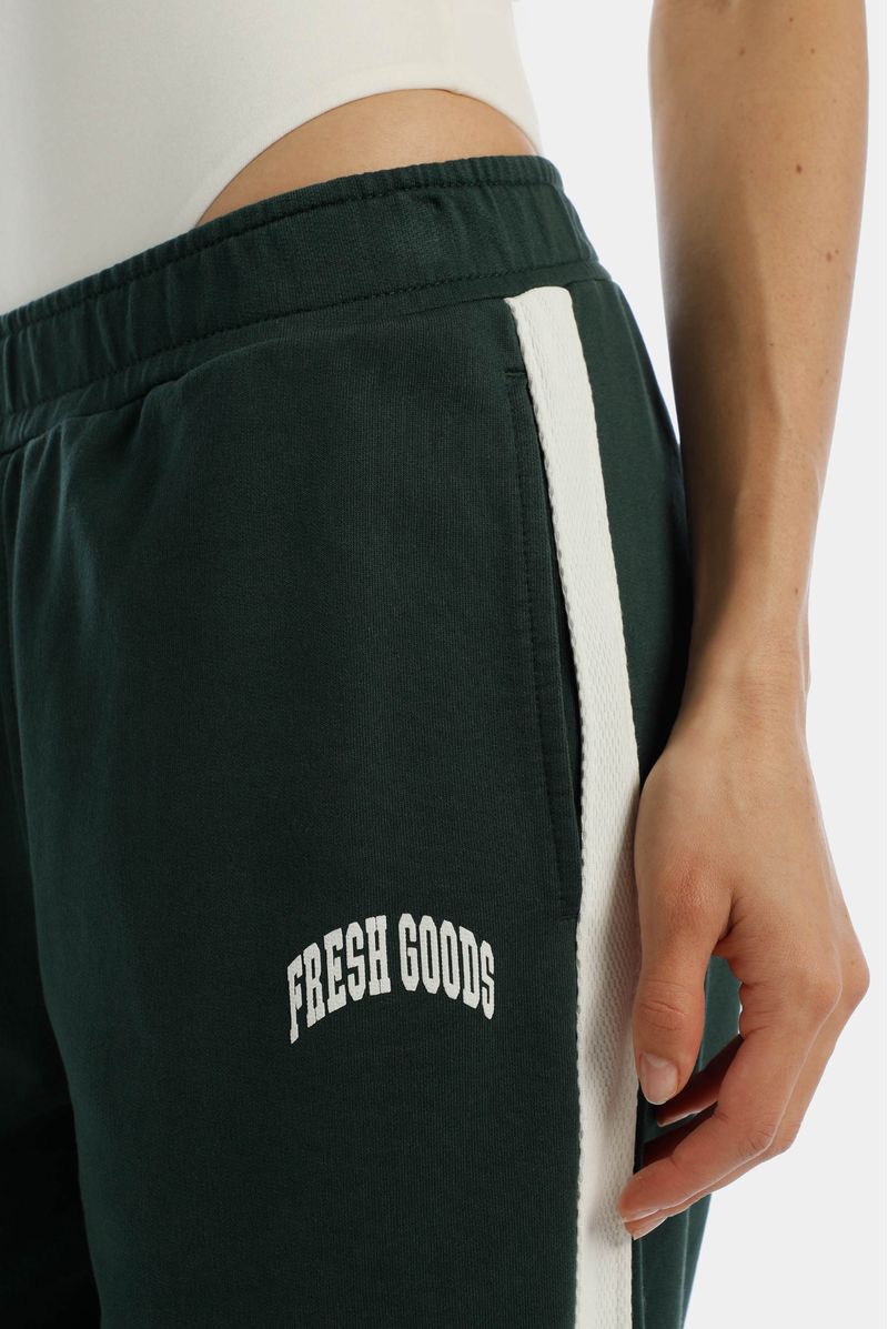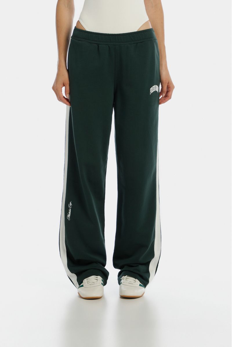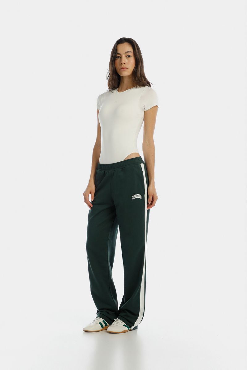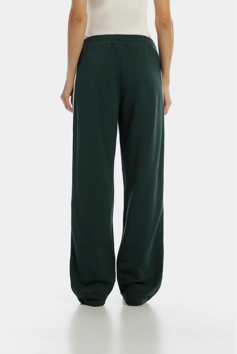 Jogger recto verde, confeccionado en un French terry de 305gr. Lleva cortes en costados en contraste en tela Jacquard. Tiene elástico interno en pretina y estampación en puff en delantero.