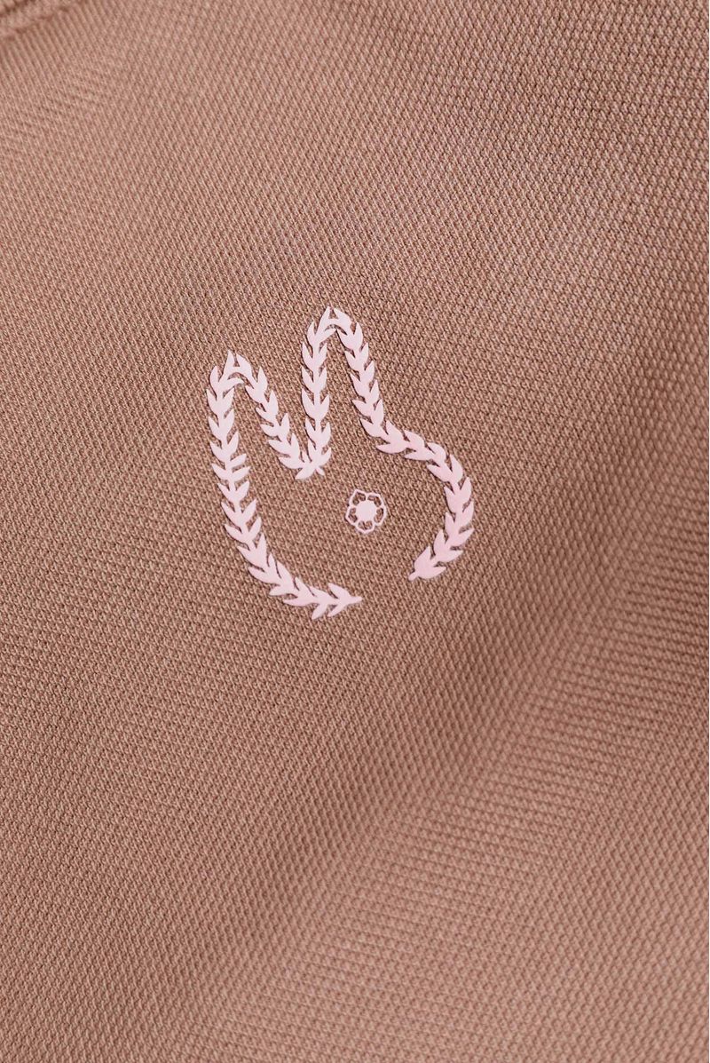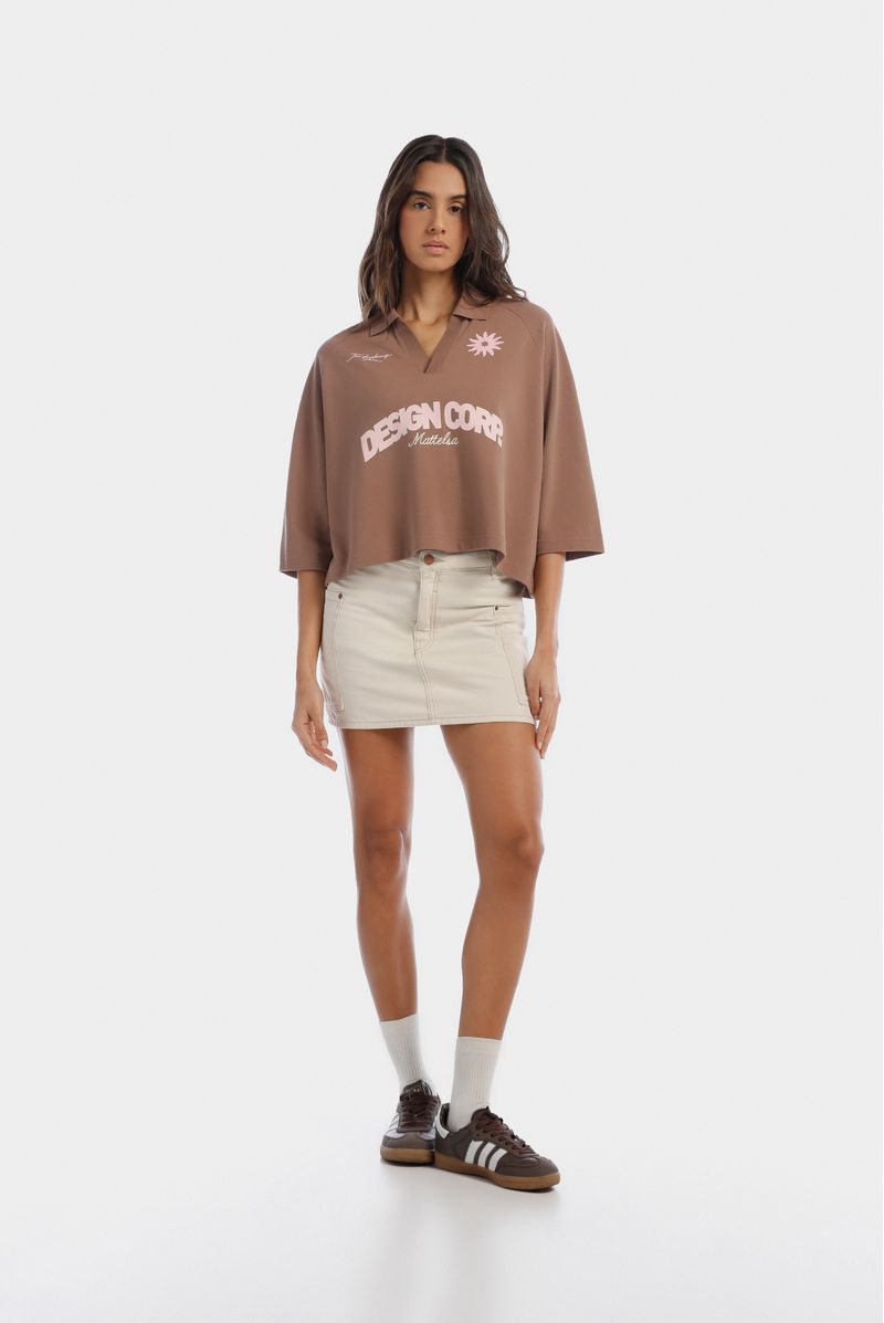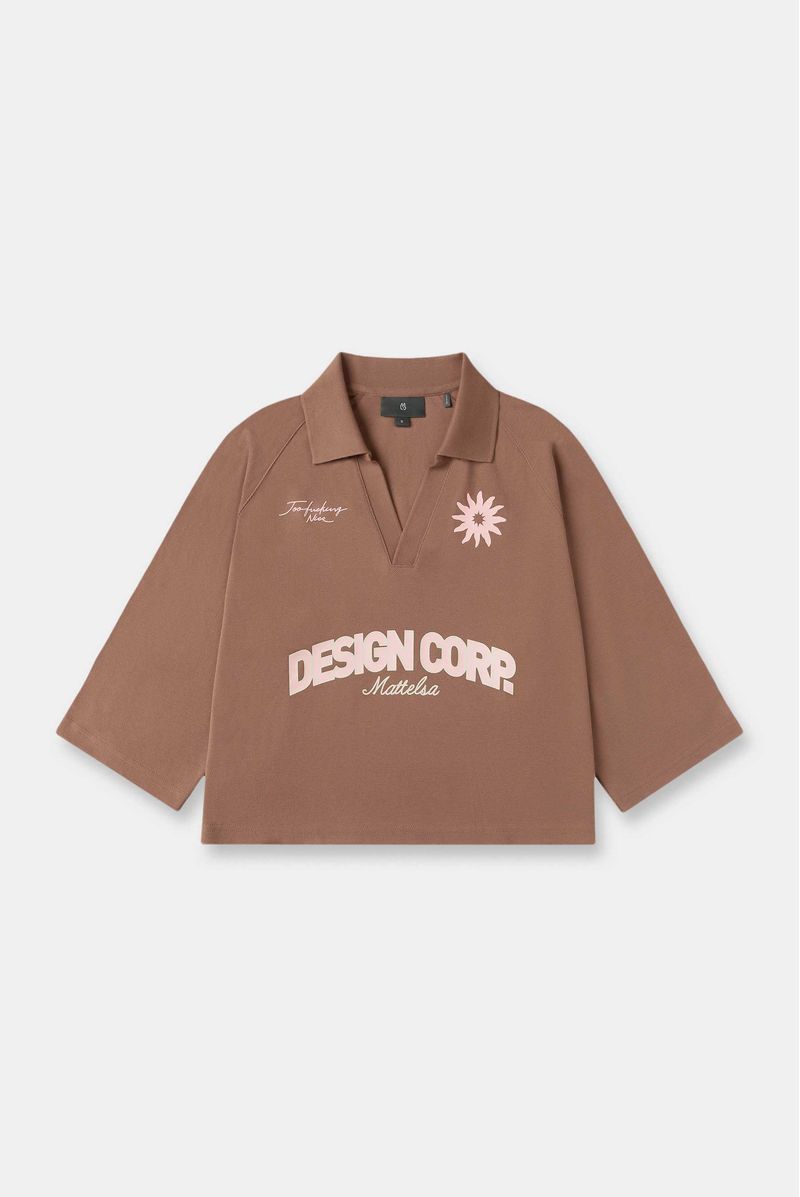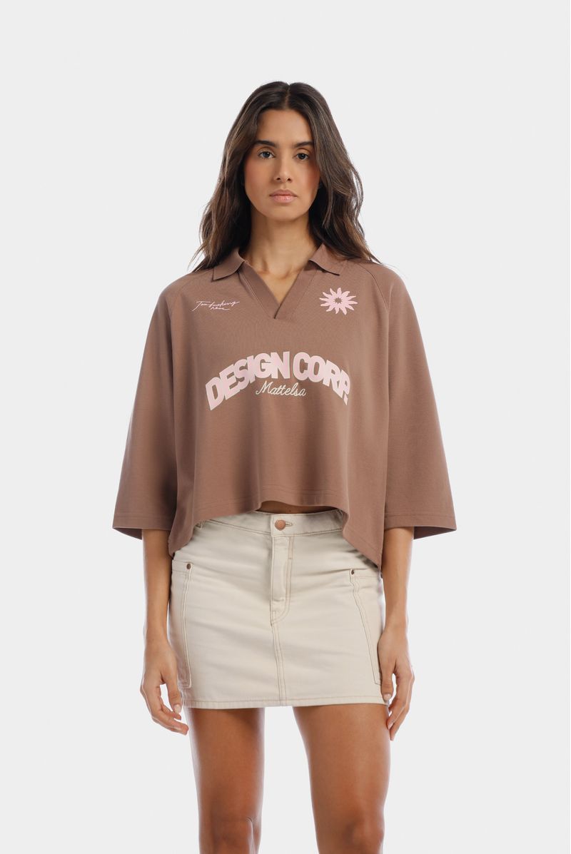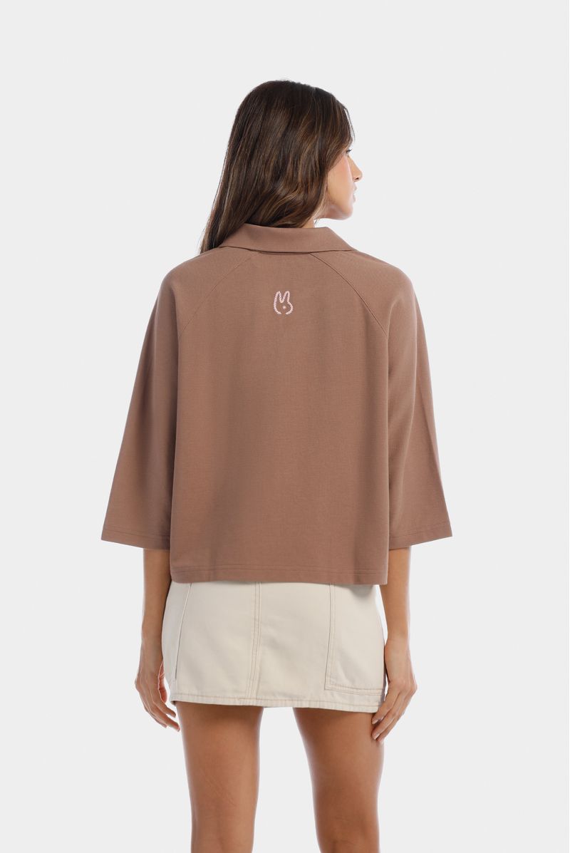 Polo oversized café confeccionada en un piqué de 250 gramos. Lleva estampación en el delantero en plástico color rosado y en el posterior lleva el conejo estampado en plástico rosado.