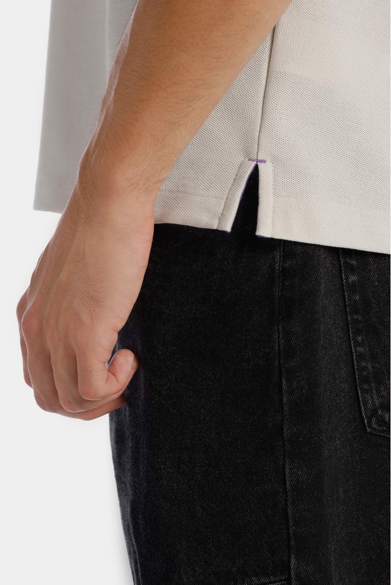 Camiseta tipo Polo Regular Fit confeccionada en un Piqué Premium de 200gr de peso. En frente tiene un aplique bordado con el logo de la marca. Lleva cuello y puños tejidos, y cajas en costados con presillas e hiladillas en color morado.