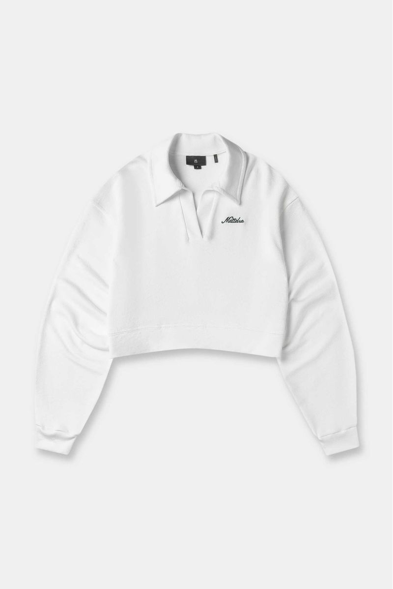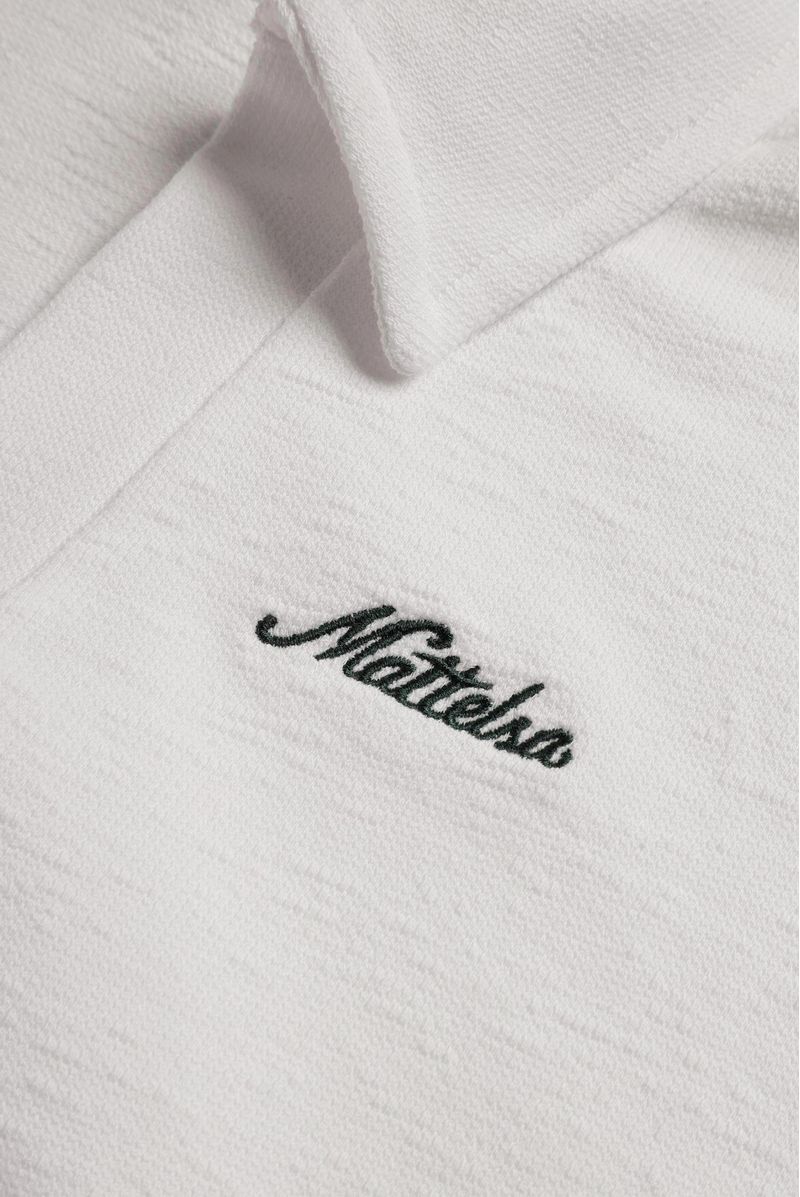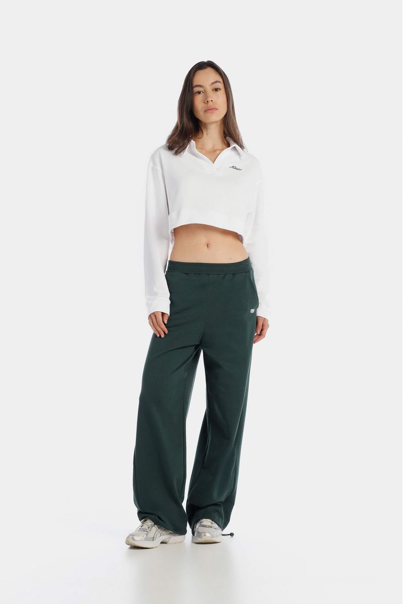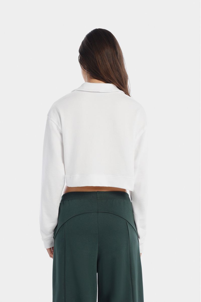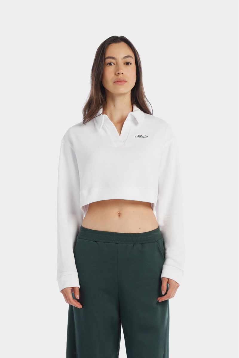Polo blanca manga larga confeccionada en un towel terry de 240 gramos. Lleva perilla y cuello en la misma tela. Adicional tiene un texto bordado color verde en el frente.