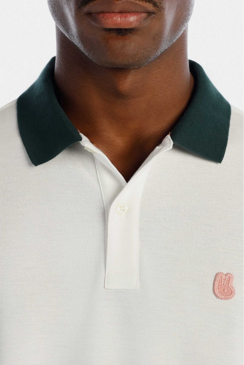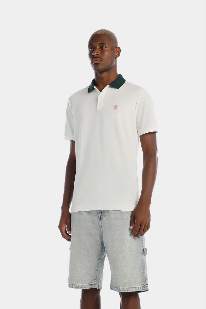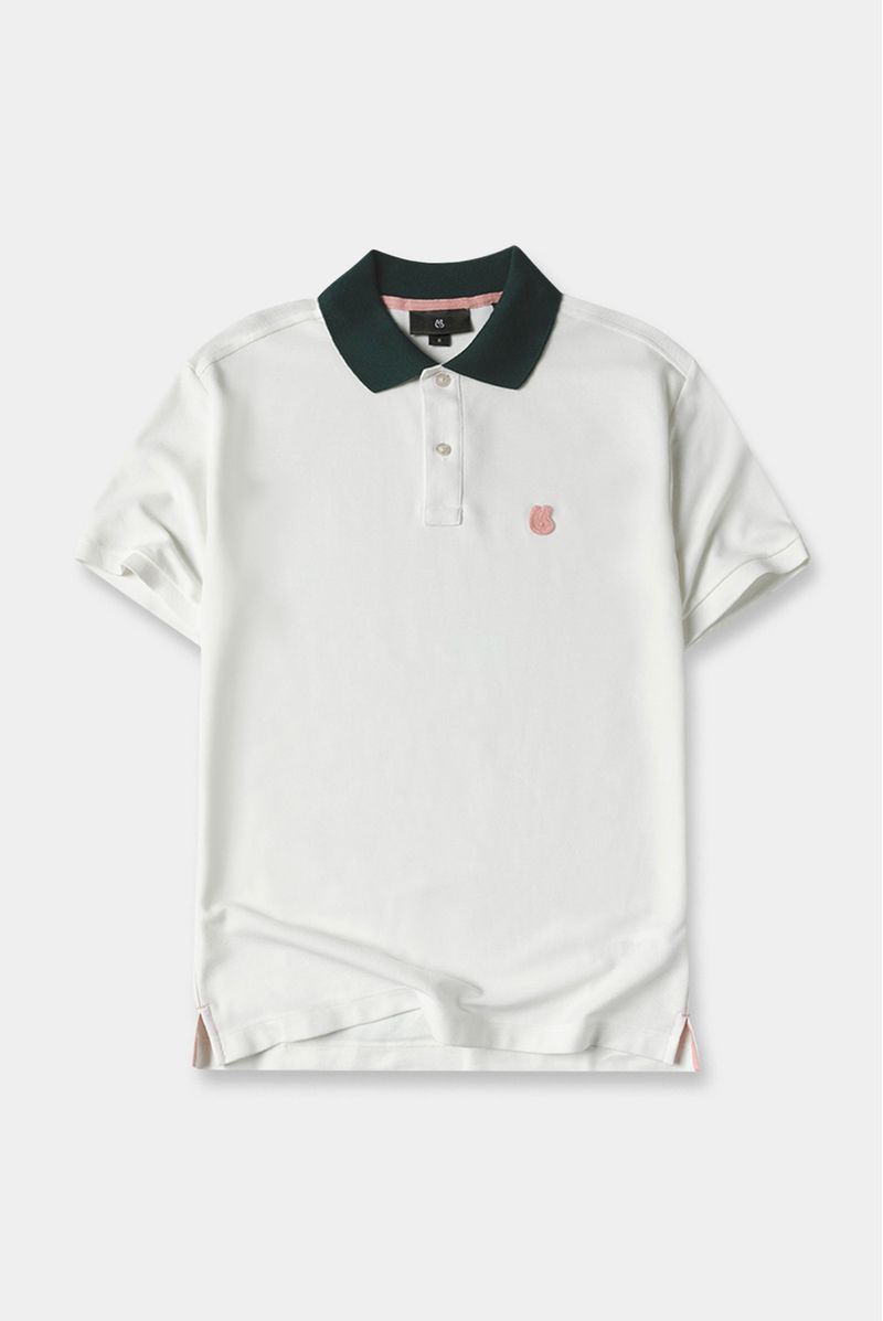 Camiseta tipo Polo Regular Fit confeccionada en un Piqué Premium de 200gr de peso. En frente tiene un aplique bordado con el logo de la marca. Lleva cuello en color verde, puños tejidos, y cajas en costados con presillas e hiladillas en color rosado.