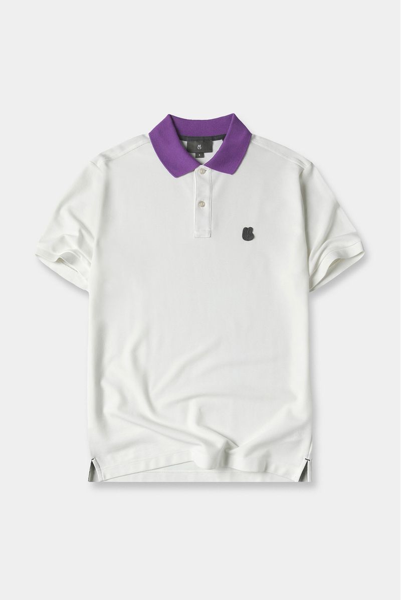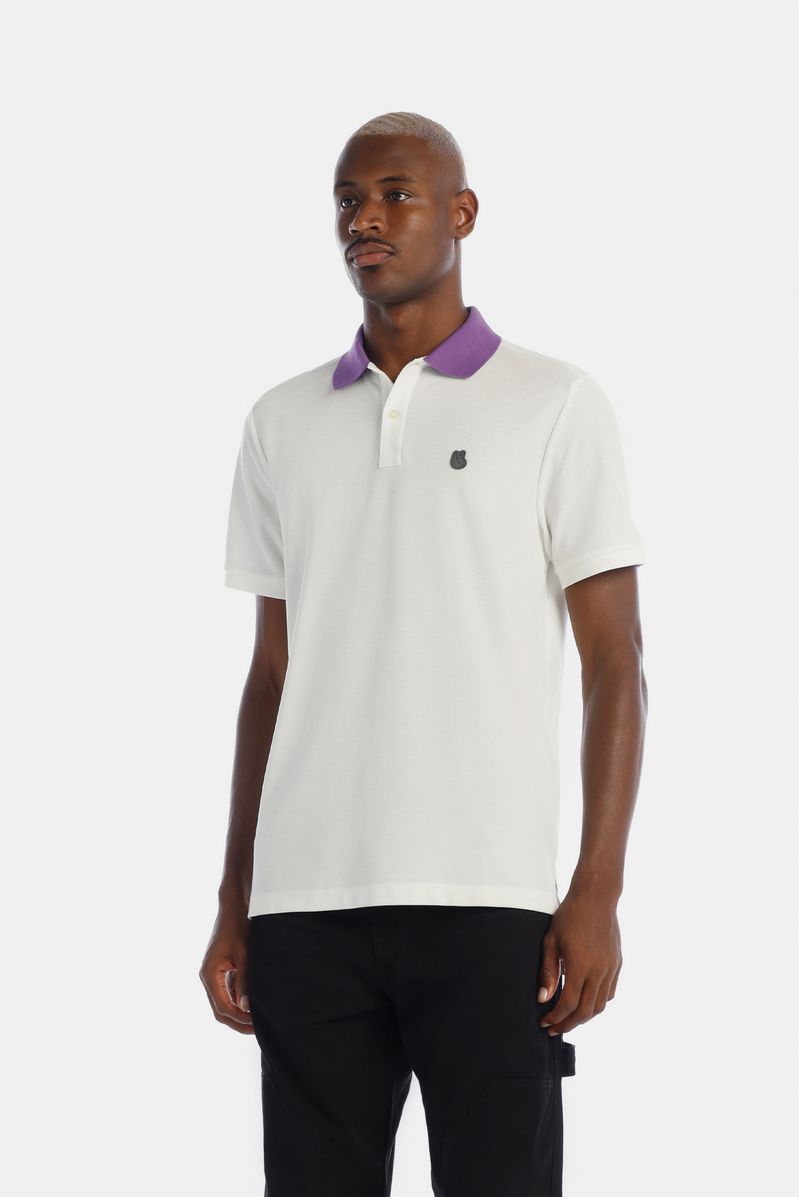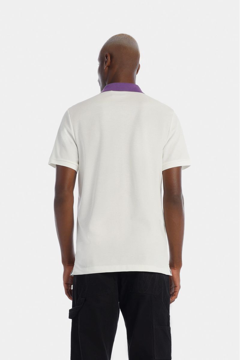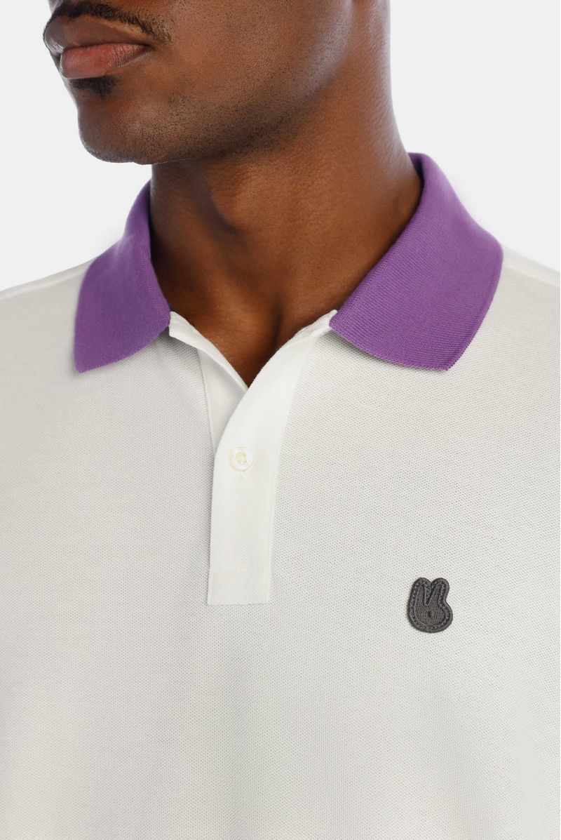 Camiseta tipo Polo Regular Fit confeccionada en un Piqué Premium de 200gr de peso. En frente tiene un aplique bordado con el logo de la marca. Lleva cuello en color morado, puños tejidos, y cajas en costados con presillas e hiladillas en color gris.