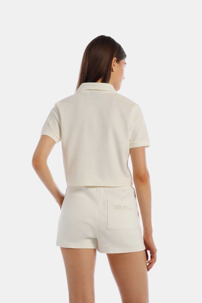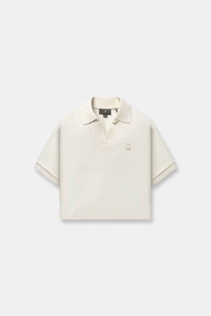 Camiseta tipo polo marfil confeccionada en un piqué de 200 gramos. Escote en V, puños y solapas del cuello en un tejido con textura. Aplique del conejo bordado en ubicación punto corazón entonado a la base de la tela.