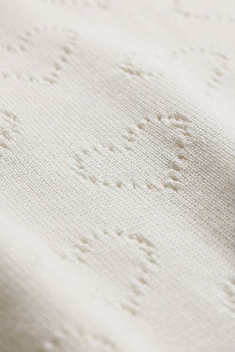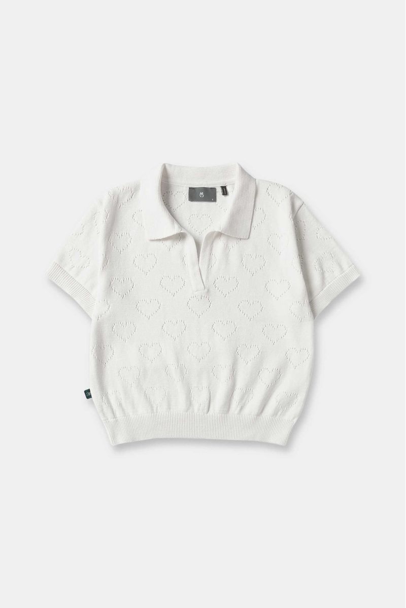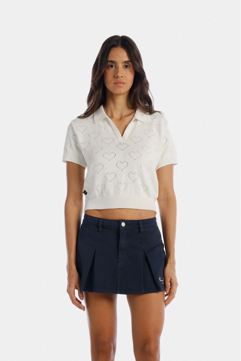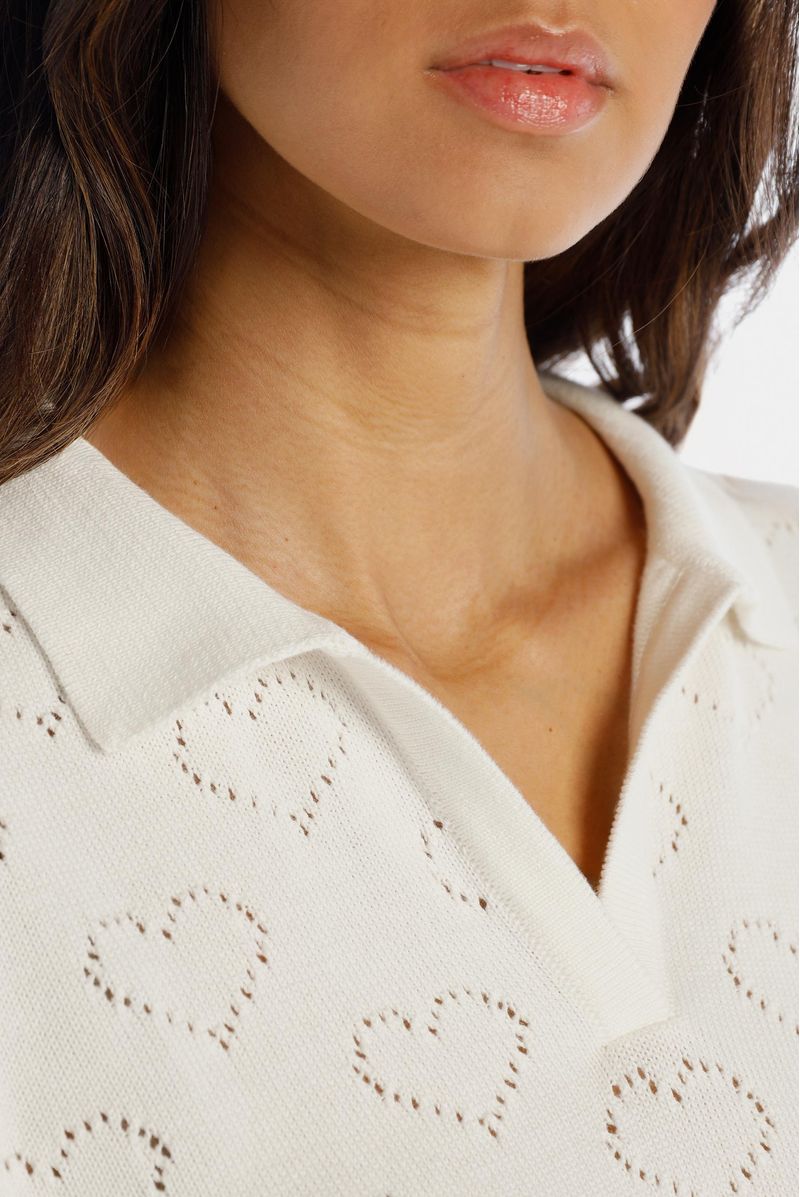 Polo manga corta marfil tejida de 300 gramos. Polo tradicional con cuello, puños, perilla y botones. Tejido con motivo de corazones. Banderín en costados verde.