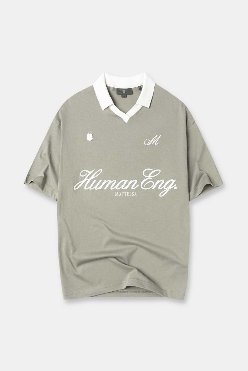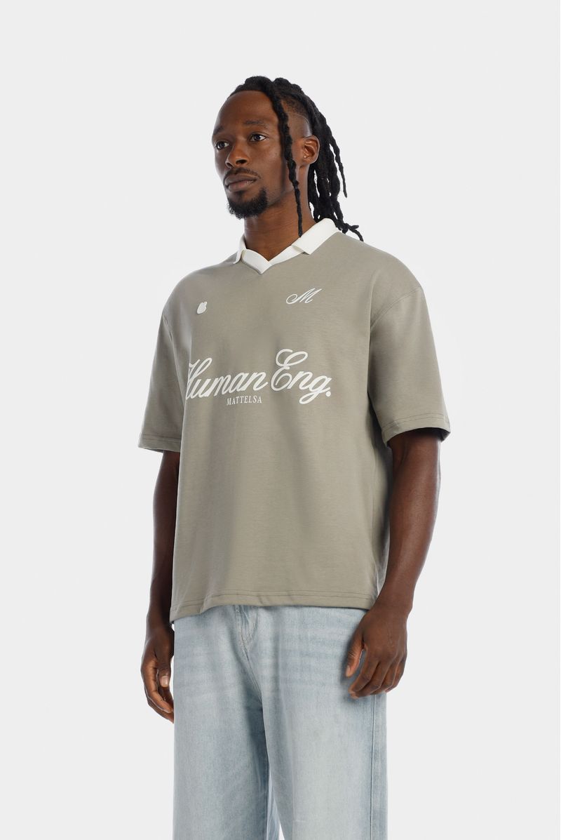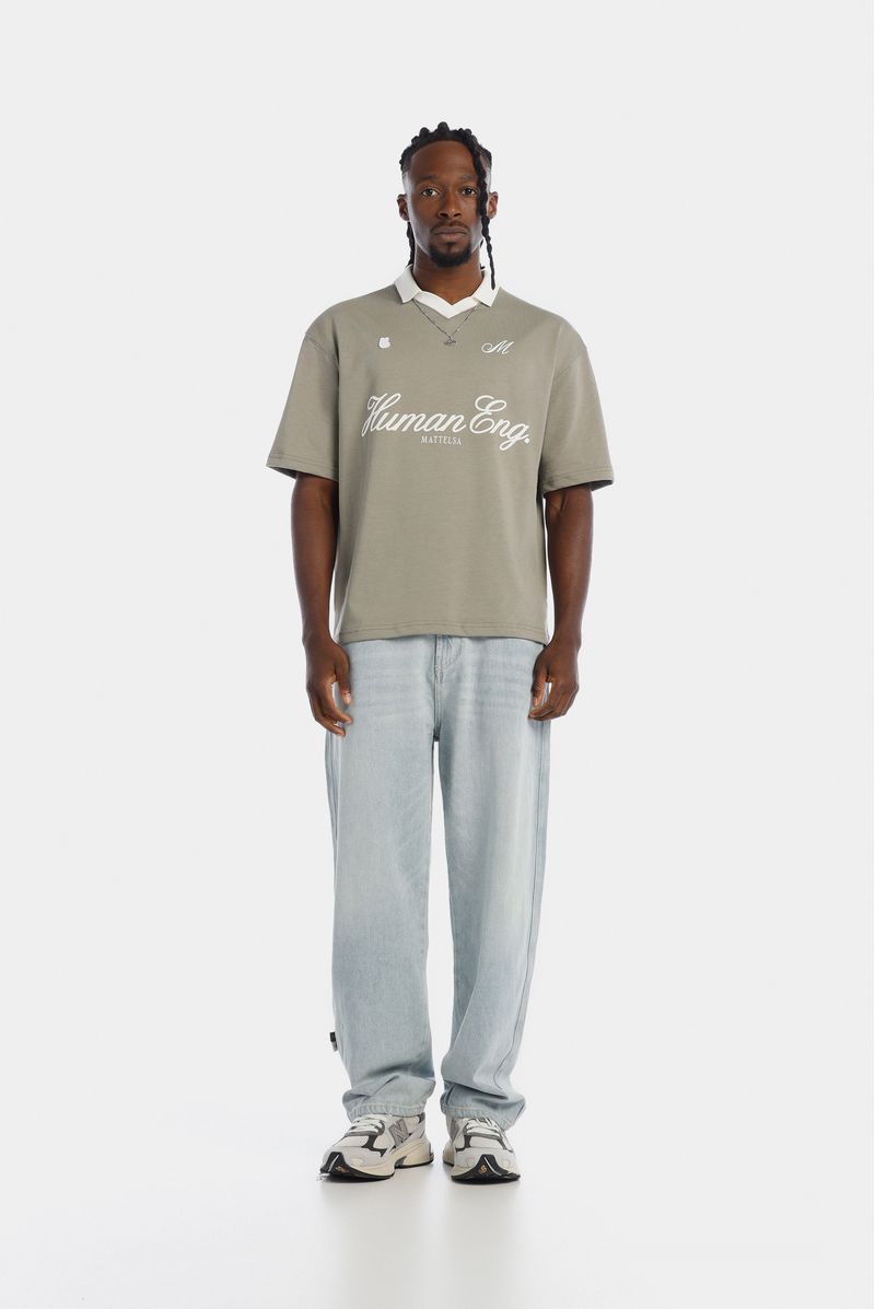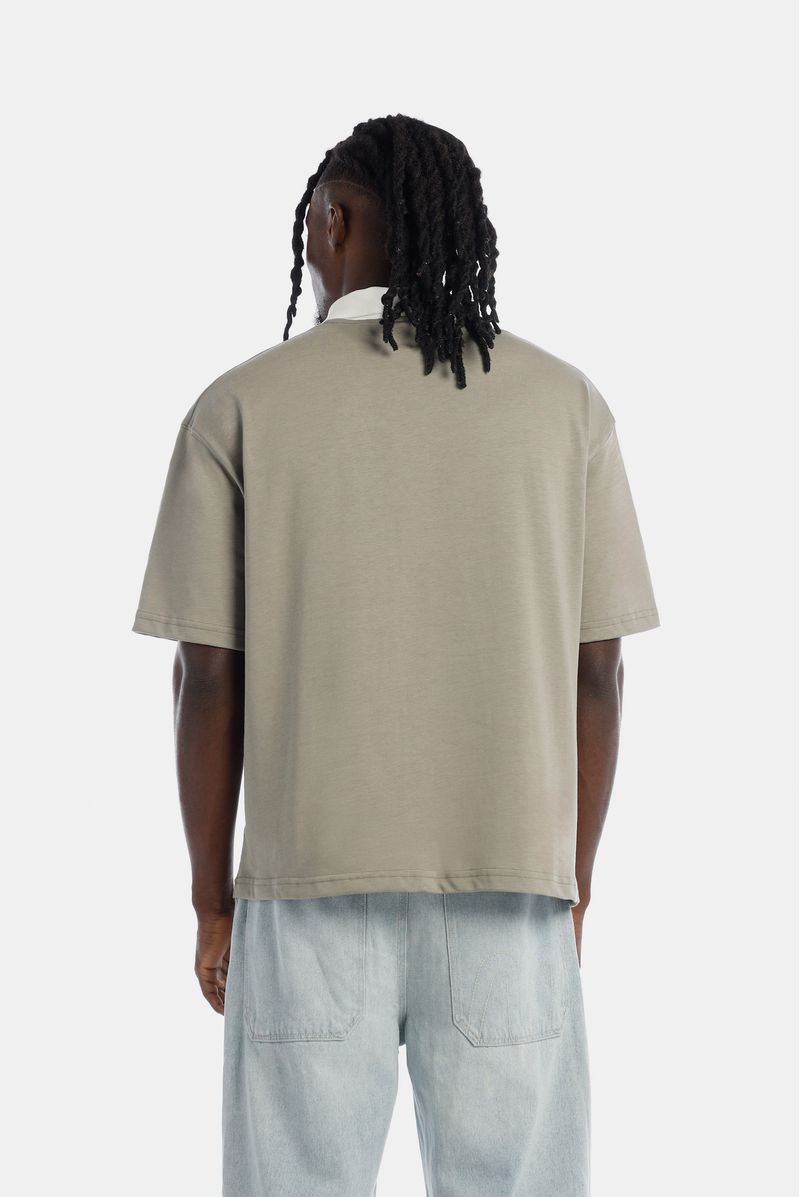 Camiseta Oversize confeccionada en un Jersey Premium de alto gramaje de 245gr de peso. Con estampación en frente en plastisol y alta densidad. Lleva un aplique bordado con el logo de la marca y cuello tejido tipo polo y en "v" en color marfil.