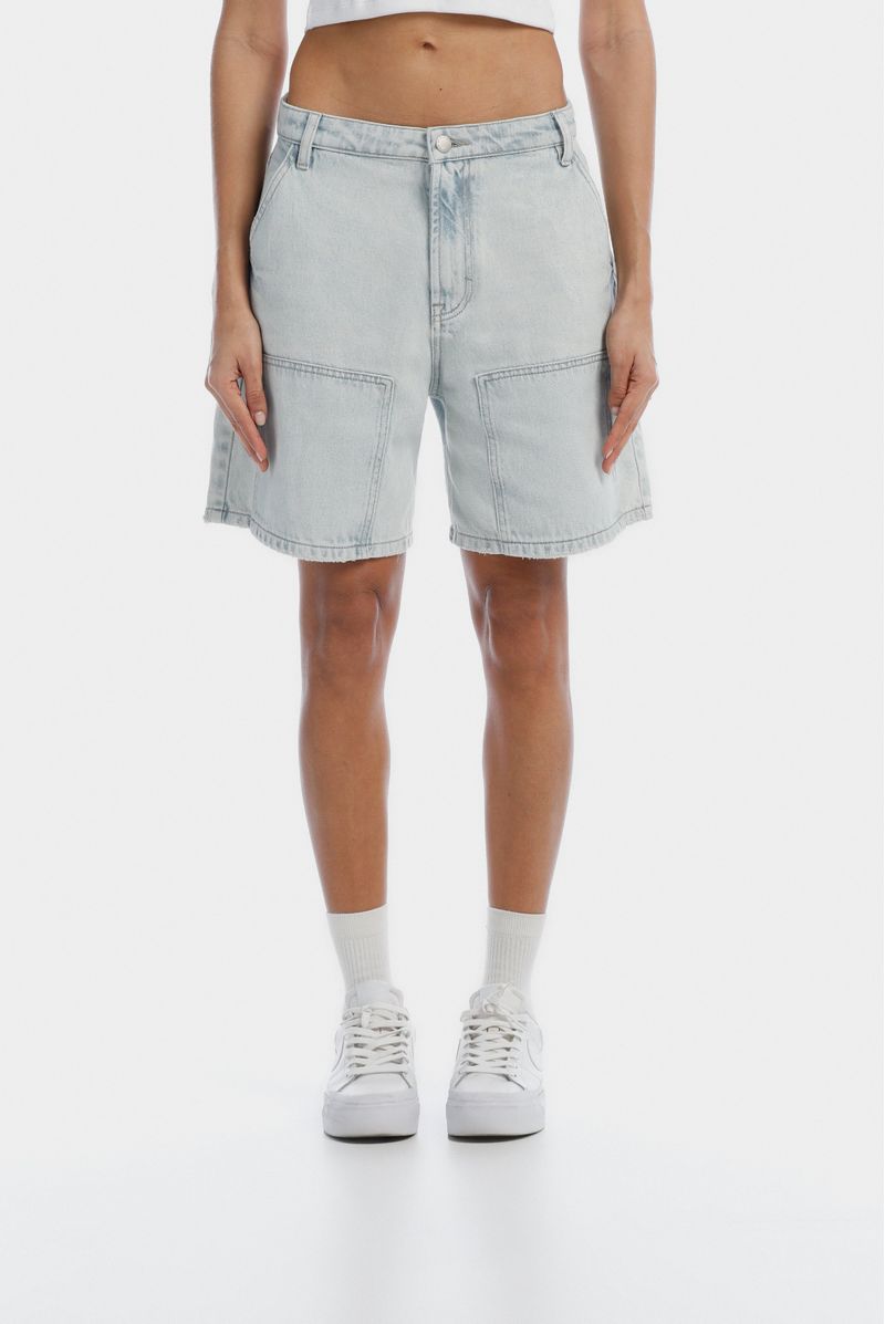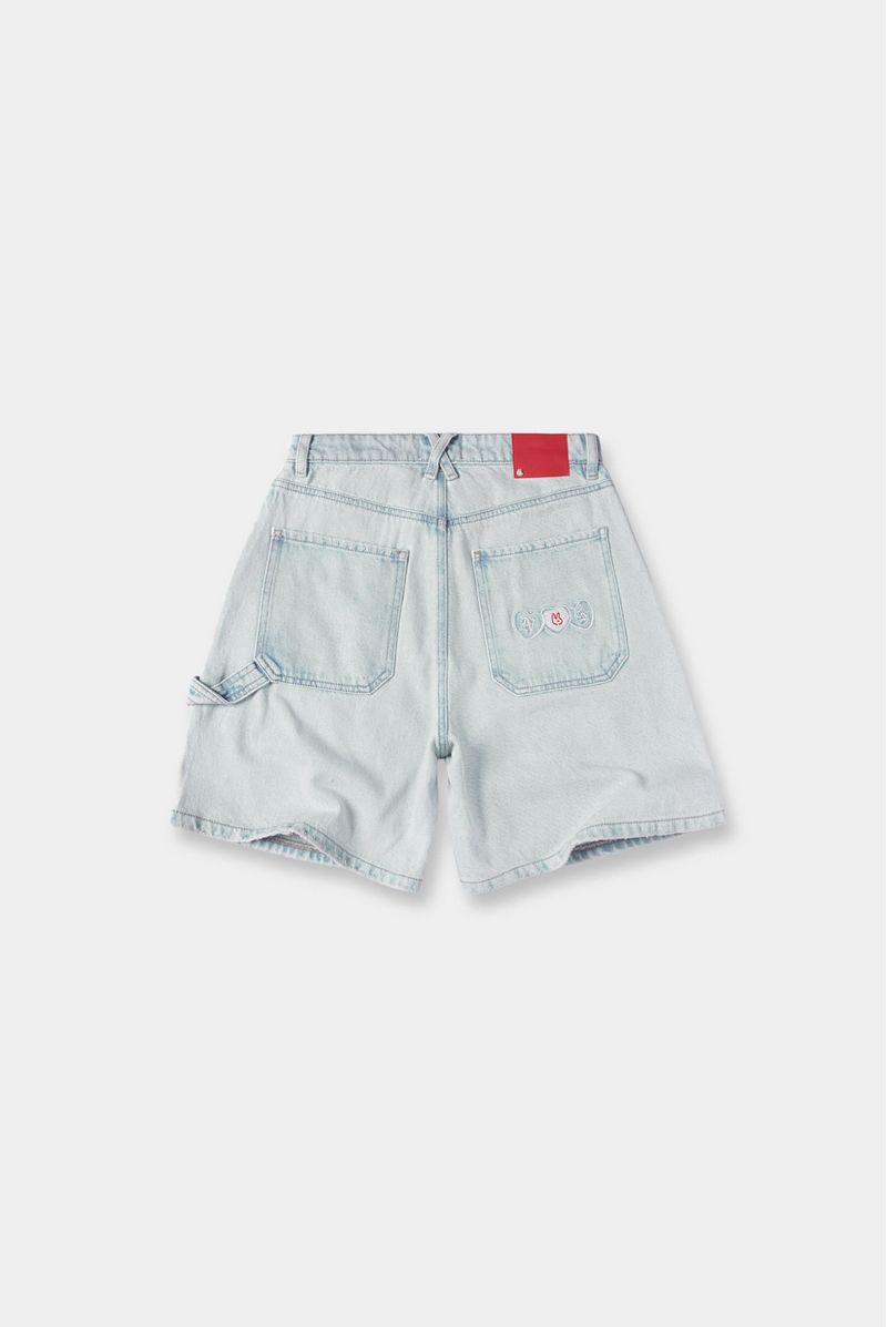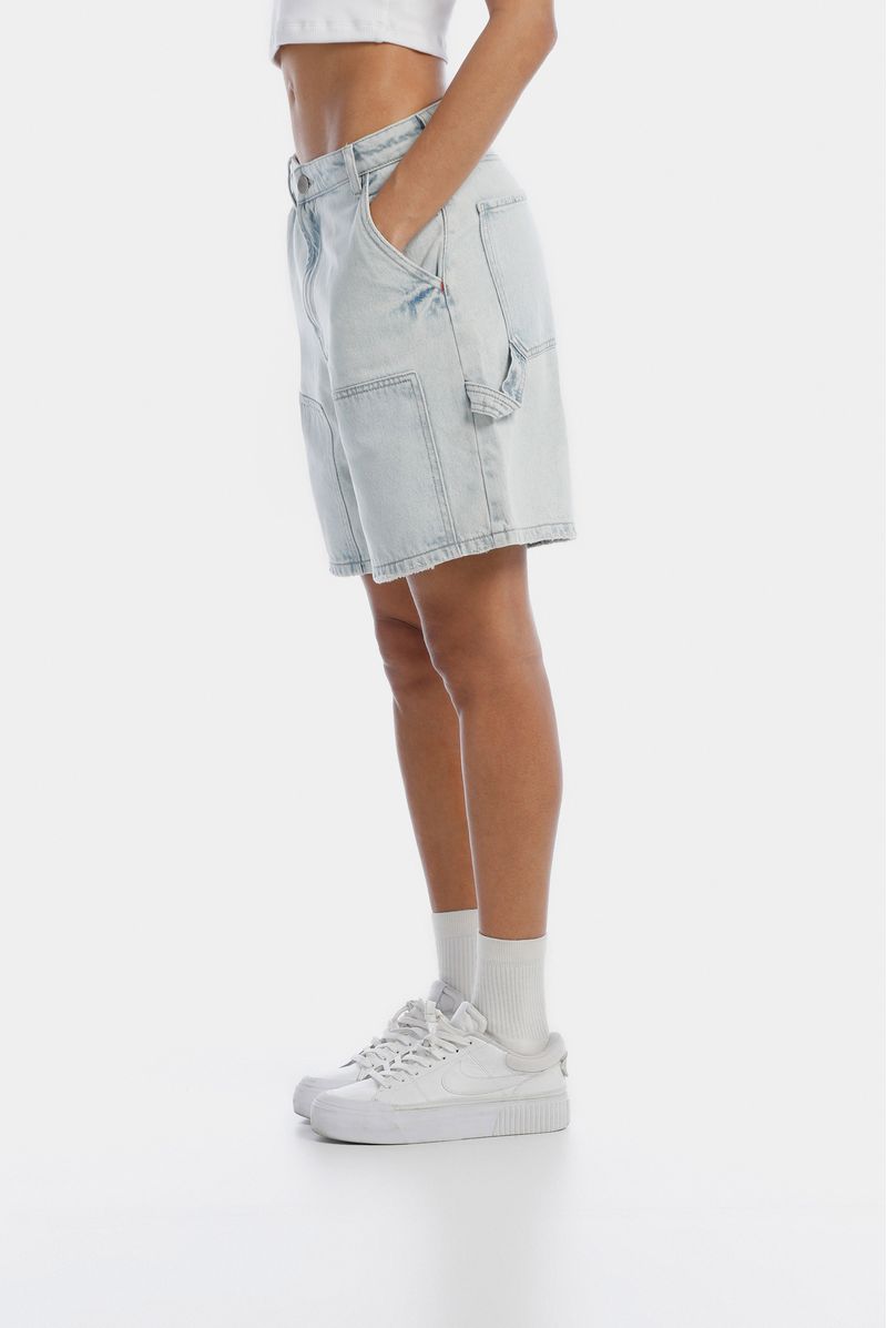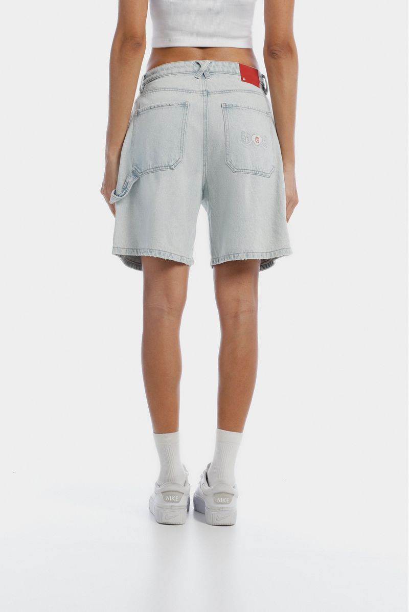 Loose shorts azul claro, tiro alto, confeccionado en denim 50% algodón 50% lyocell, de 12 oz. Diseñado con éstetica carpintero, parches y bolsillos en leve contraste, garra roja en pretina y detalle bordado en bolsillo derecho posterior.
