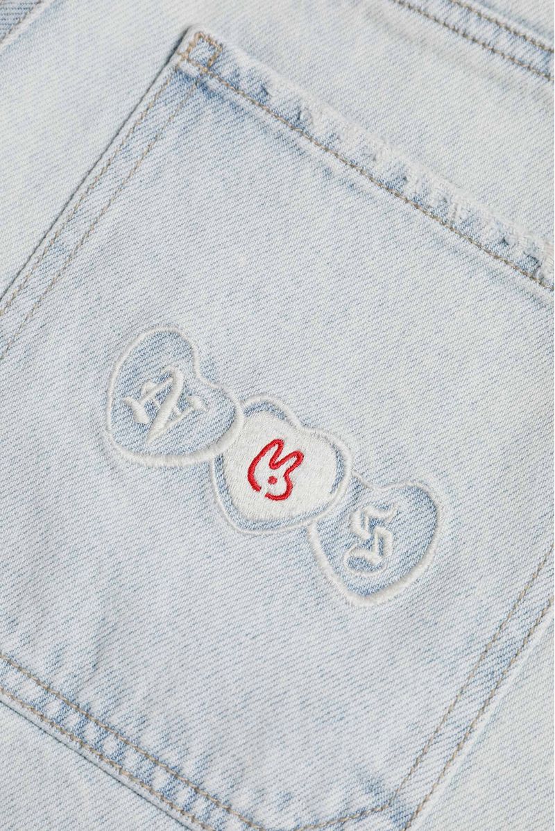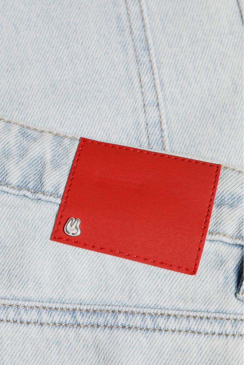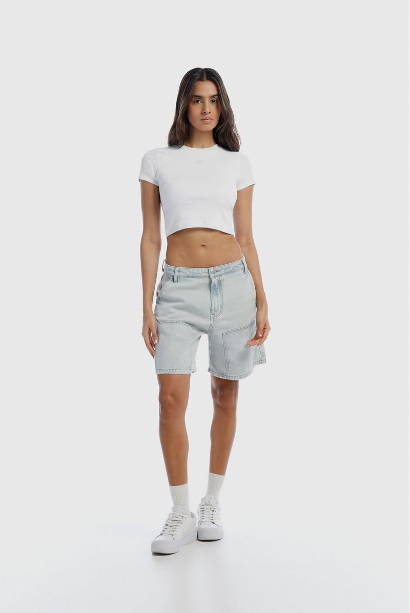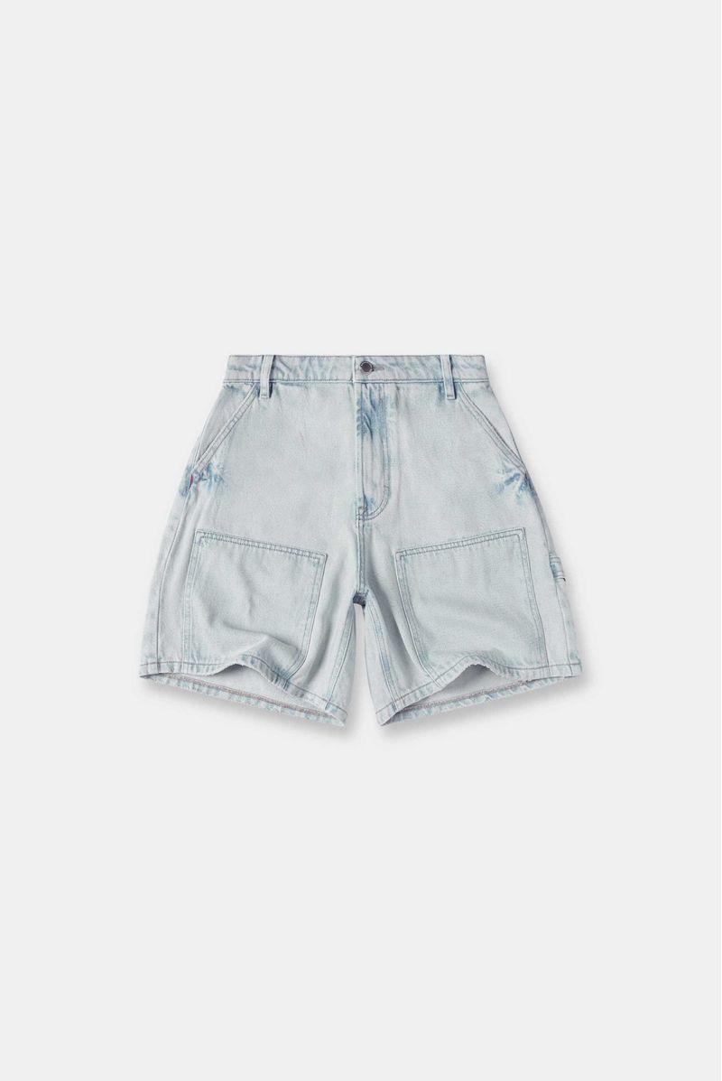 Loose shorts azul claro, tiro alto, confeccionado en denim 50% algodón 50% lyocell, de 12 oz. Diseñado con éstetica carpintero, parches y bolsillos en leve contraste, garra roja en pretina y detalle bordado en bolsillo derecho posterior.