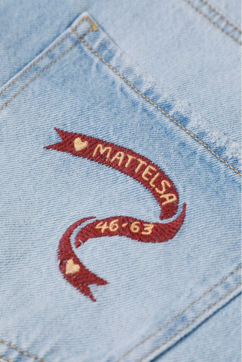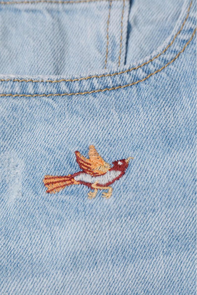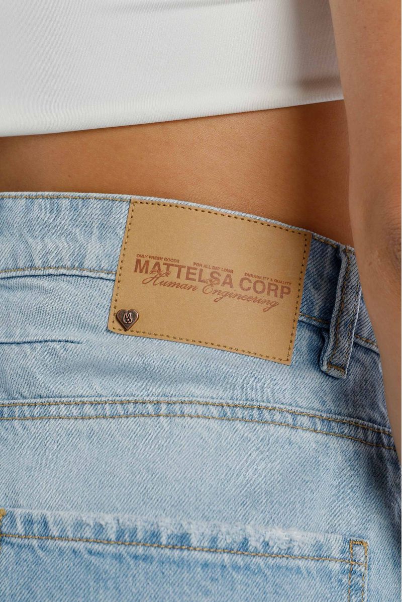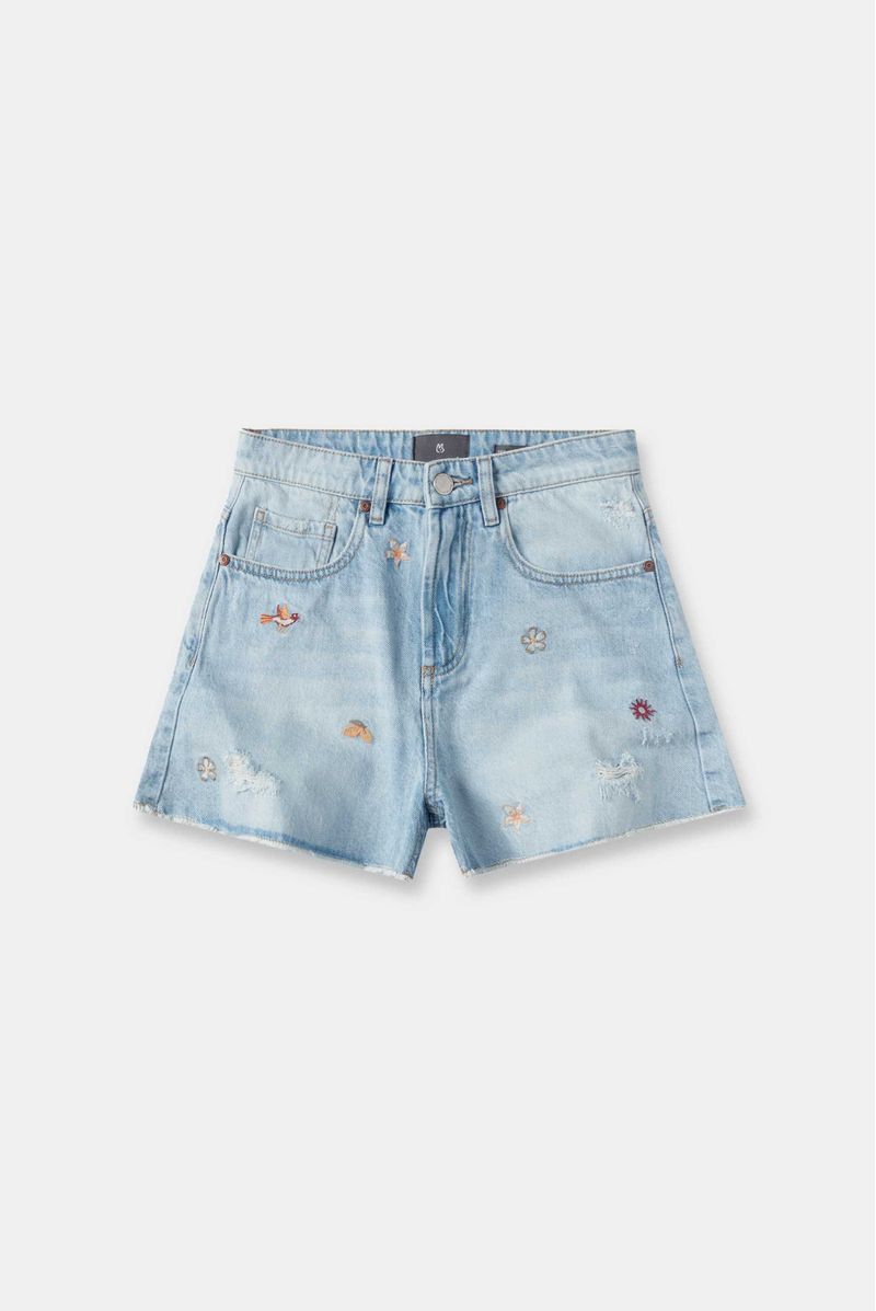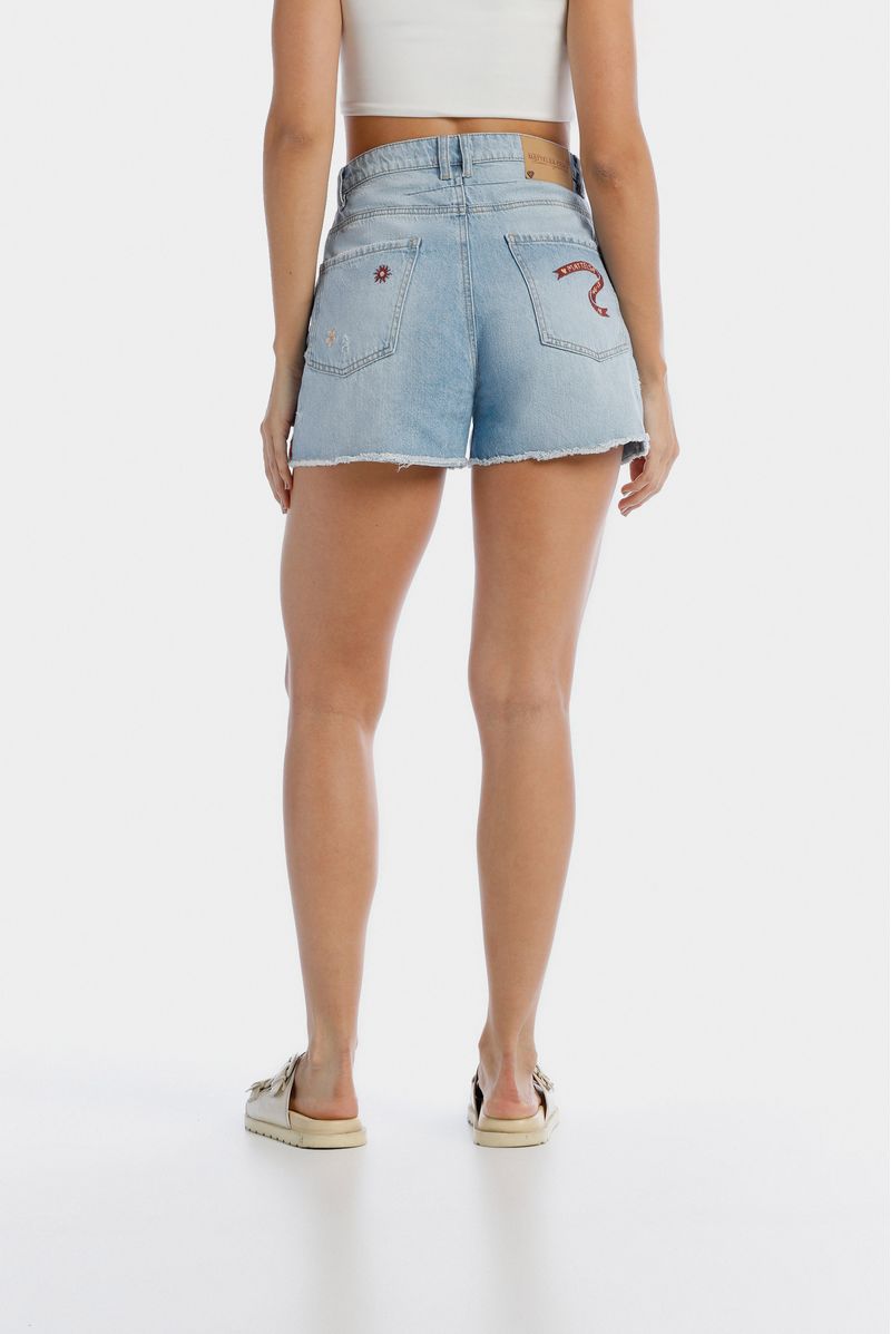 Short mini, azul claro, tiro alto, confeccionado en denim 100% algodón premium, 11 oz. Diseñado con estética cinco bolsillos, ruedo al corte y minibordados en delantero y posterior.