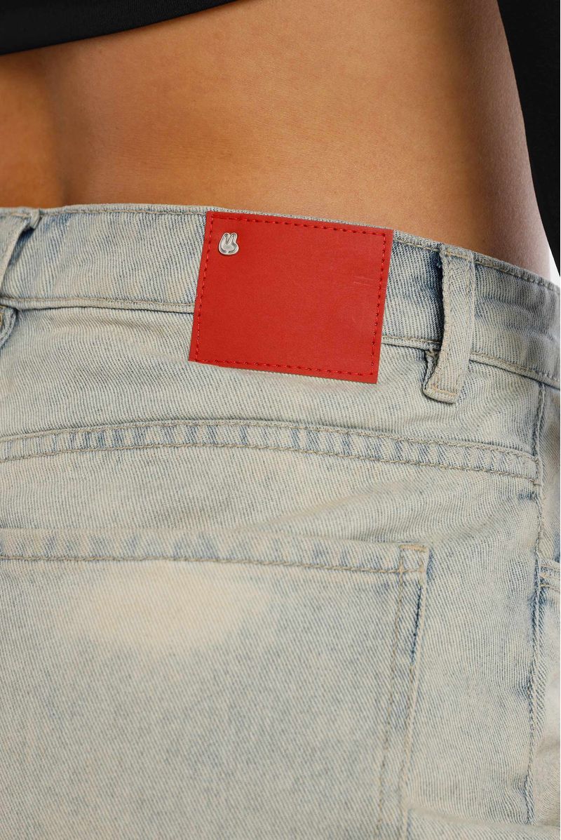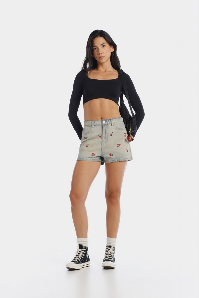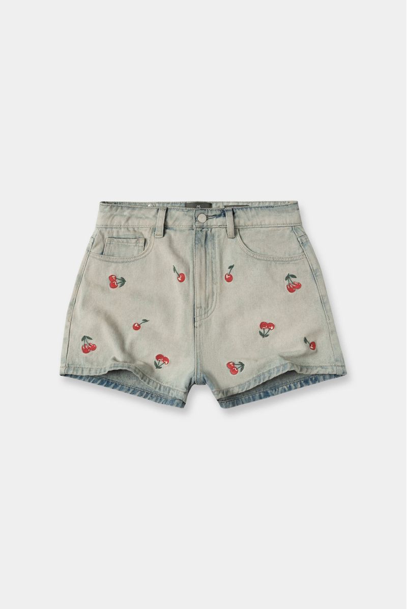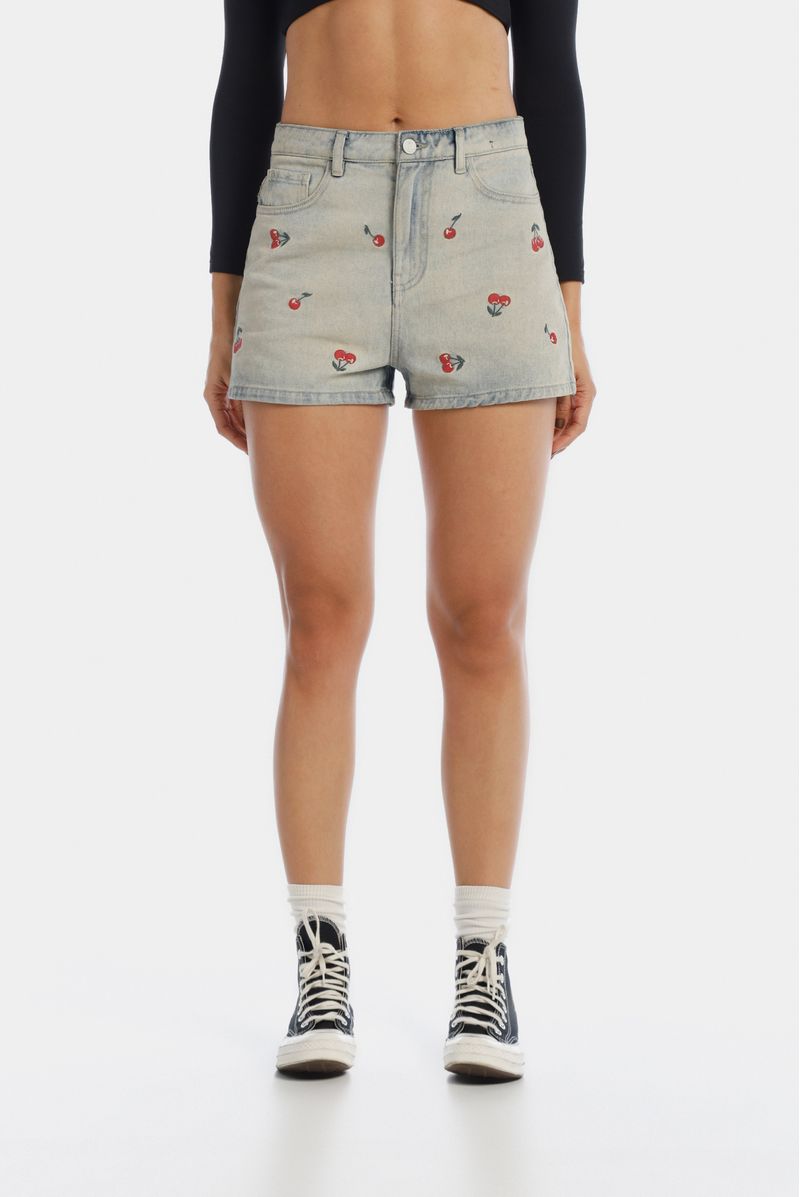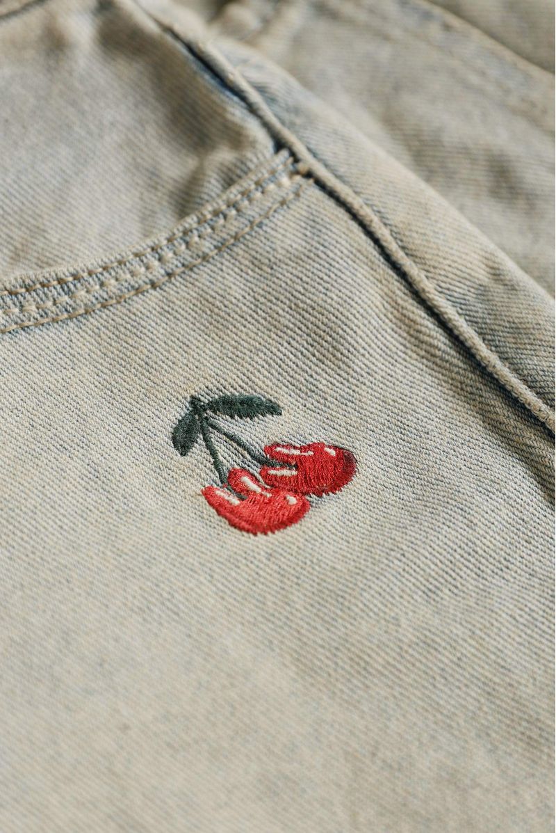 Mini short confeccionado en drill premium con un peso de 11,6oz. Diseñado con bordados de cerezas en delantero, estética cinco bolsillos. Lleva insumos contramarcados.