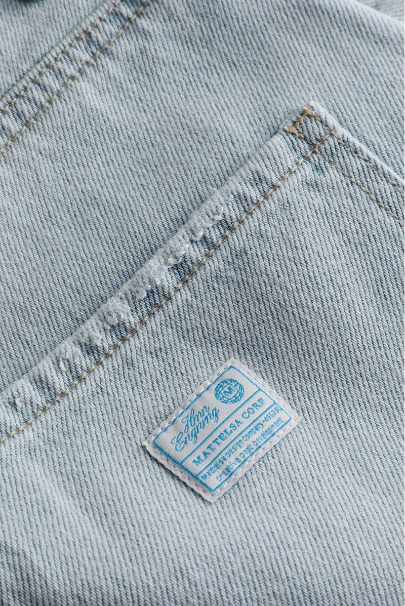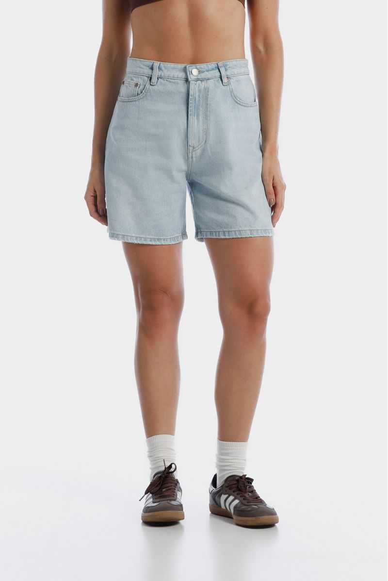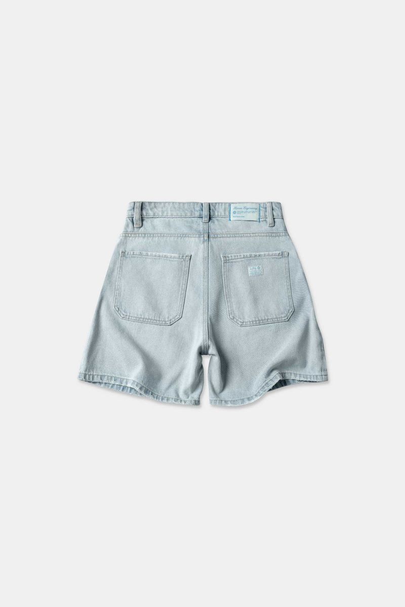 Short loose en lavandería azul hielo, tiro alto, confeccionado en tela premium 50% algodón y 50% lyocell de 12 oz. Diseñado con estética cinco bolsillos, insumos en cobre viejo, y banderines contramarcados.