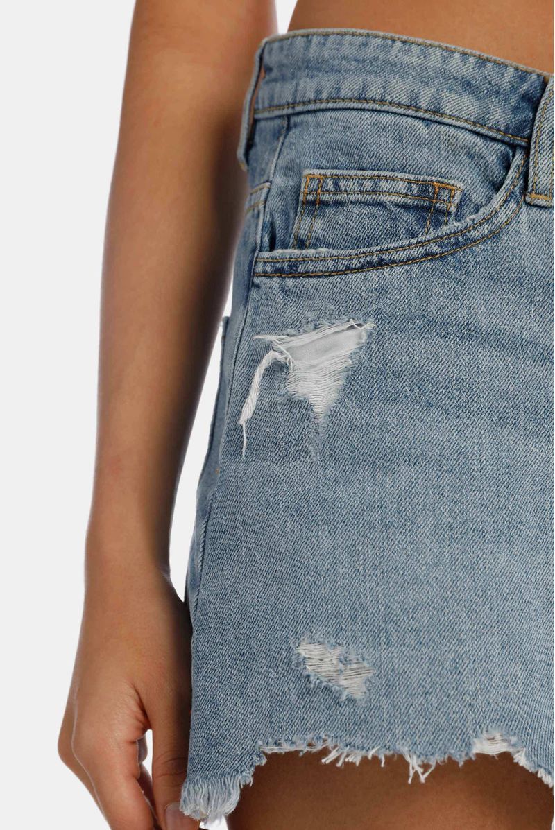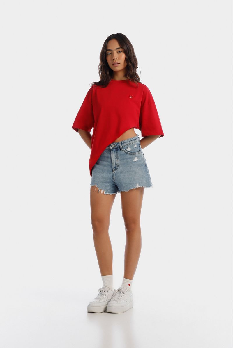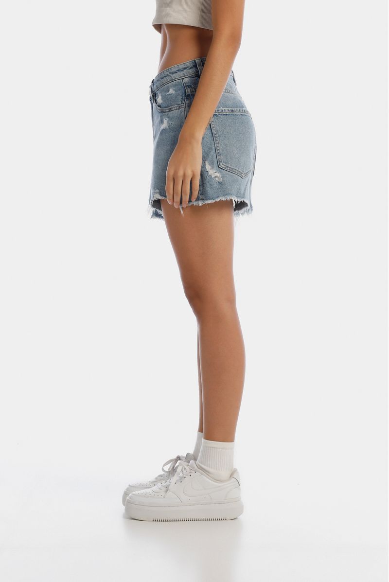 Short confeccionado en denim de 11,2 oz, diseñado con destroyeds y desflecos en ruedo, manualidades en bolsillos, iluminaciones en delantero y posterior. Lleva insumos contramarcados y banderín tejido en pretina posterior.