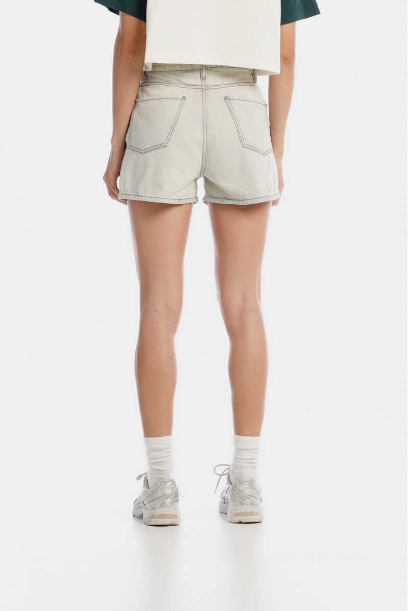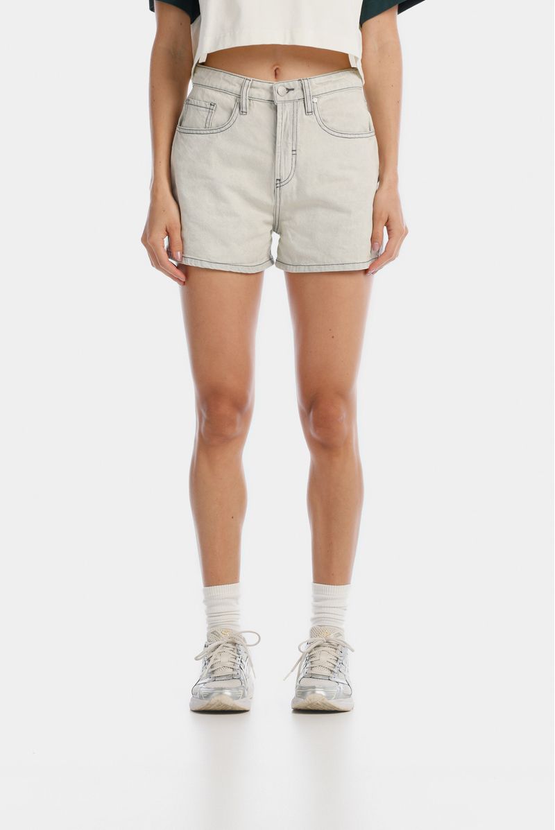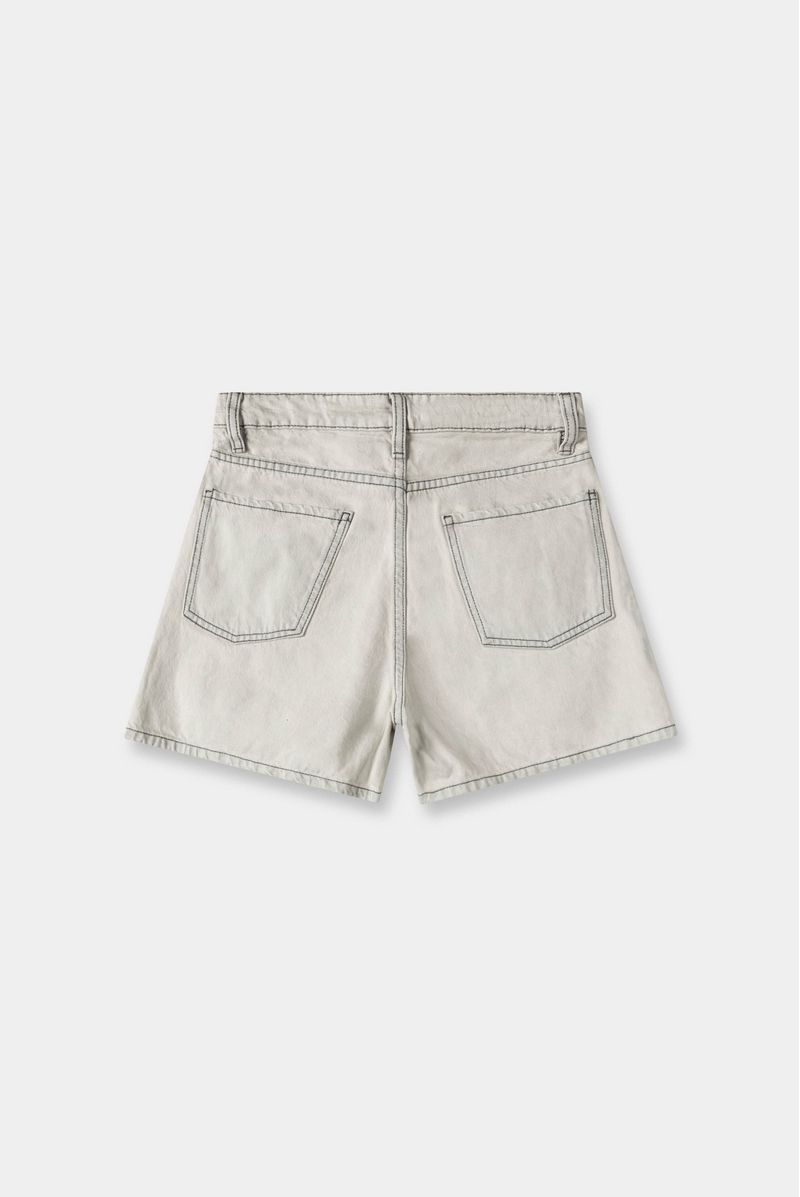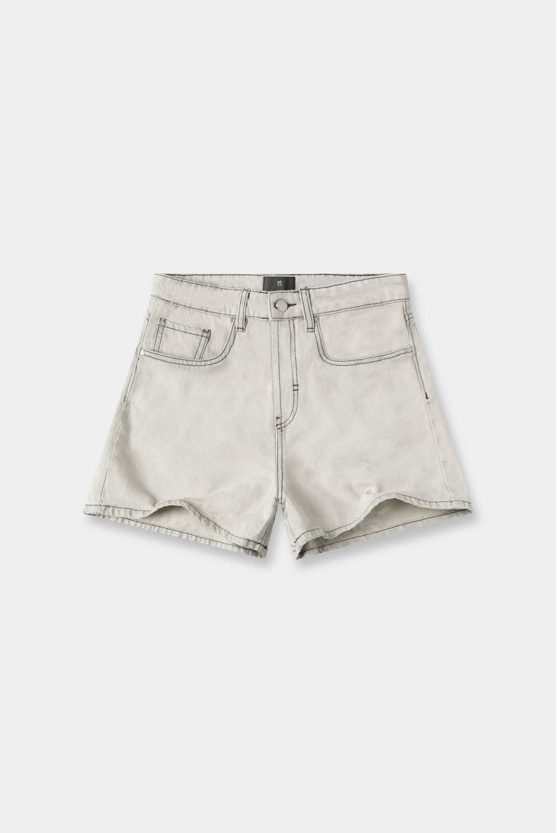 Shorts mini, tiro alto, en black denim con lavandería gris, confeccionado en black denim 100% algodón premium, 10 oz. Diseñado con éstetica cinco bolsillos, básico, e hilo en contraste.