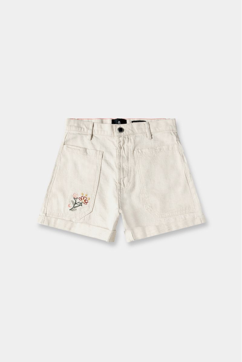 Shorts fit regular tiro alto, marfil, confeccionado en tela 91% algodón 9%lino, 10 oz. Diseñado con bolsillos parche en delantero y posterior, guardapolvo en botas. Lleva insumos contramarcados y bordados localizados.