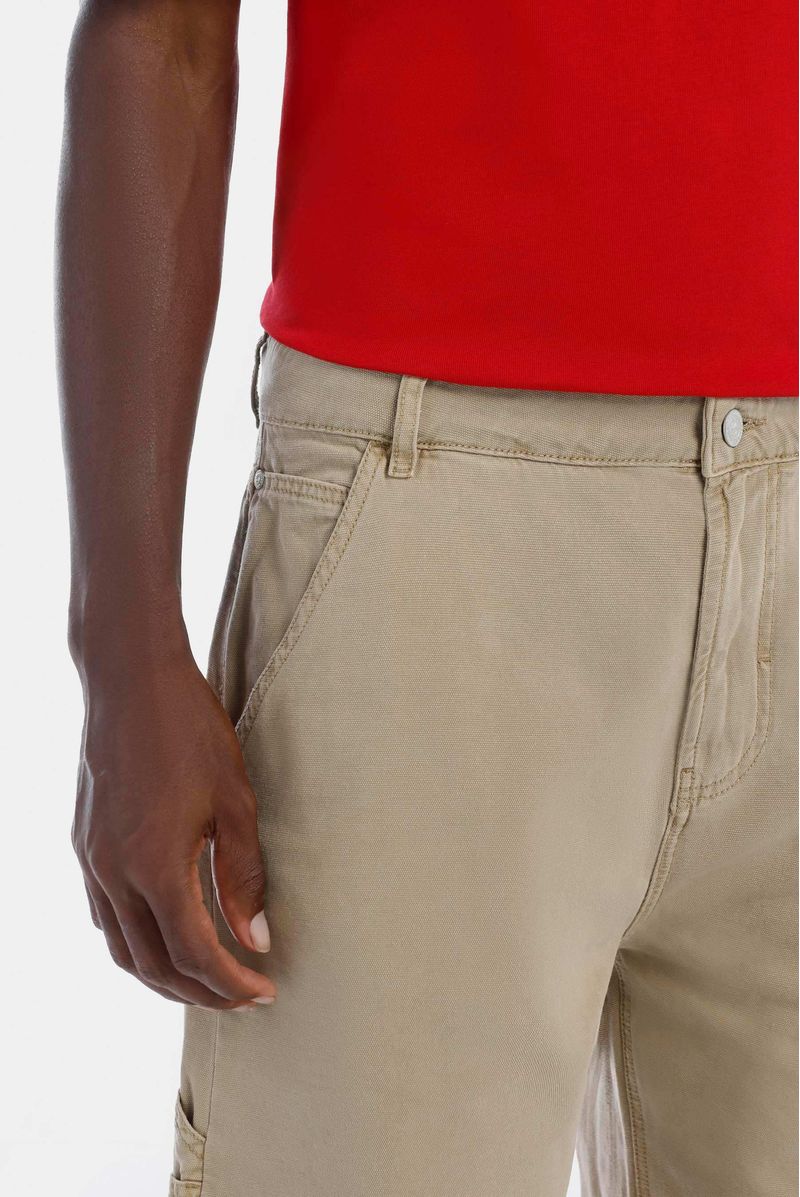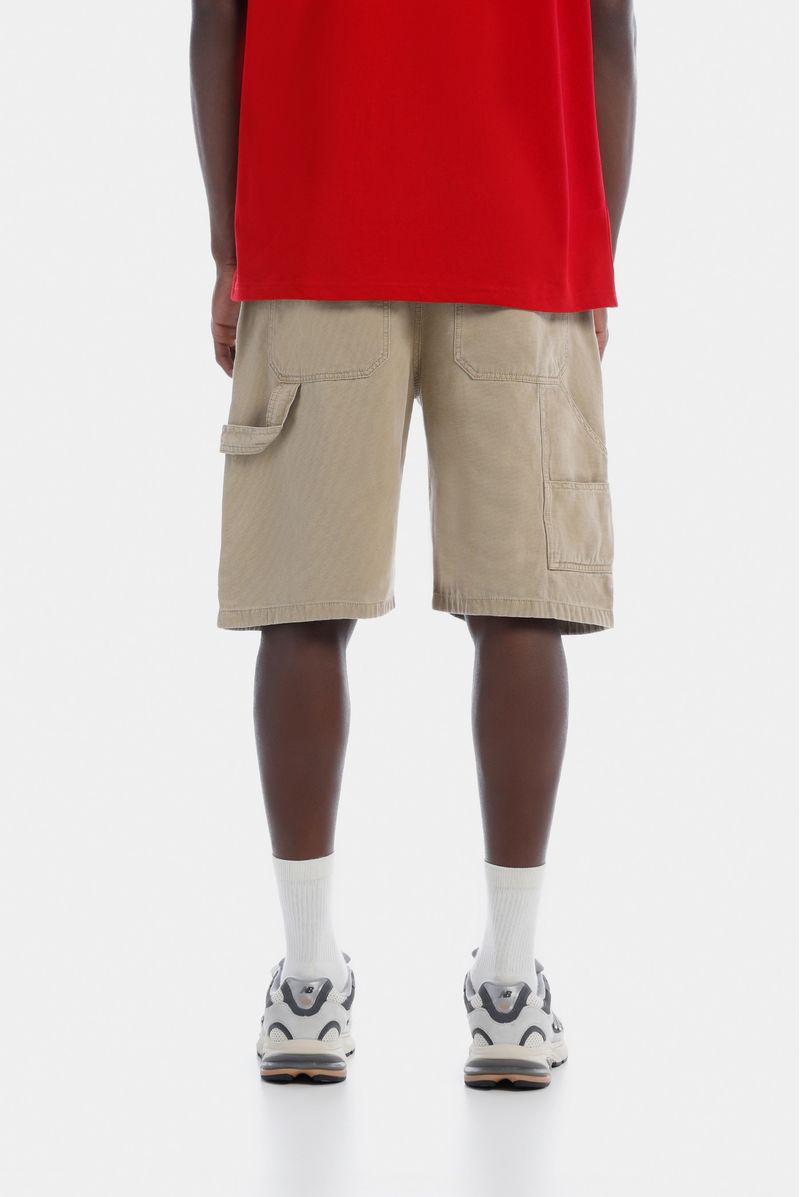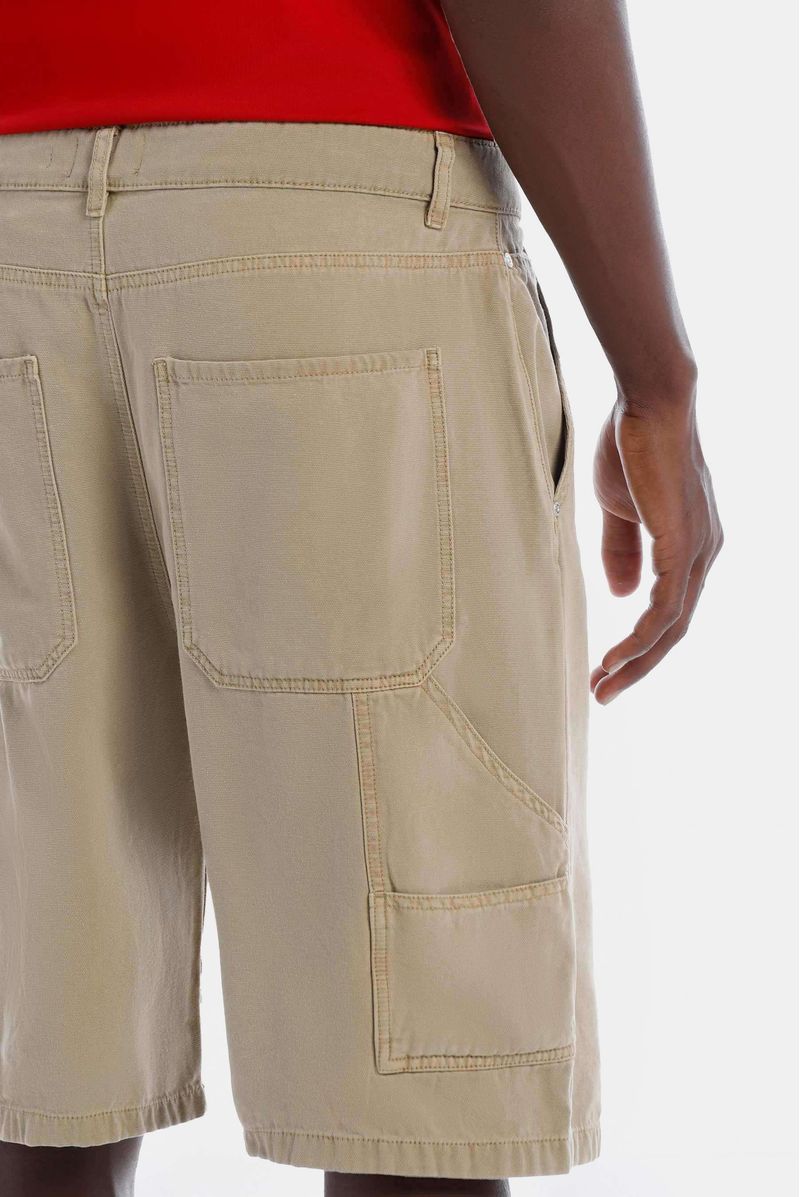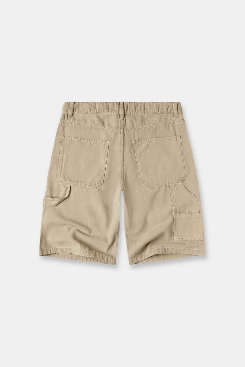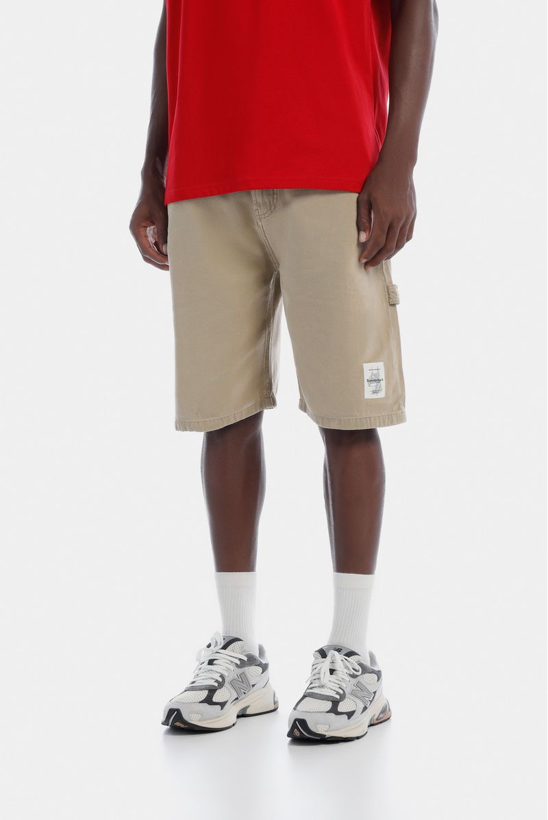 Shorts rectos beige, confeccionados en drill 100% algodón premium, de 7,9oz. Diselado con estética carpintero, trabilla que va de costado a bolsillo posterior, bolsillos diagonales en delantero y detalle bordado en bolsillo posterio derecho.