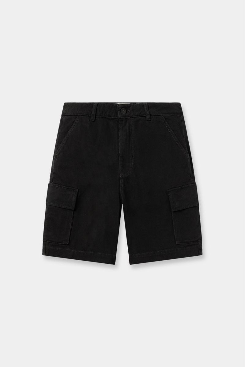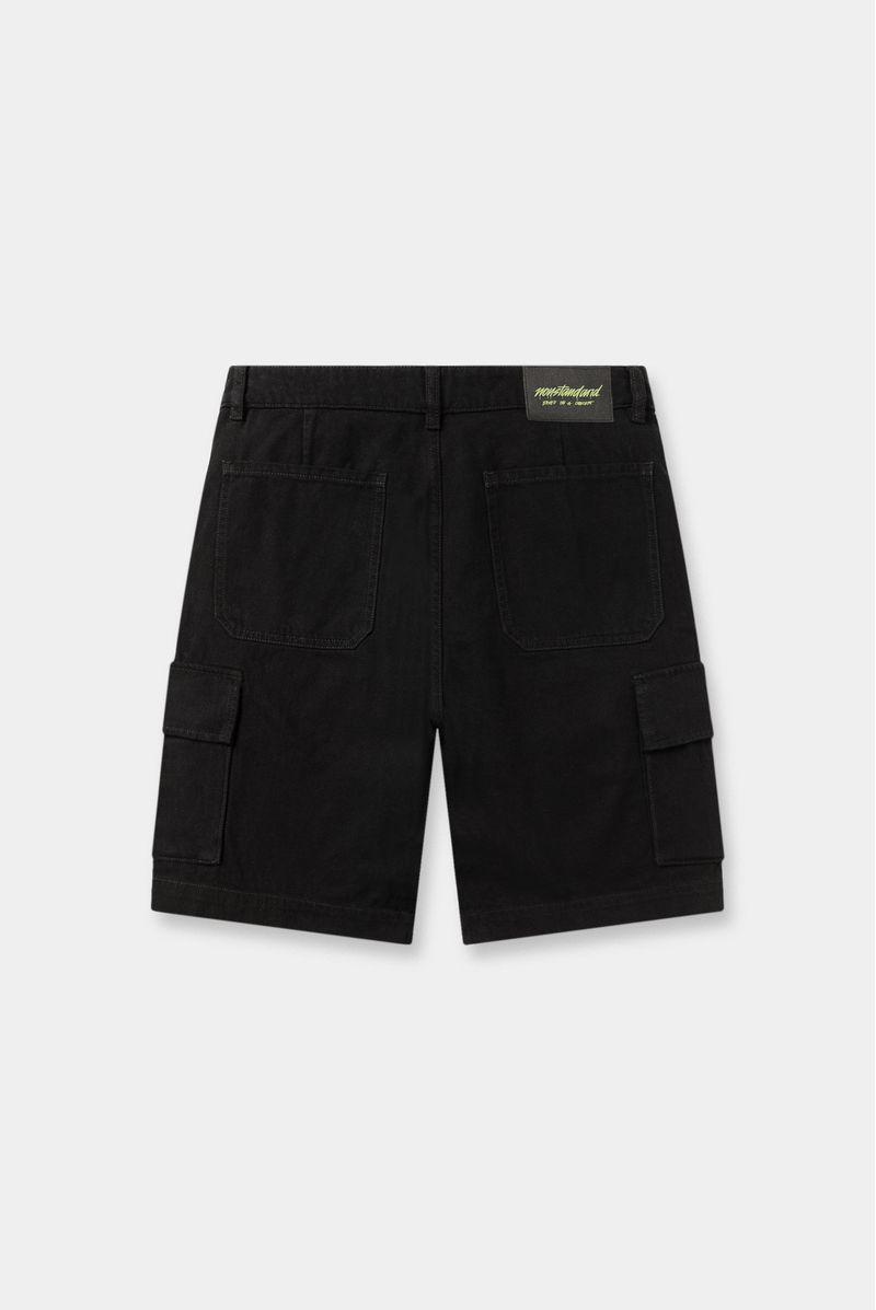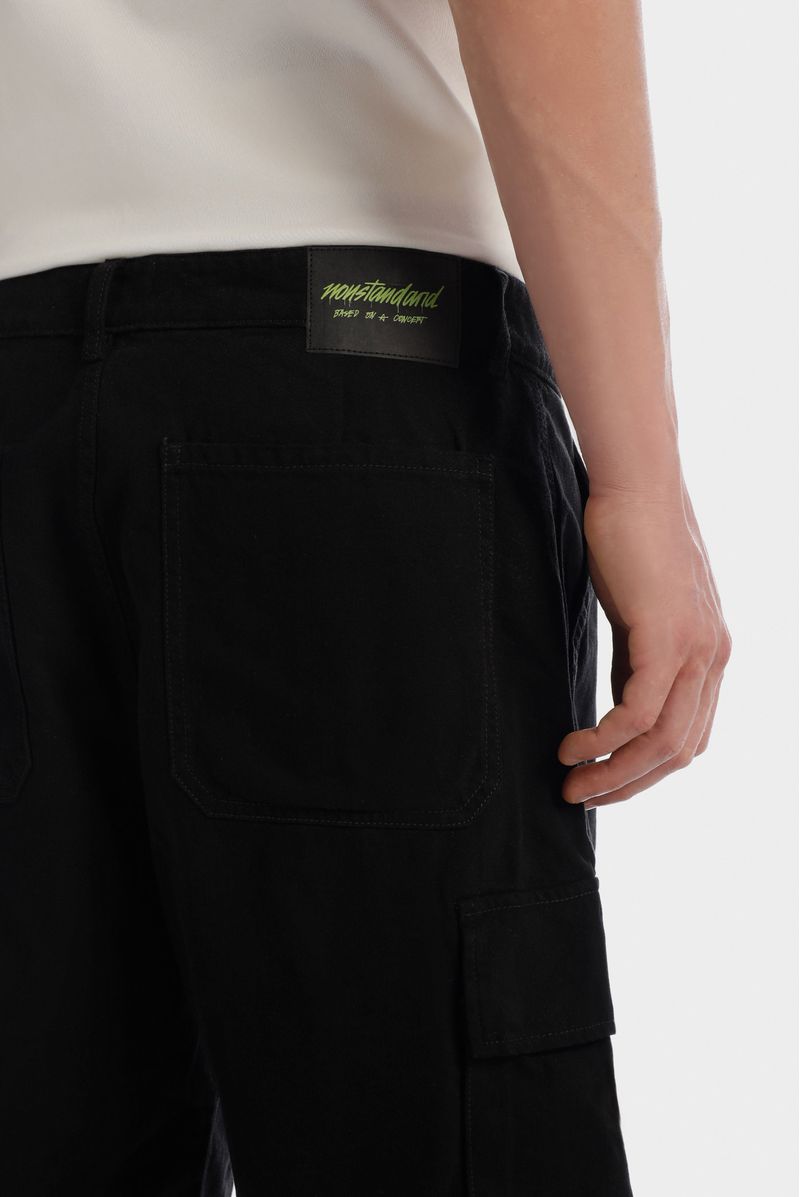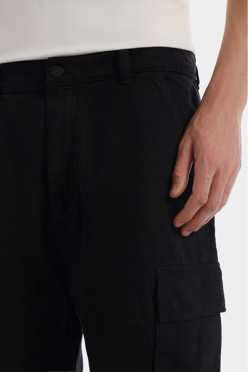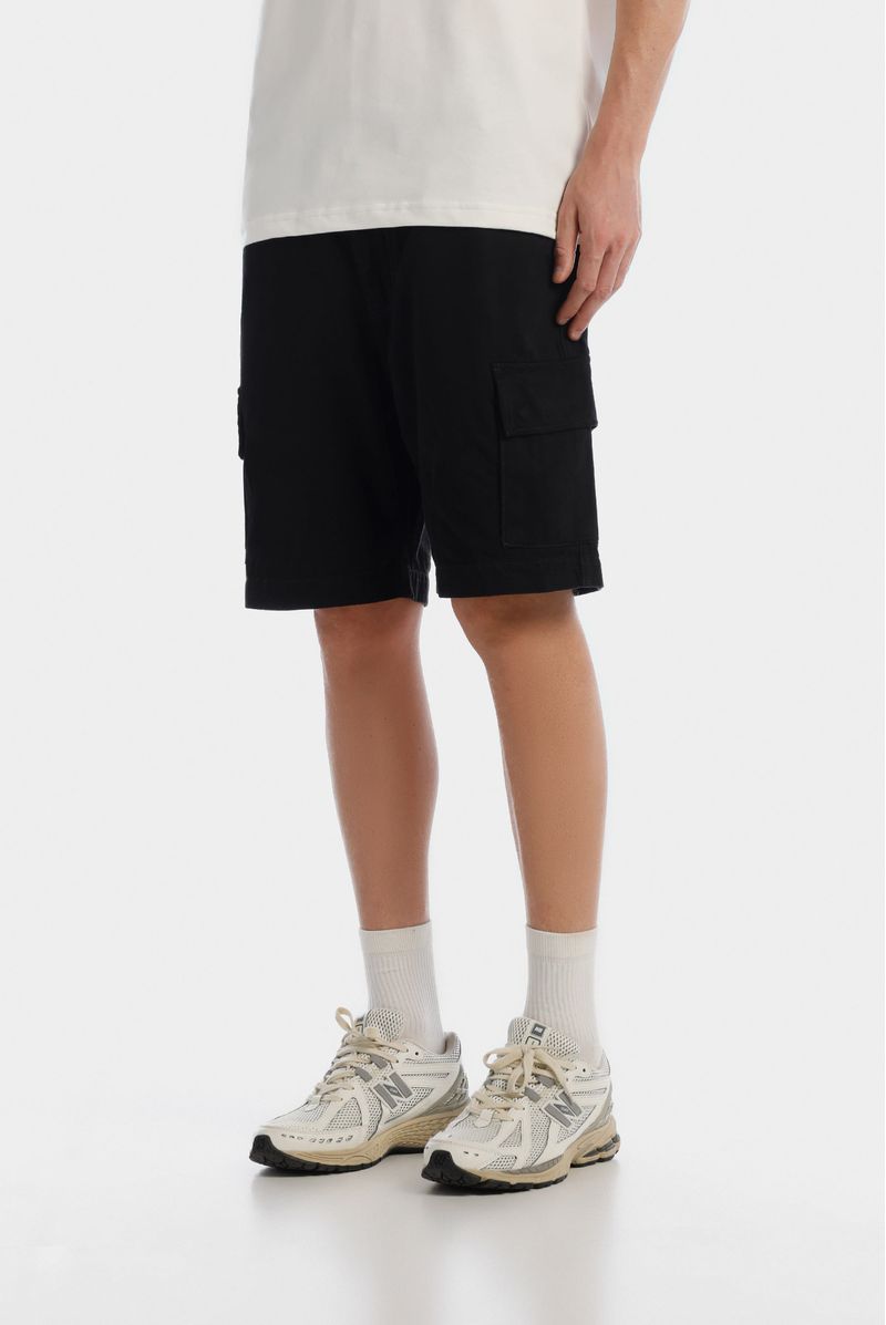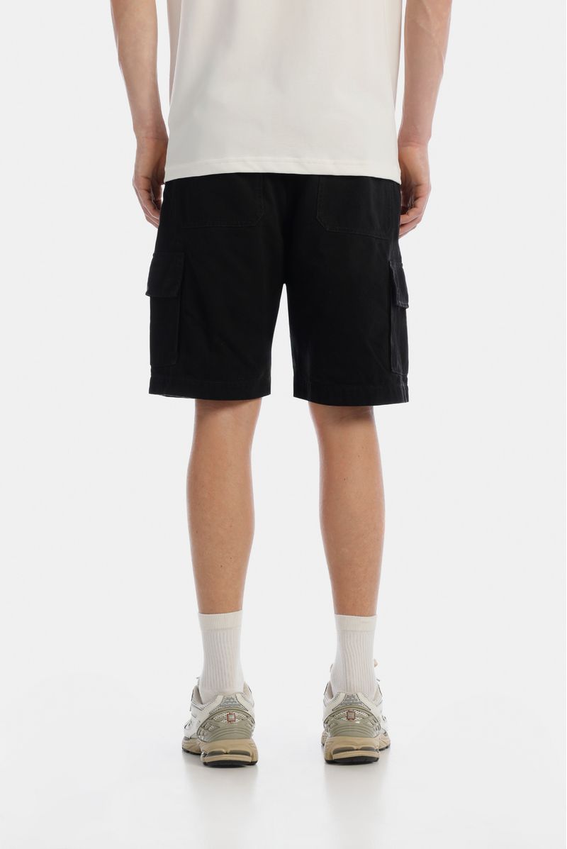 Short negro, confeccionado en Dril 100%Algodón de 10oz, Diseñado con bolsillos frontales semicurvos y laterales tipo cargo con tapa y broches, detalle de garra contraste en pretina posterior.