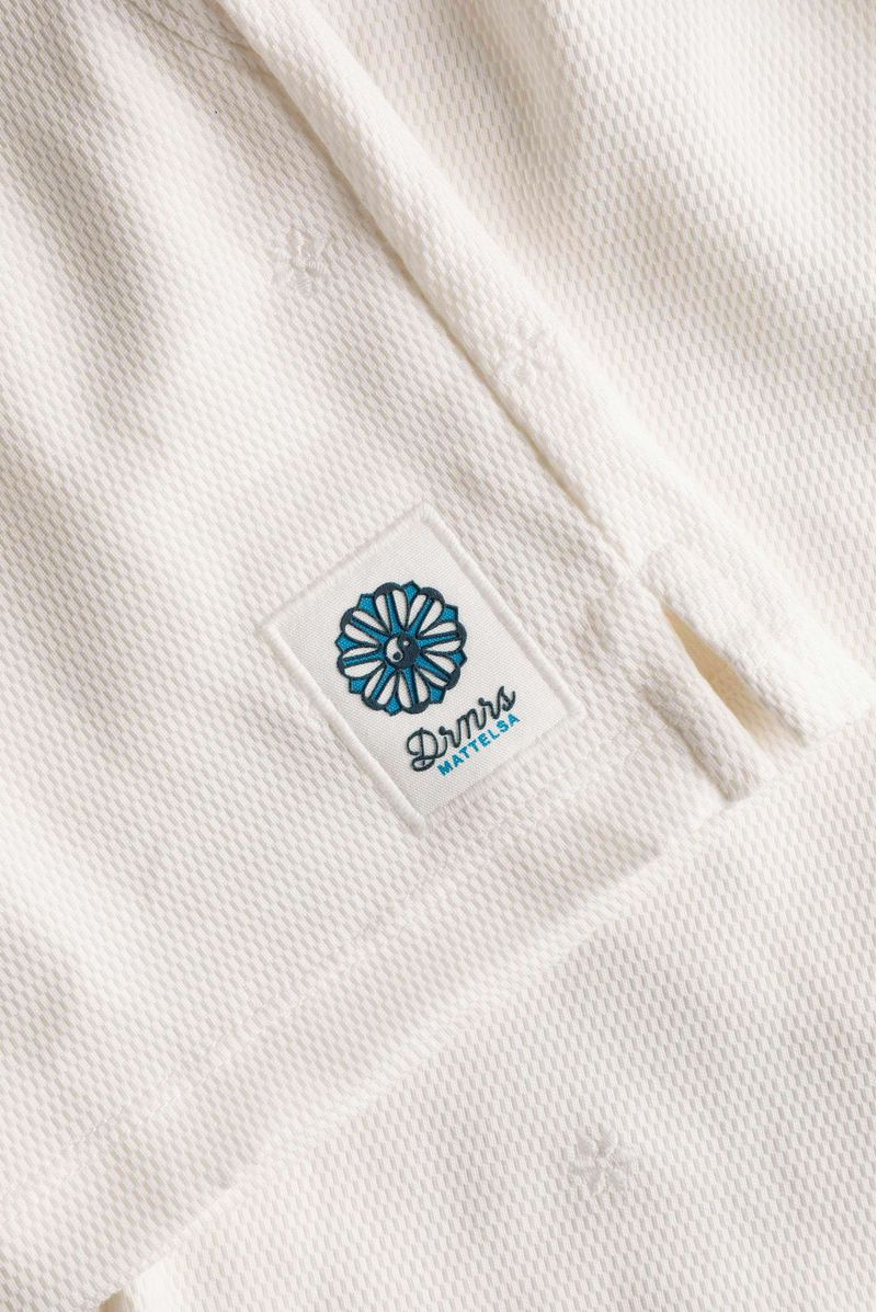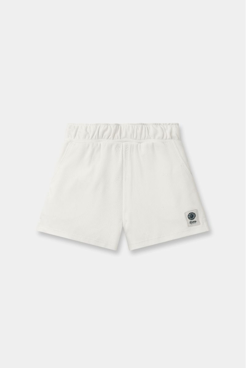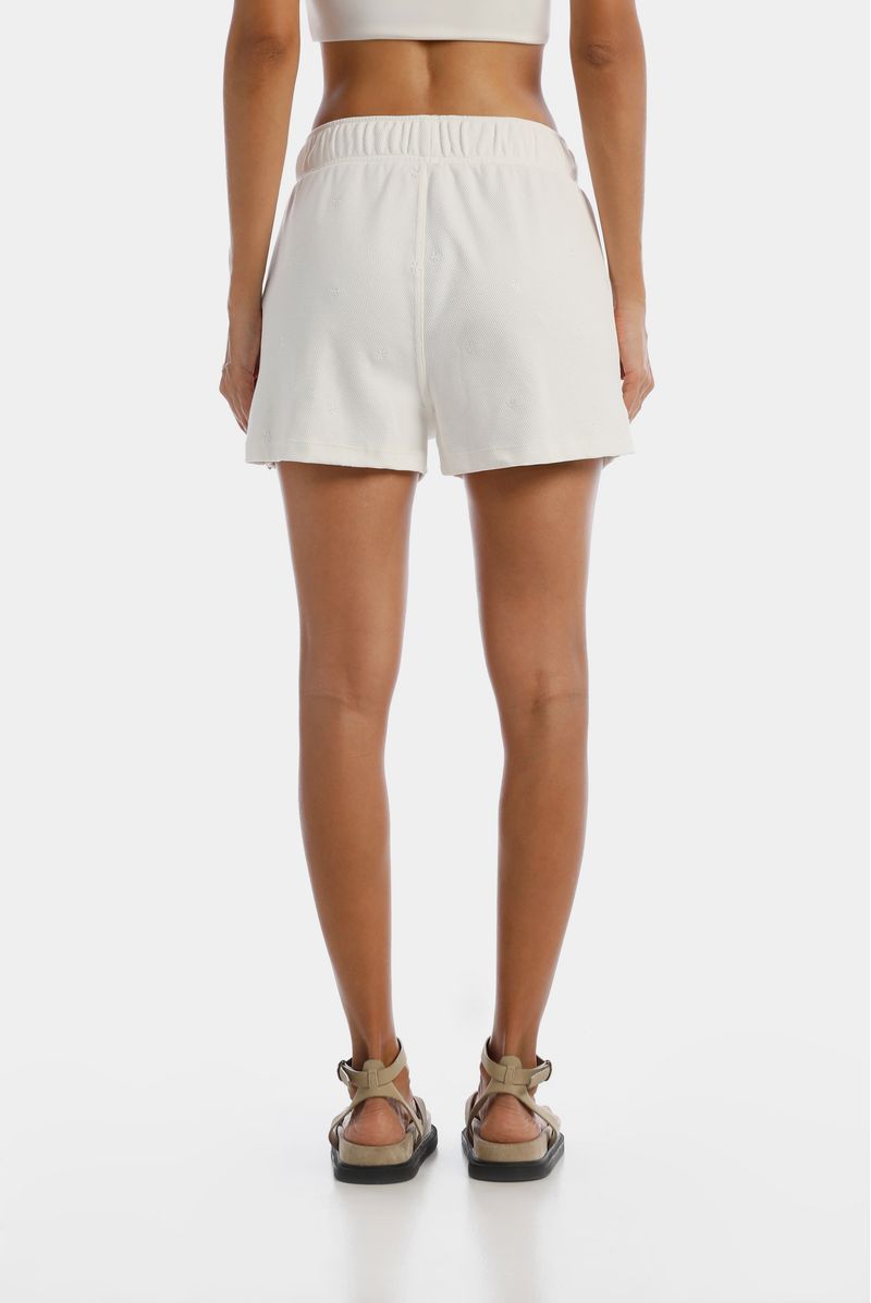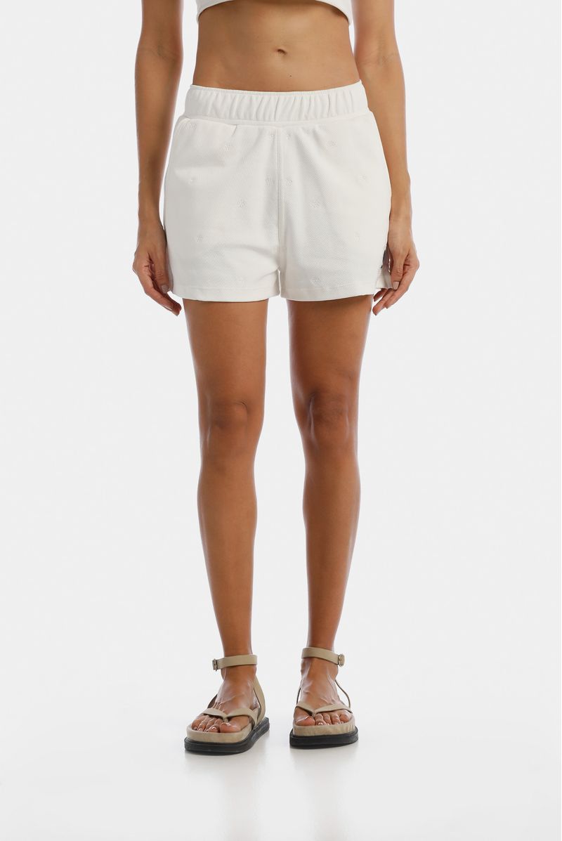 Short marfil confeccionado en una tela microperforada premium de 320 gramos. Bordado de flores a tono con la base en fondeo en toda la prenda. Insumo tipo aplique bordado sobre pierna izquierda. El insumo es estampado