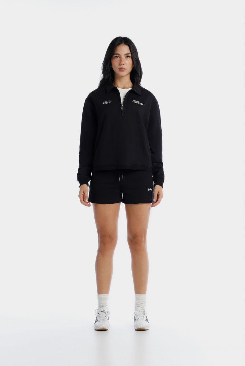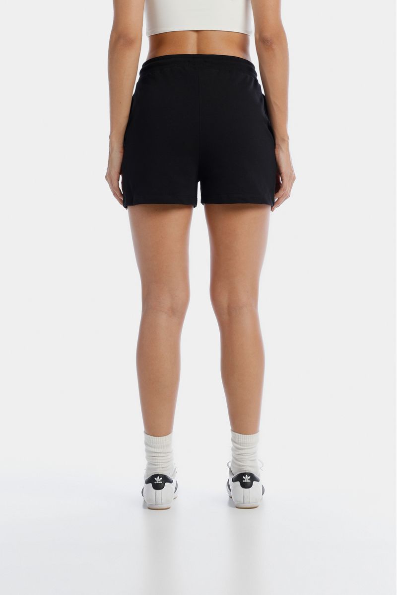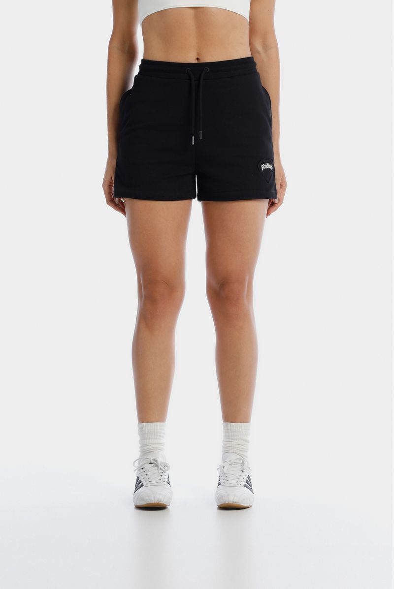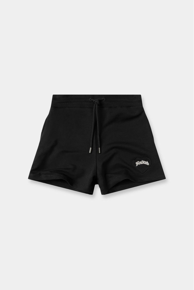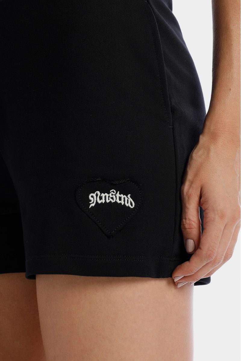 Short negro confeccionado en una burda de 305gr. Lleva aplique bordado en forma de corazón negro. Adicional lleva cordón con puntera metálica contramarcada.