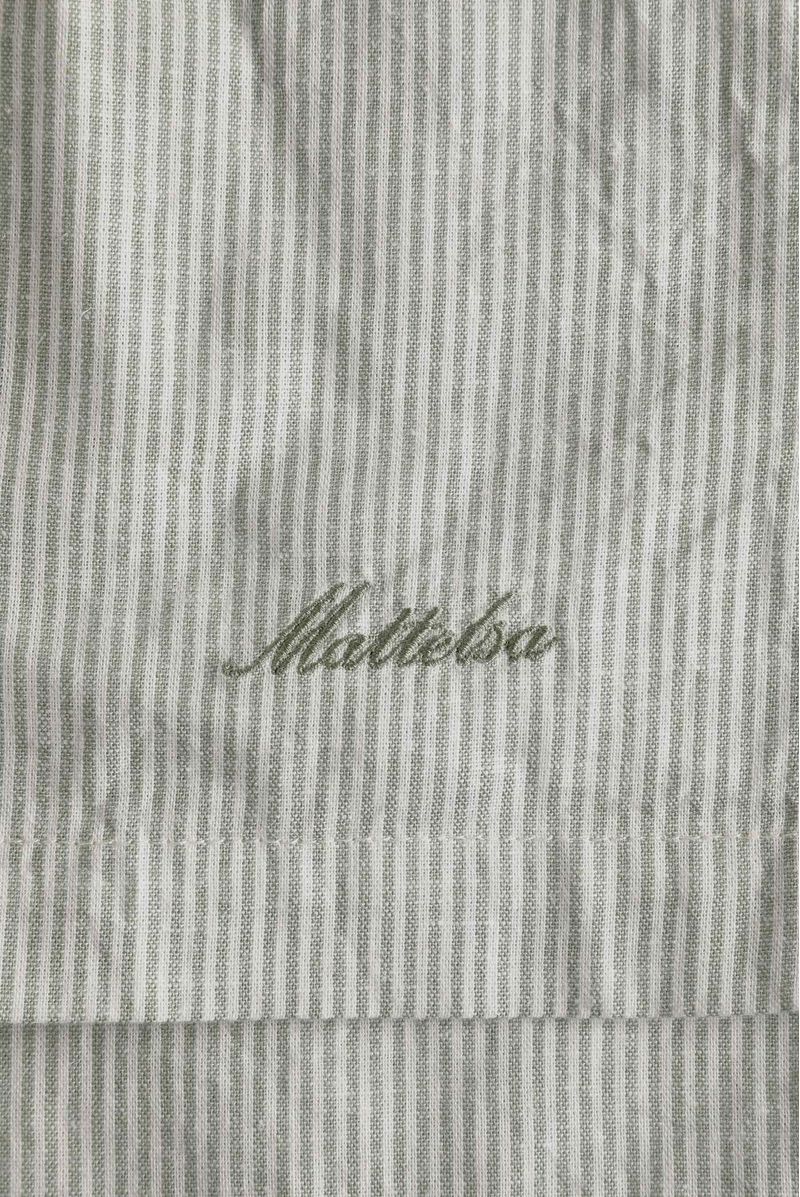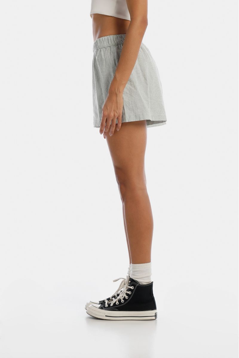 Short de rayas confeccionado en un tejido plano de 150 gramos. El fit es amplio. Pretina con elástico interno. Texto Mattelsa bordado sobre pierna izquierda en el delantero. Banderín sobre pierna derecha.
