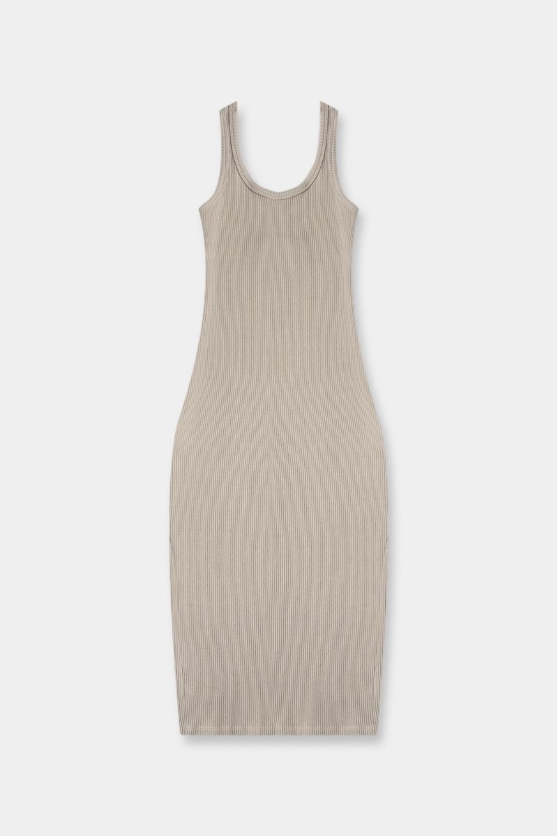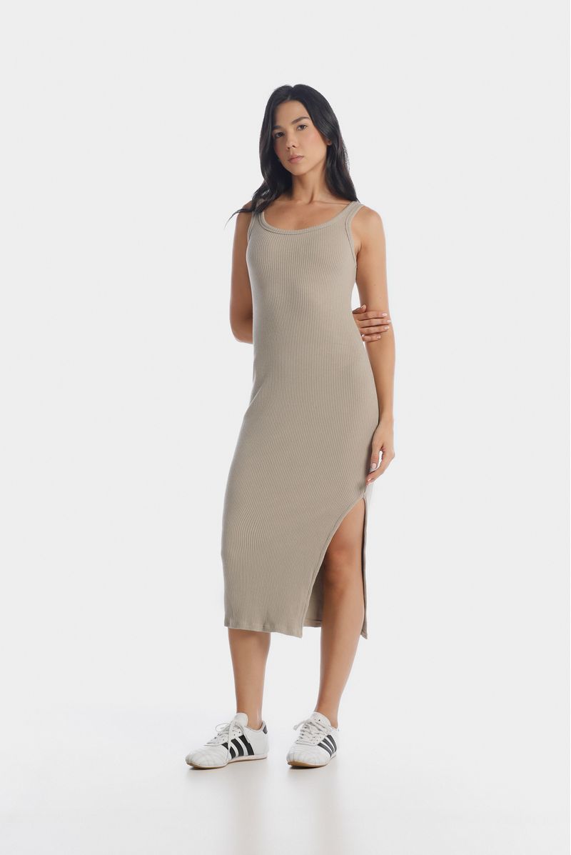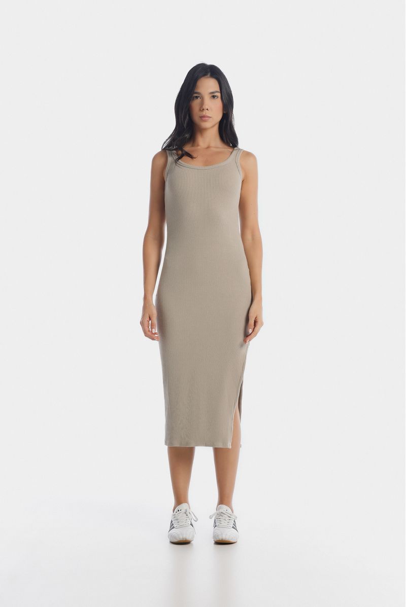 Vestido midi confeccionado en un rib con elastano de 320 gramos. Abertura en costado izquierdo. Fit ajustado.