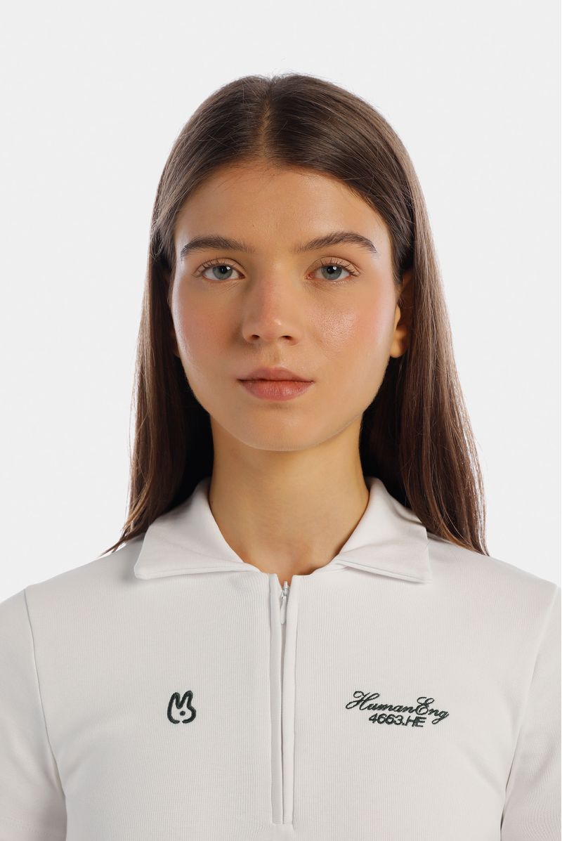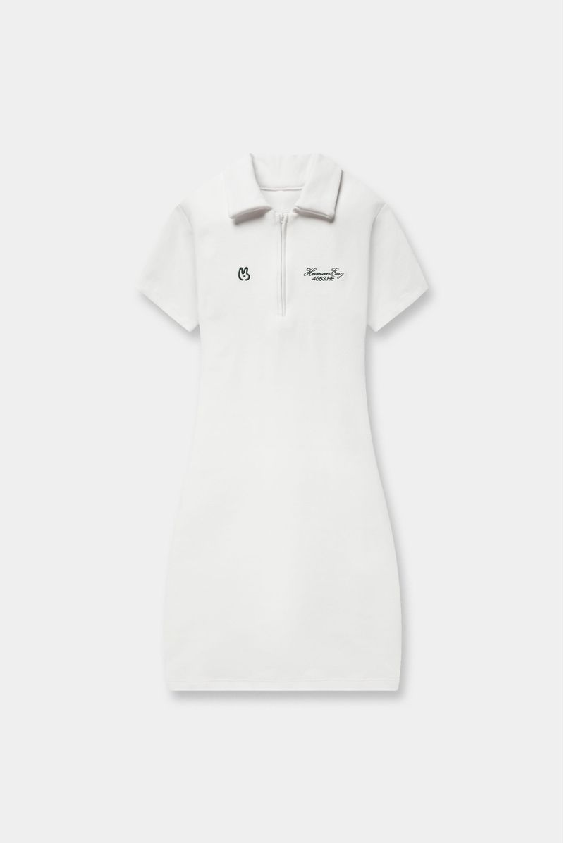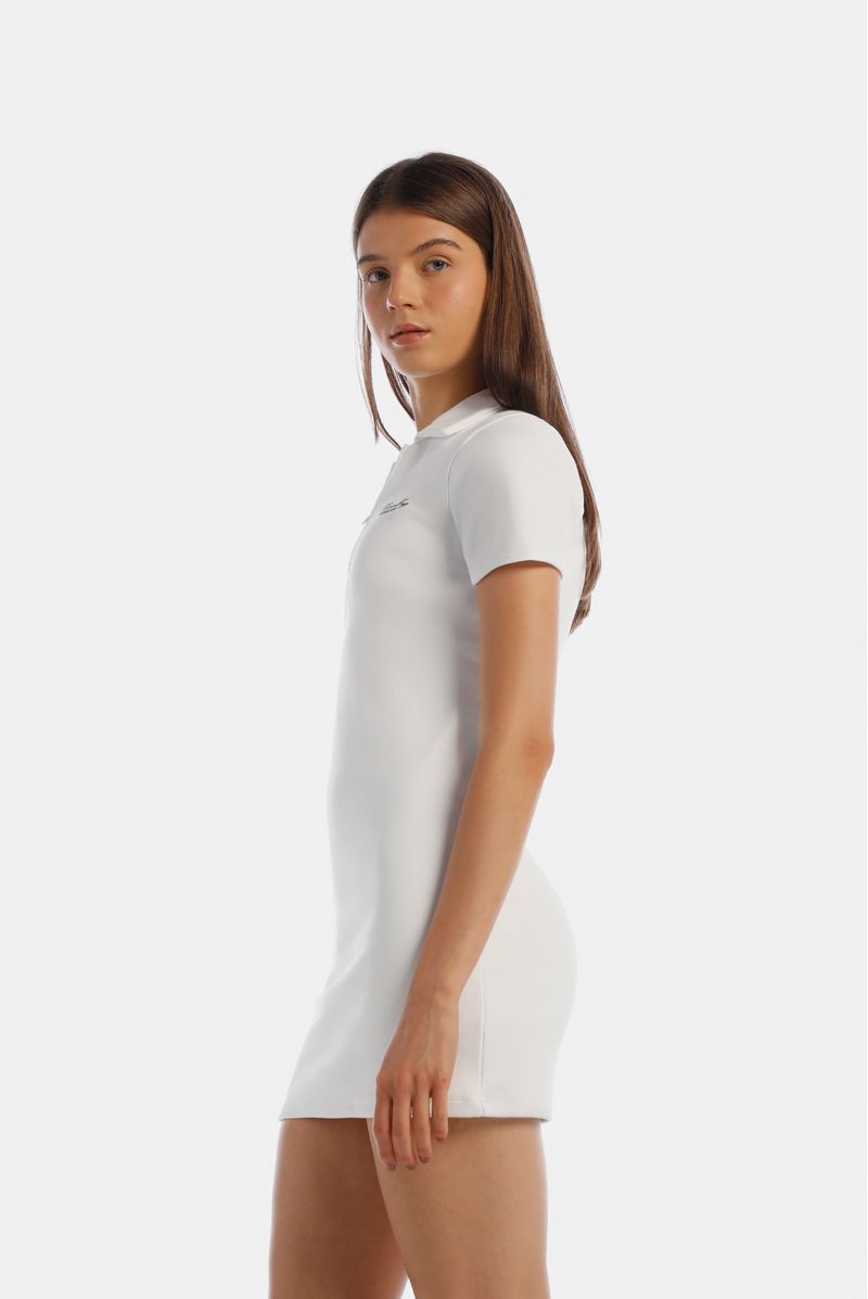 Vestido tipo polo confeccionado en un rib de alto gramaje de 394 gramos. Cierre invisible en escote. Aplique y textos en delantero bordados en color negro. Toda la prenda es doble.