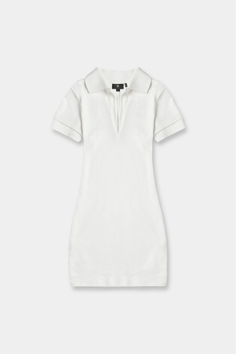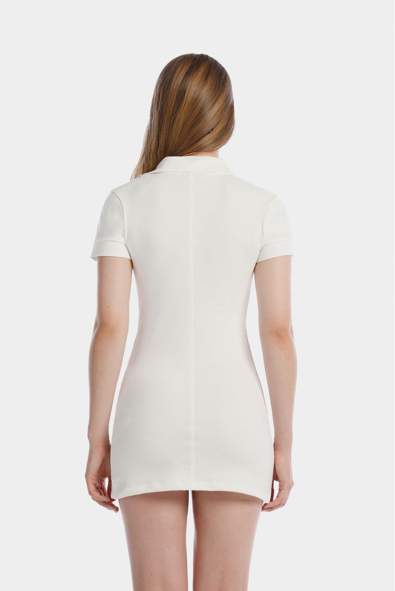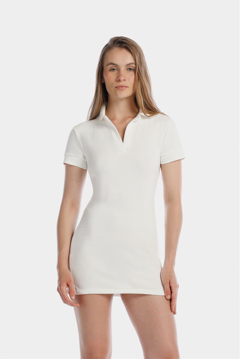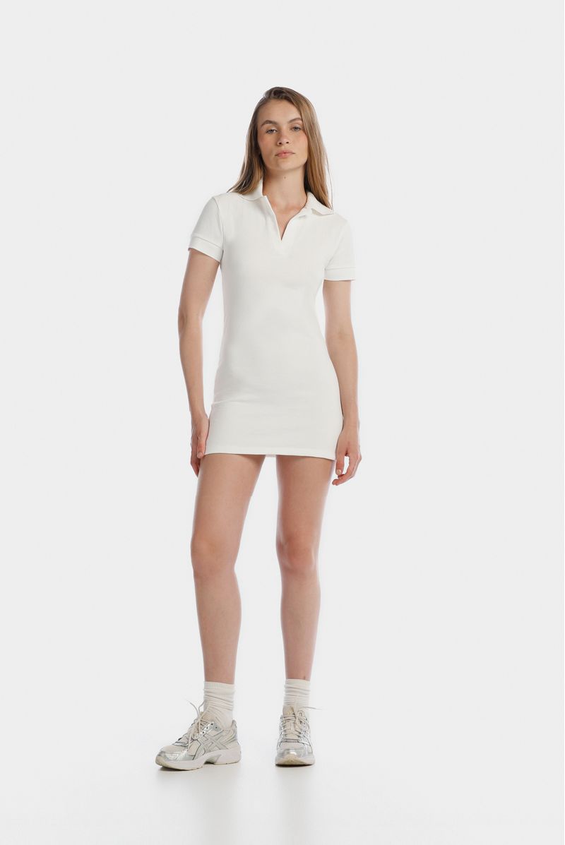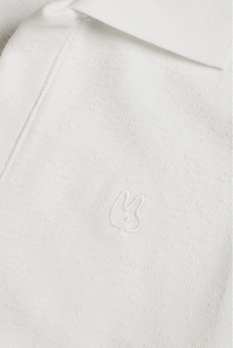 Vestido marfíl tipo polo de largo regular confeccionado en un terry con efecto towell de 240 gramos. Cuello y puños tejidos. Perilla en V. Icono del conejo bordado en punto corazón.
