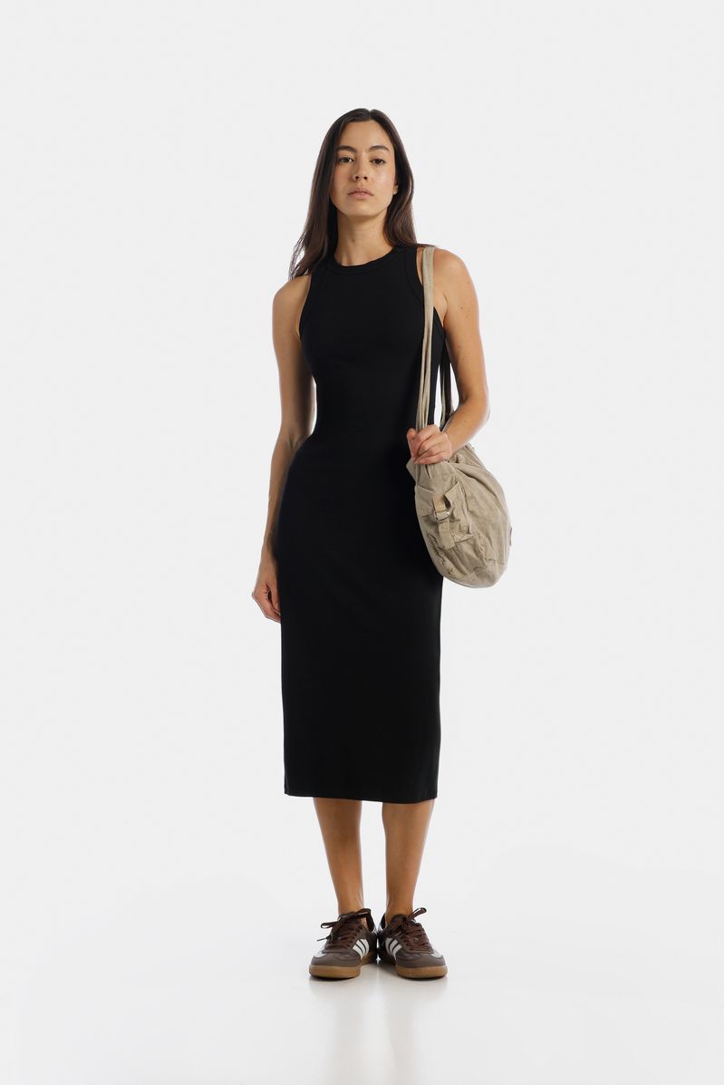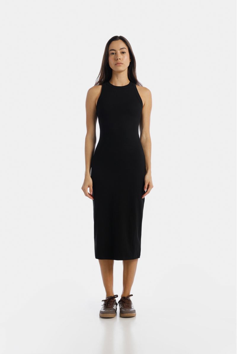 Vestido midi negro confeccionado en un rib 2x2 de 280 gramos. La silueta es ajustada y lleva un aplique conejo en contraste bordado en el posterior de la prenda.