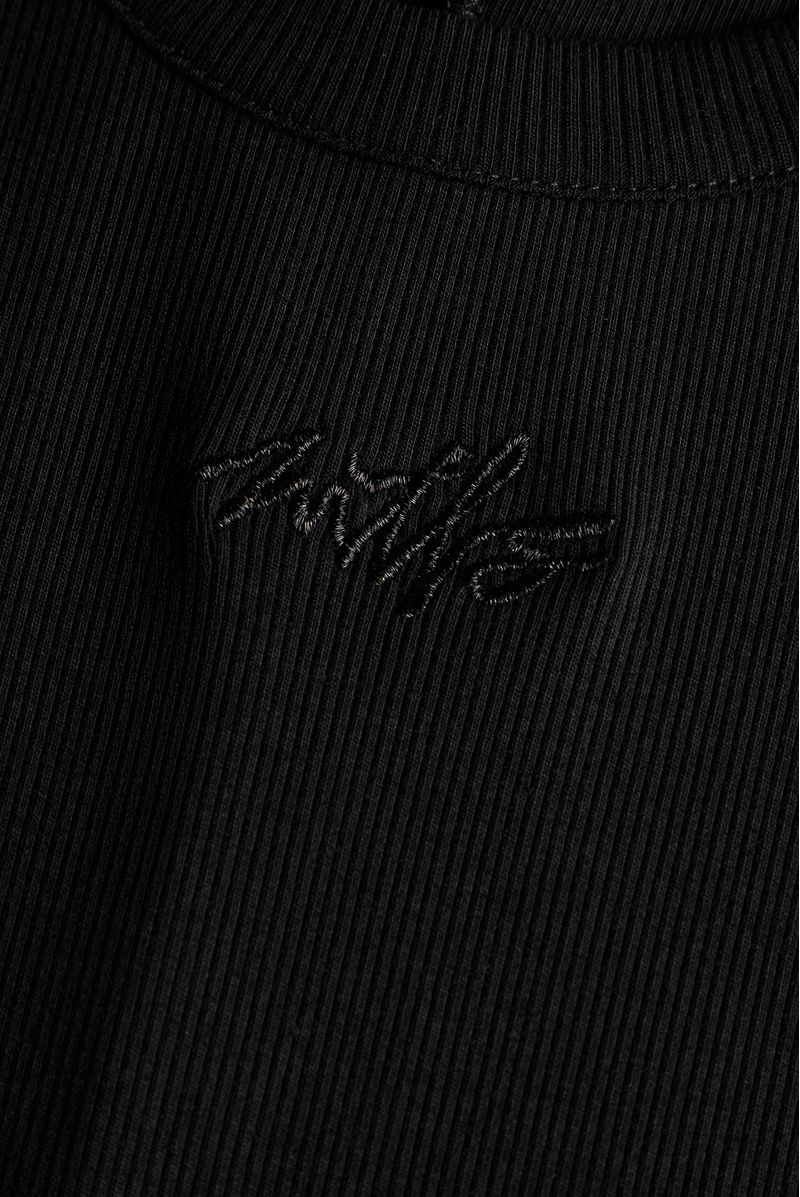 Vestido manga corta semiajustado negro, confeccionado en un Rib 2x2 con elastano de 280gr. lleva bordado en el centro delantero.