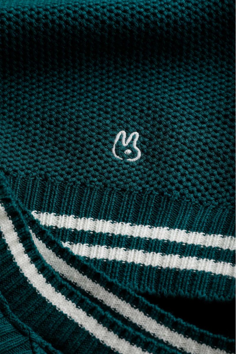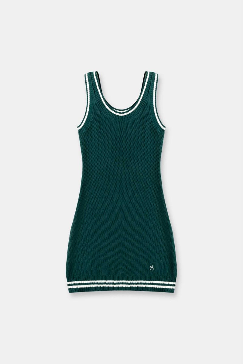Vestido semiajustado confeccionado en un tejido verde de xxx gramos. Lleva rayas en contraste color marfil en escote y ruedo. Tiene conejo bordado en ruedo color marfil.